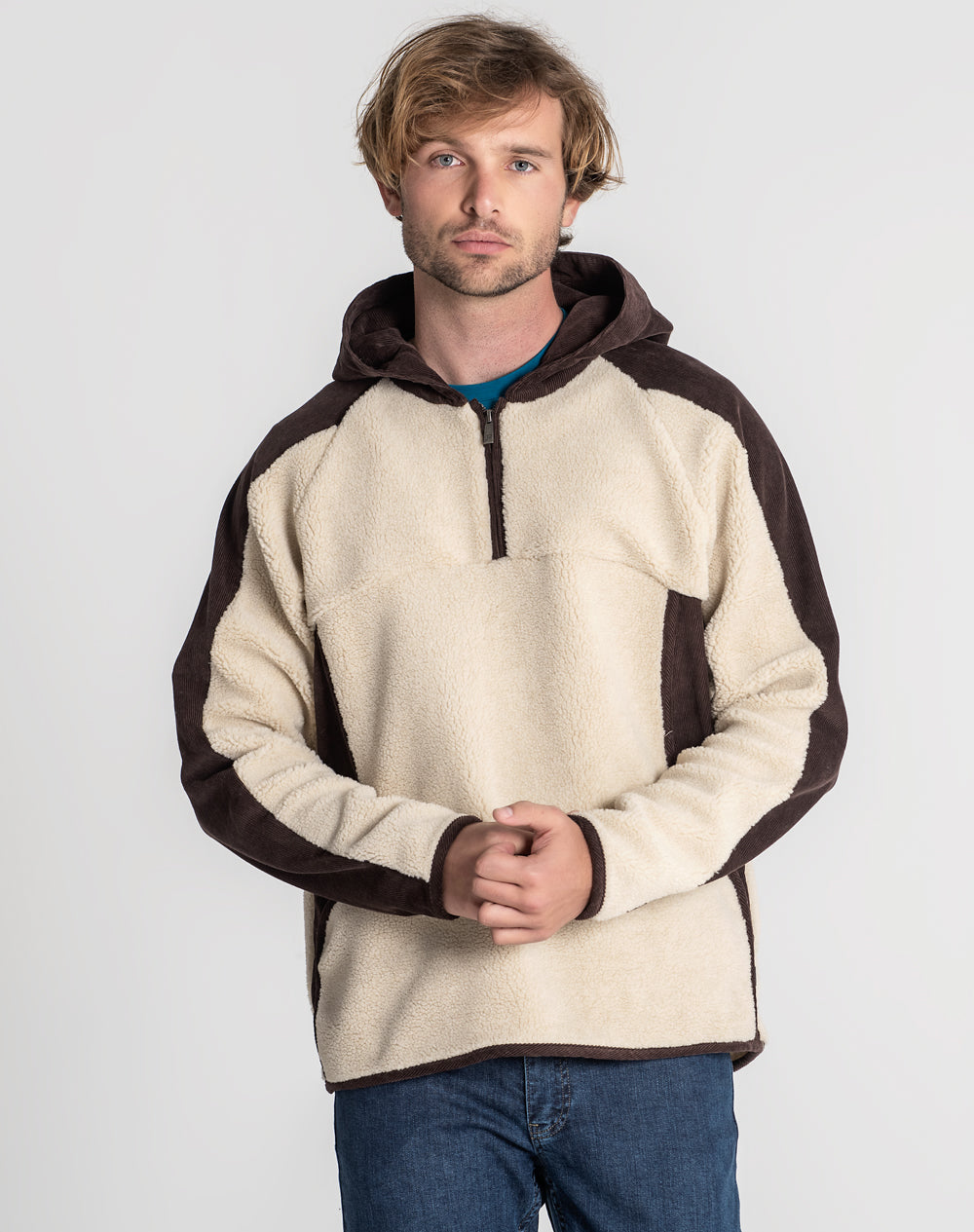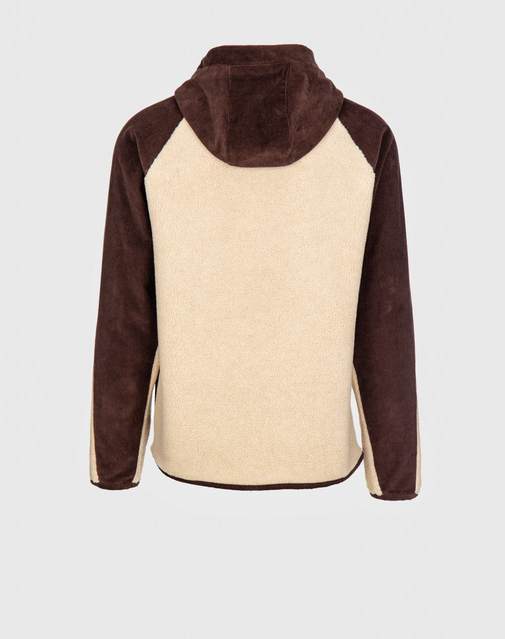 Anorak com capuz e manga raglan. Abertura meio-frente através de fecho metálico. Etiqueta JEF na vertical. Interior da plaquete e bolsos forrados com tecido estampado do all-over alusivo ao conceito da coleção.