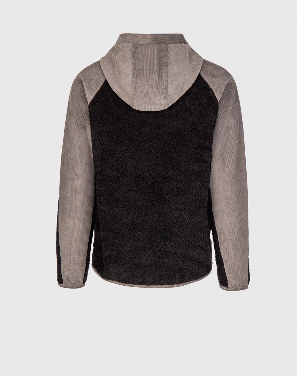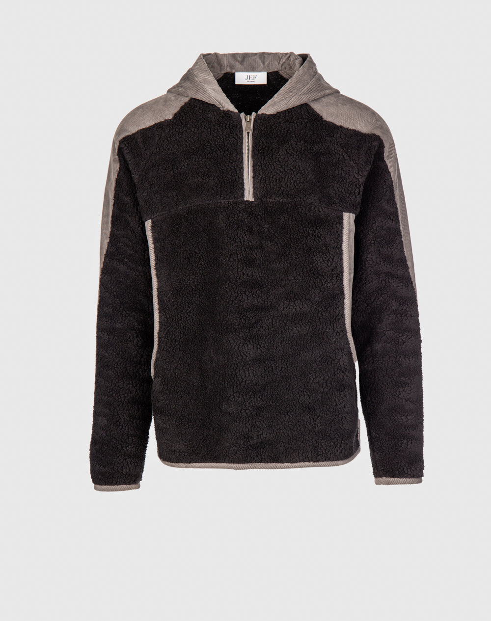 Anorak com capuz e manga raglan. Abertura meio-frente através de fecho metálico. Etiqueta JEF na vertical. Interior da plaquete e bolsos forrados com tecido estampado do all-over alusivo ao conceito da coleção.