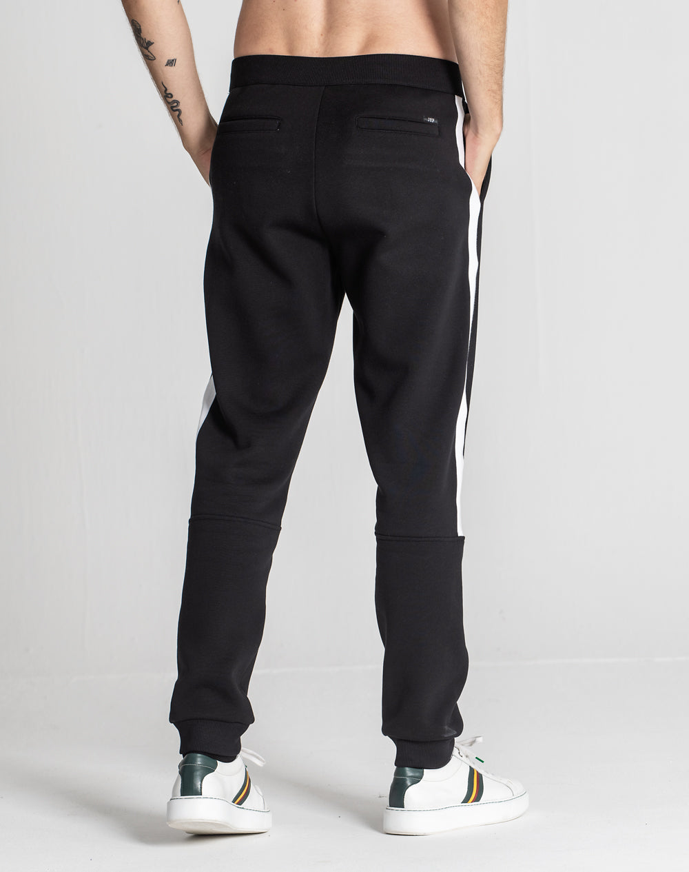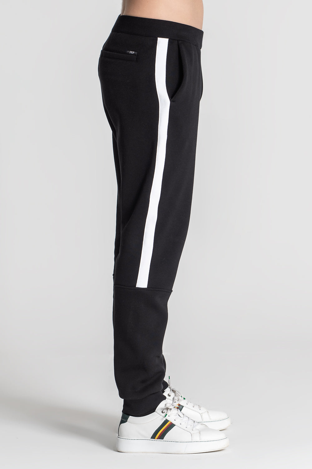 Calça de fato de treino. Elástico com regulador para melhor ajuste. Bolsos de faca nas laterais. Bolsos de vivo nas costas. Forro interior dos bolsos em tecido estampado (all-over alusivo ao conceito da coleção). Cortes nas laterais com malha em contraste. Etiqueta JEF na horizontal por cima do bolso de vivo.