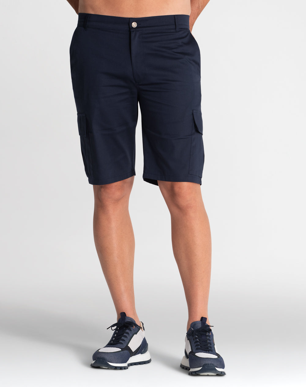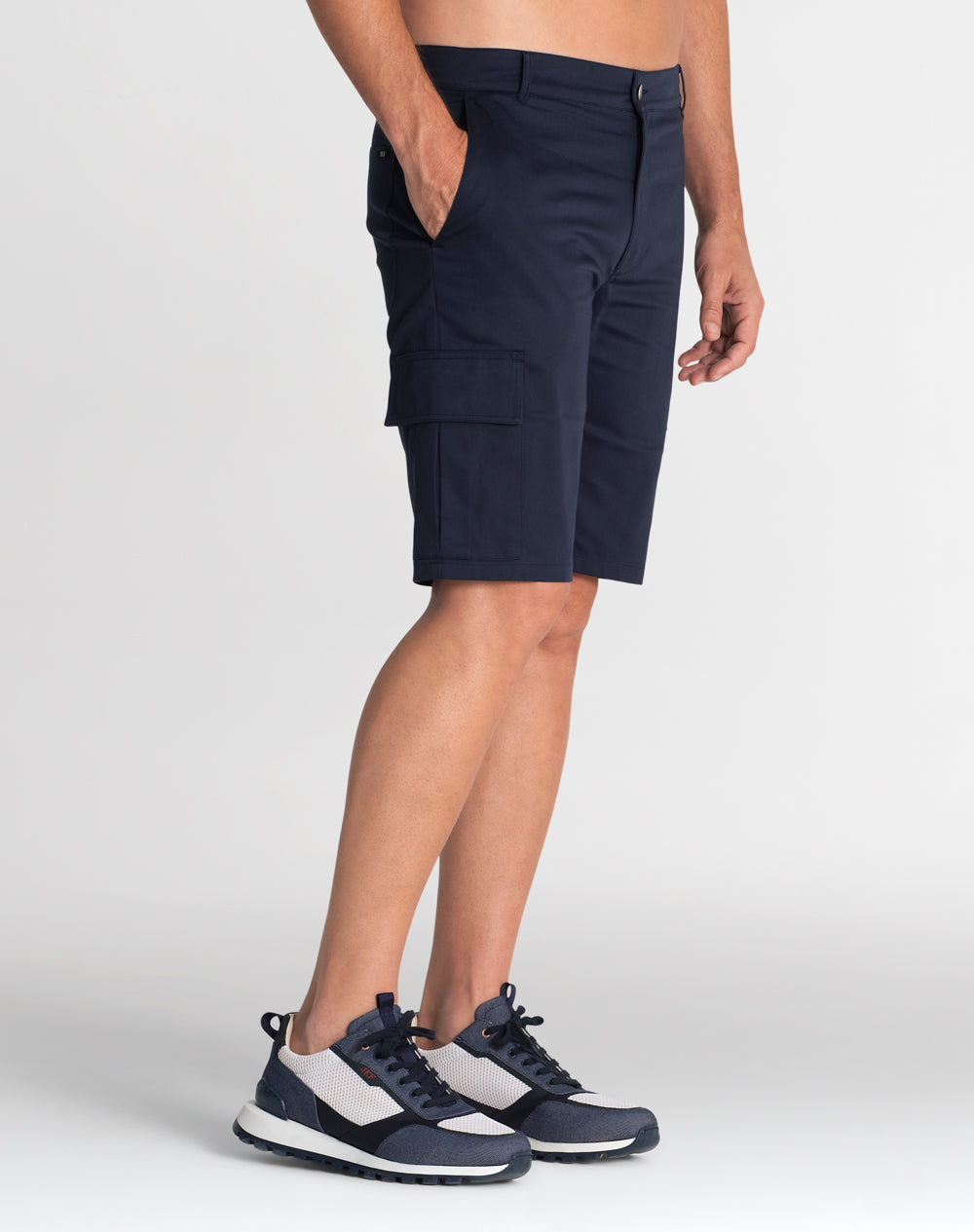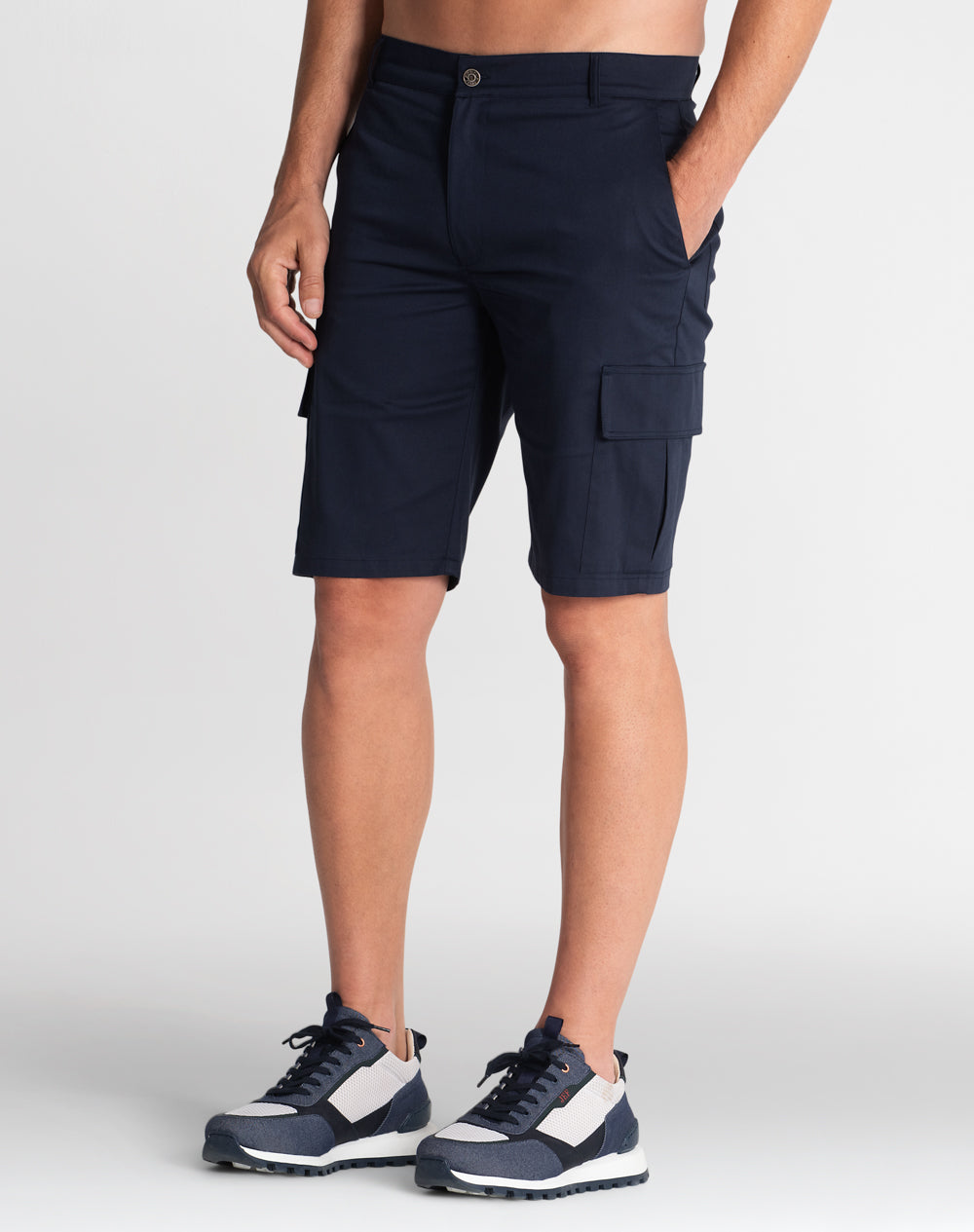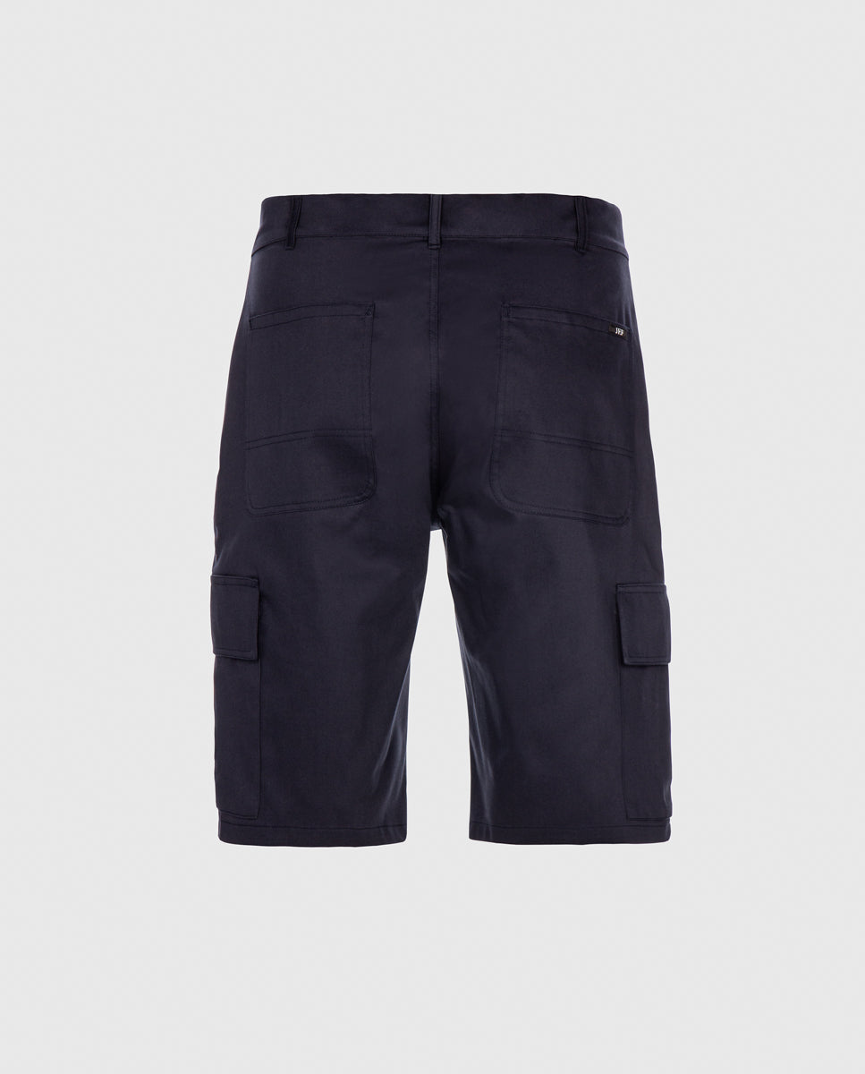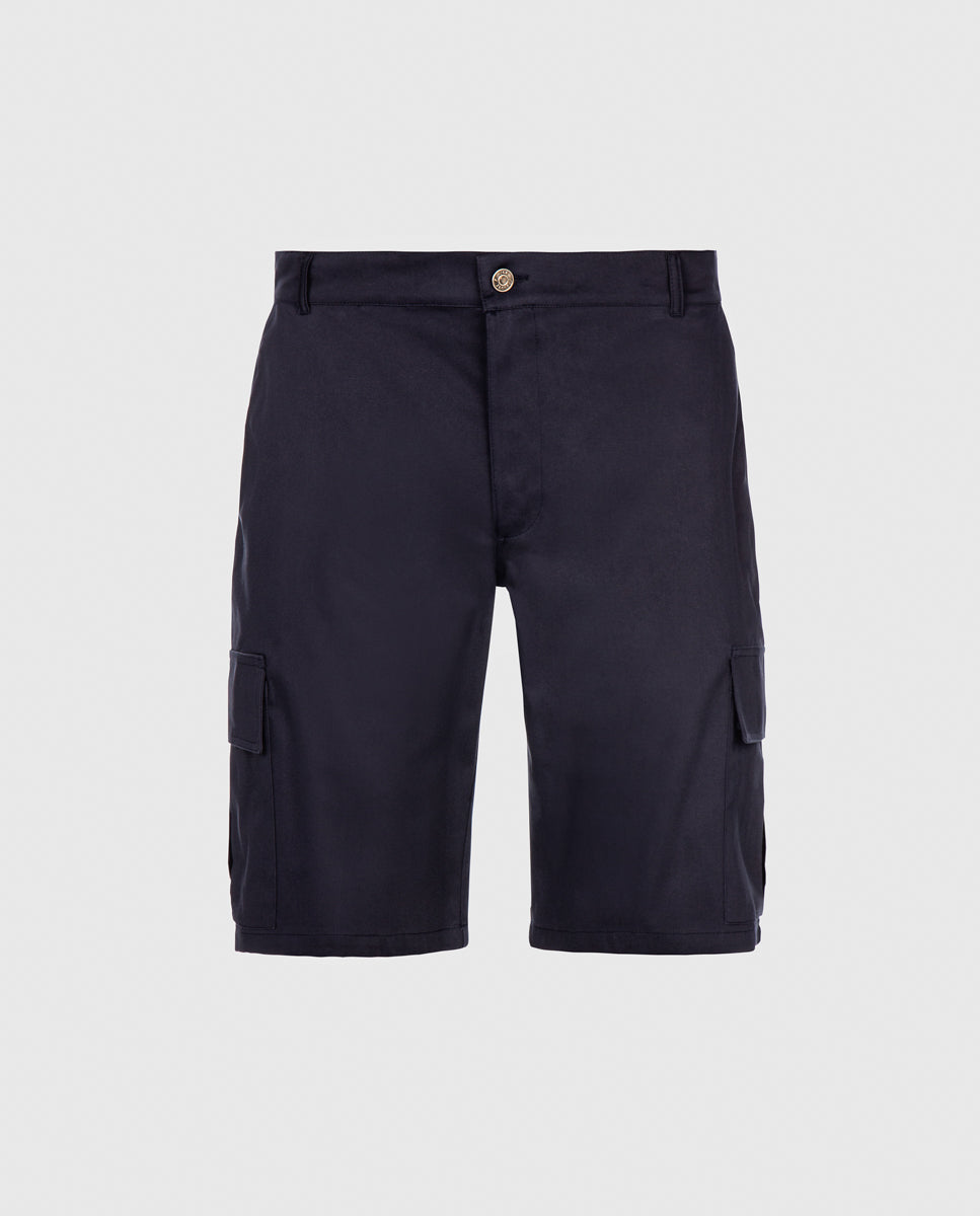 Calção cargo em sarja com acabamento water repellent. Abertura meio-frente através de botão de prego e fecho interior. Estilo 6 bolsos. Forro dos bolsos e costuras avivadas em tecido estampado.