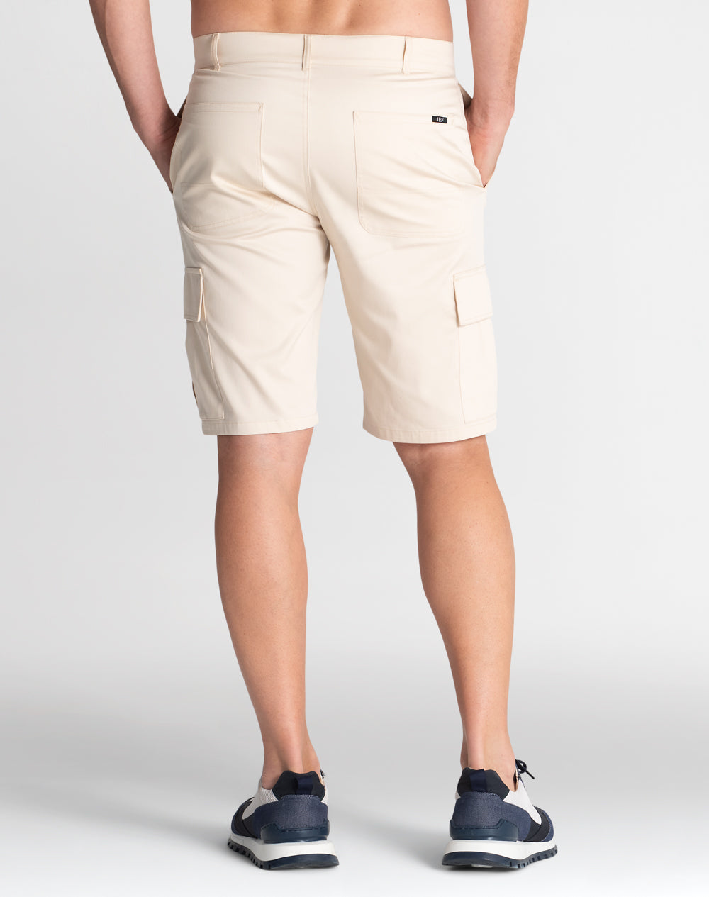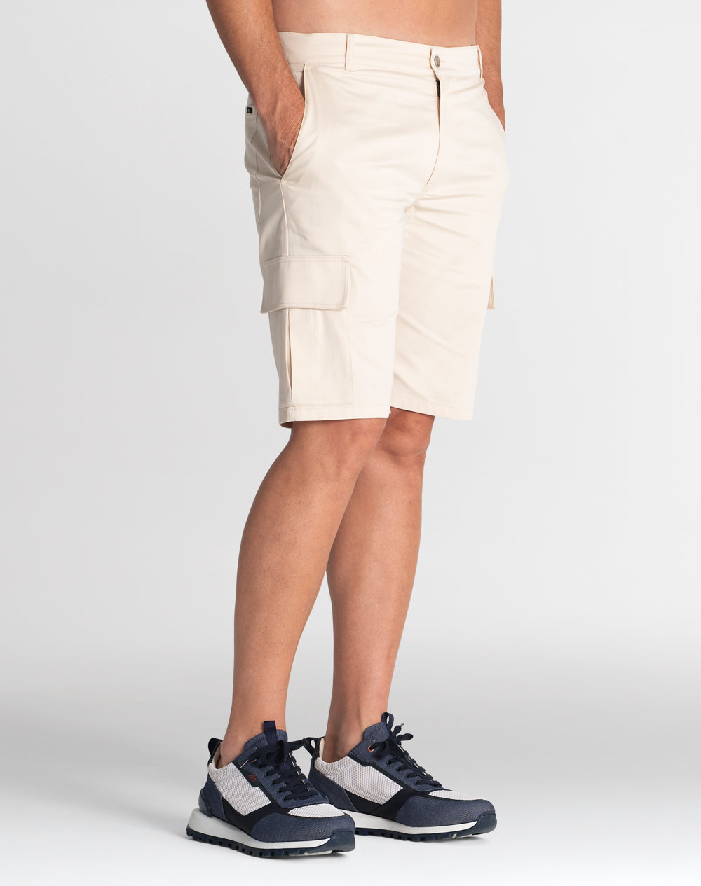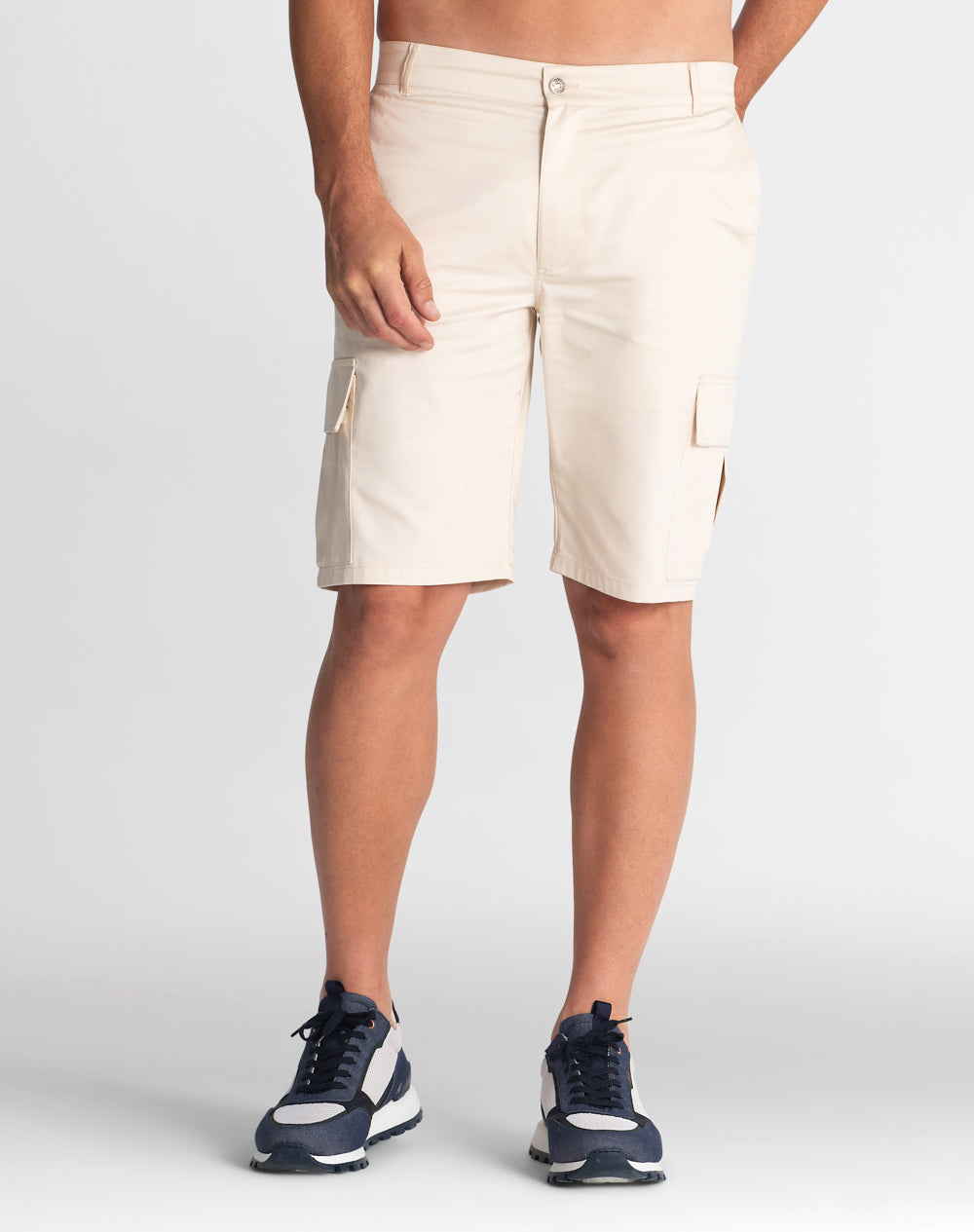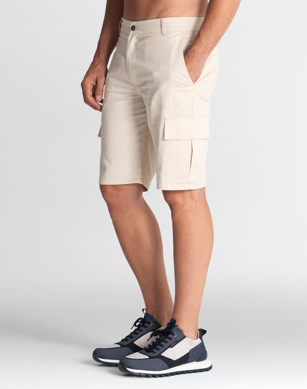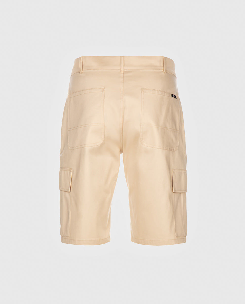 Calção cargo em sarja com acabamento water repellent. Abertura meio-frente através de botão de prego e fecho interior. Estilo 6 bolsos. Forro dos bolsos e costuras avivadas em tecido estampado.