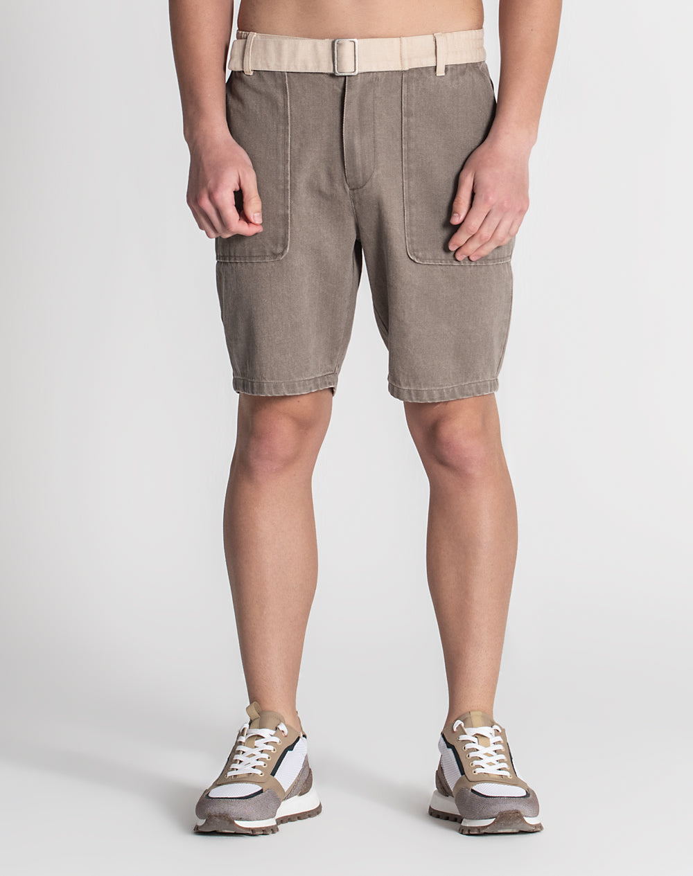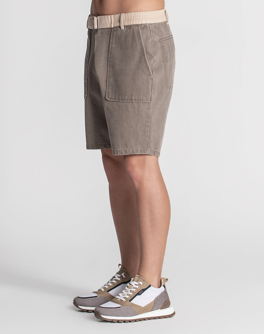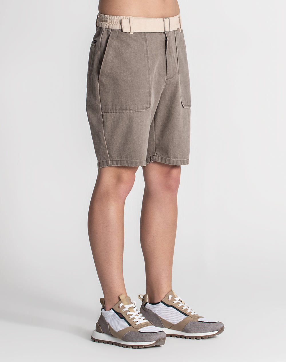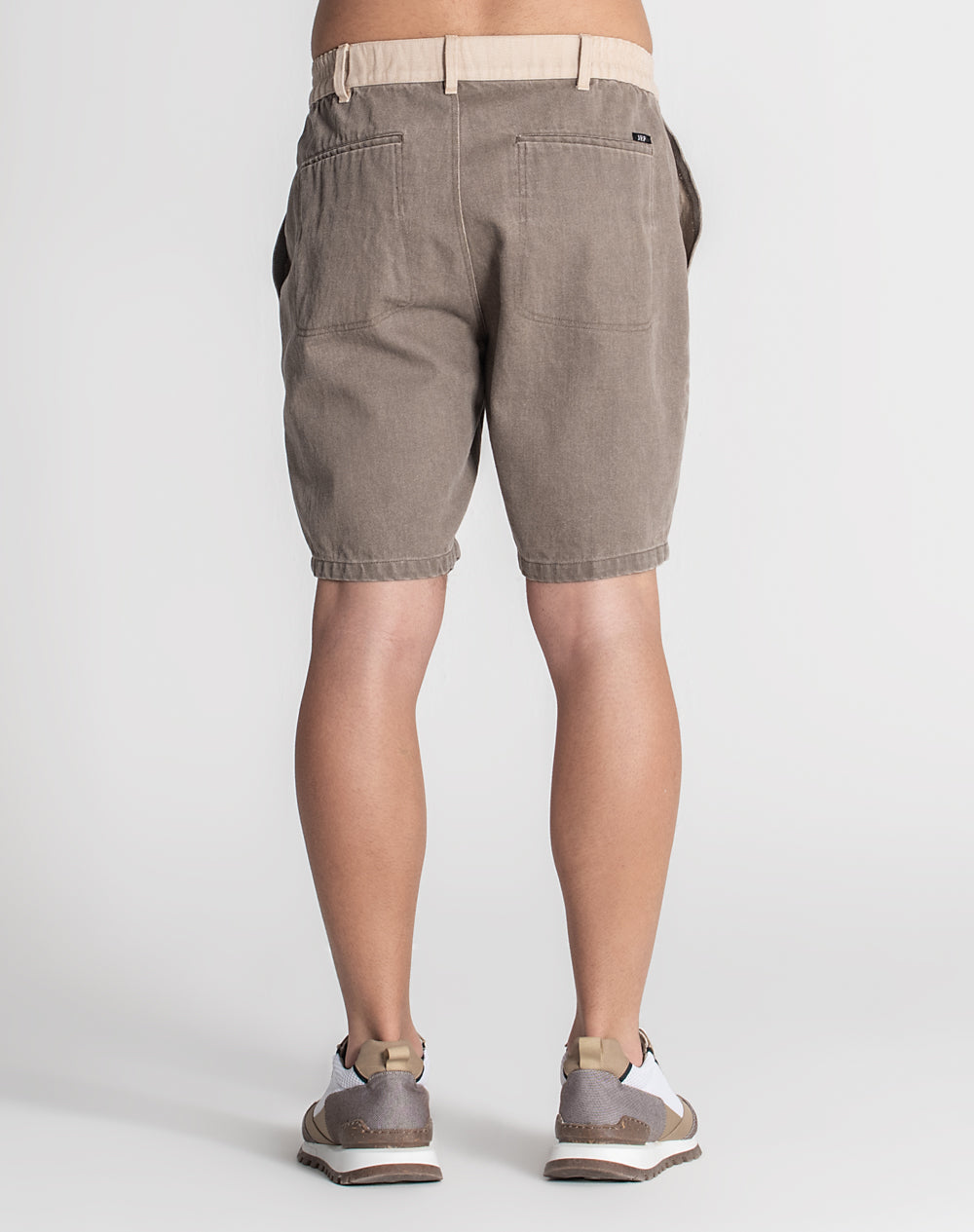 Calção em denim 100% algodão orgânico. Bolsos de faca nas laterais. Abertura através de fecho interior e fivela. Cinto com elástico. Etiqueta JEF na horizontal no bolso costas. Costuras avivadas em tecido estampado.