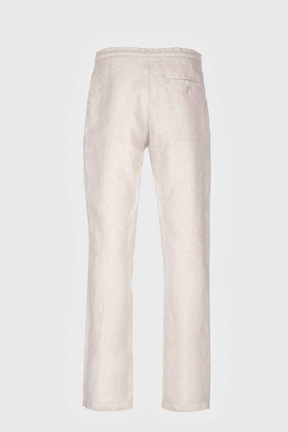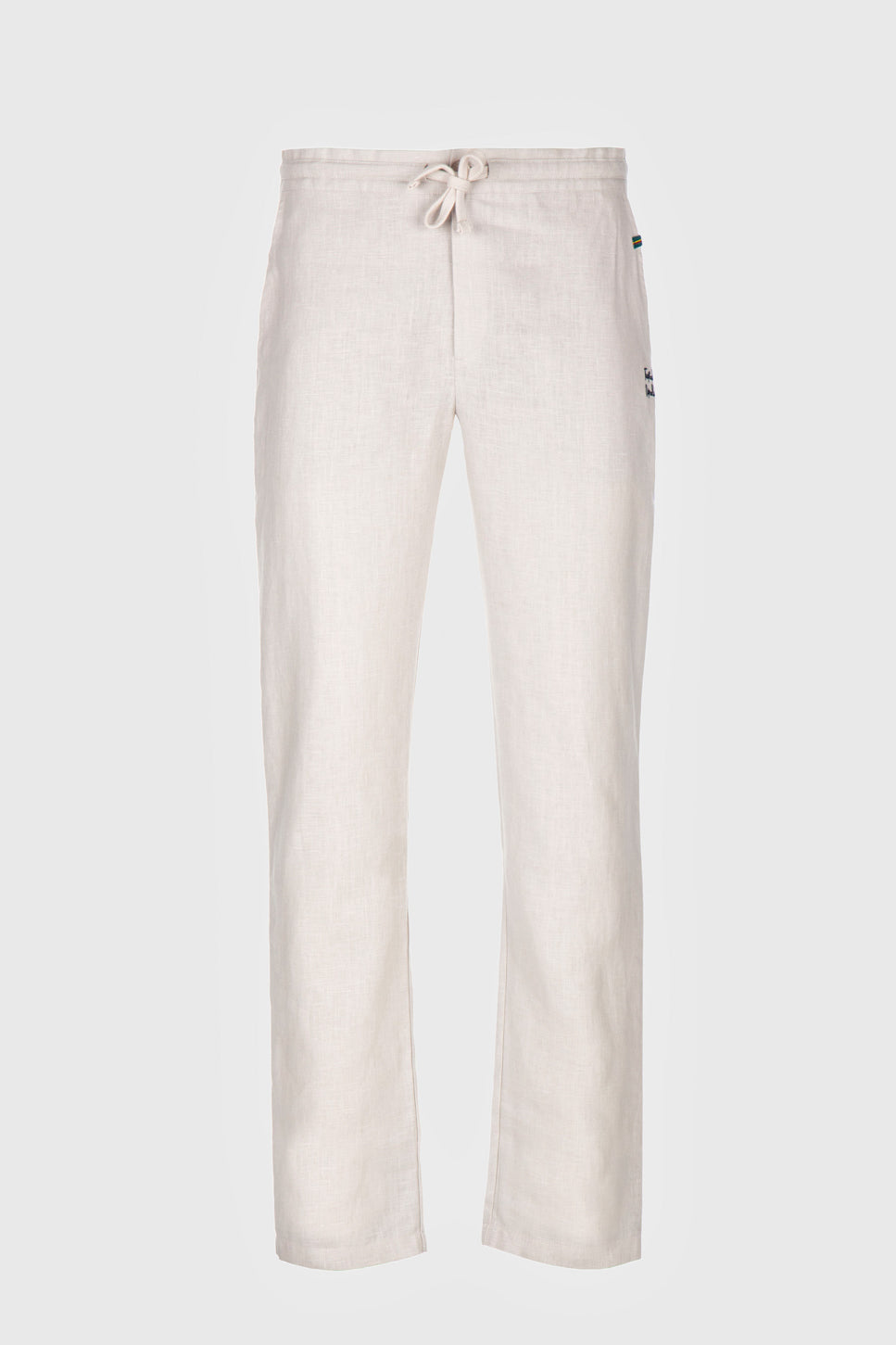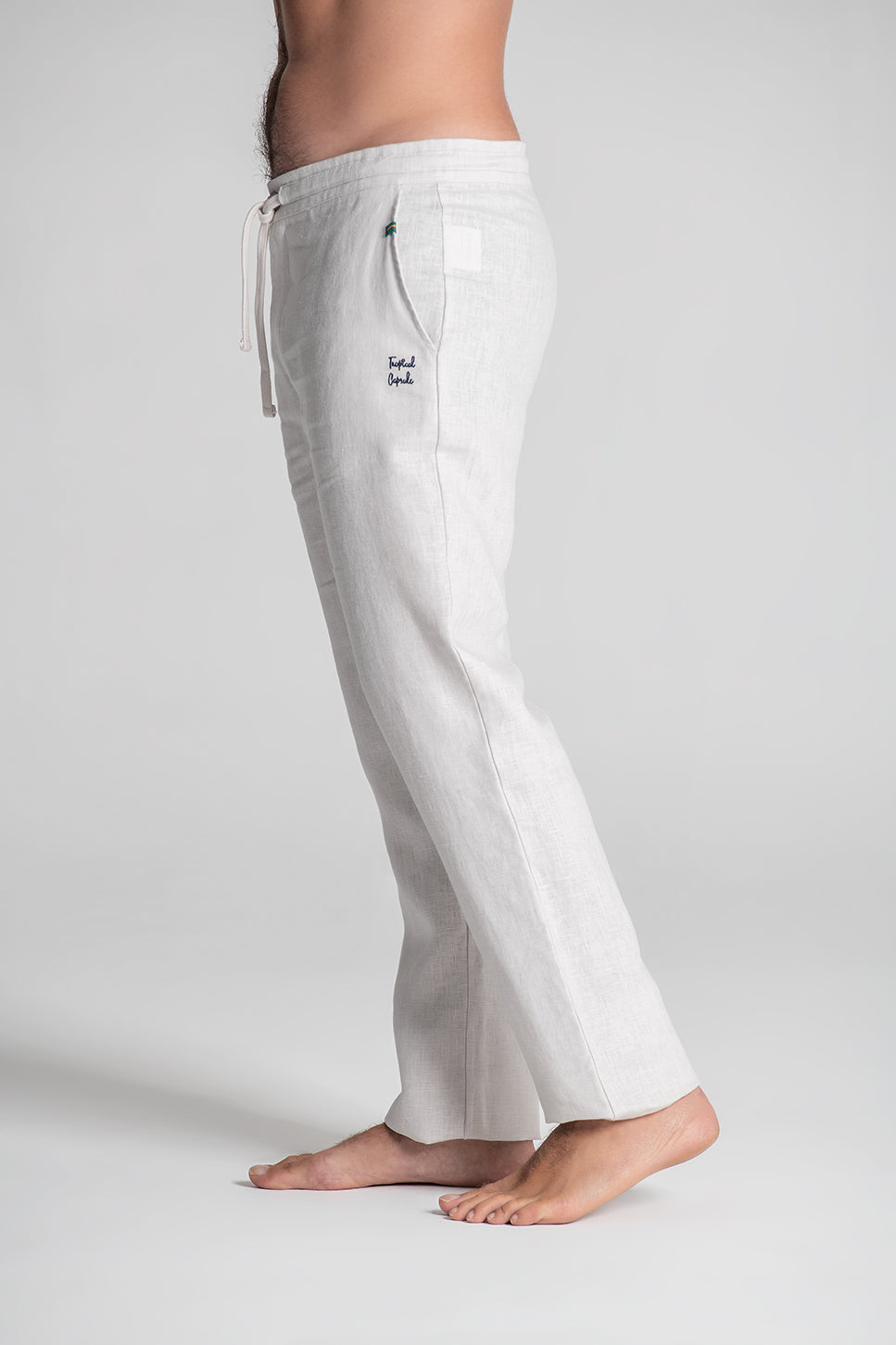 Calças de linho descontraídas. Bolsos de faca nas laterais. Bolso de vivo com botão nas costas. “Tropical Capsule” bordado em tom de contraste. Fita de nastro com as cores da marca.