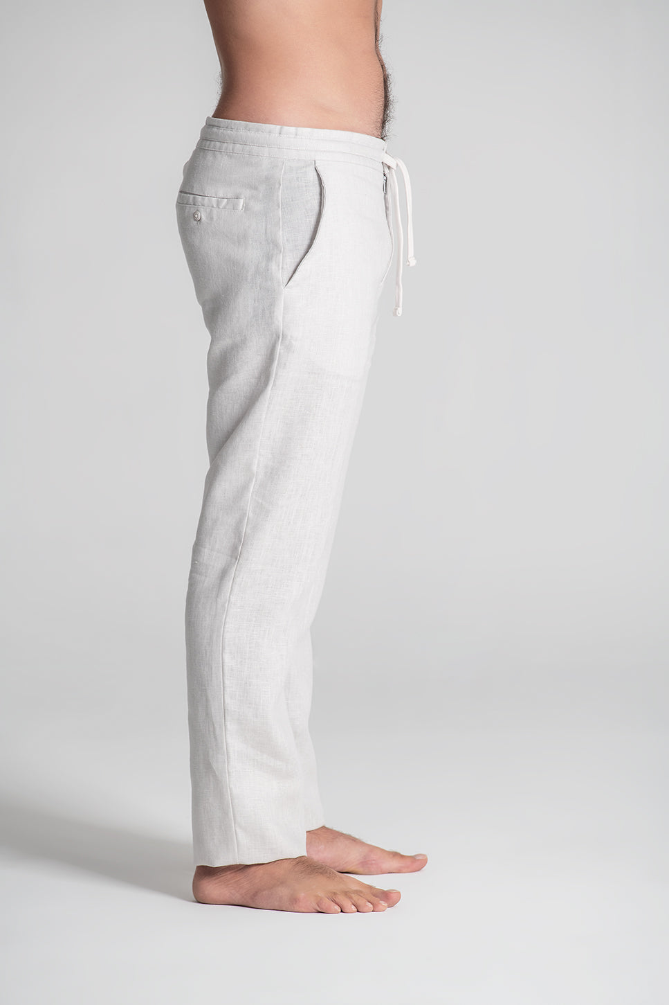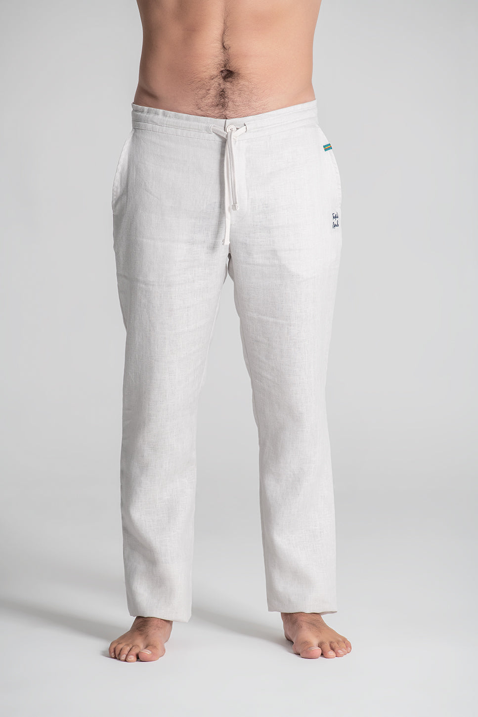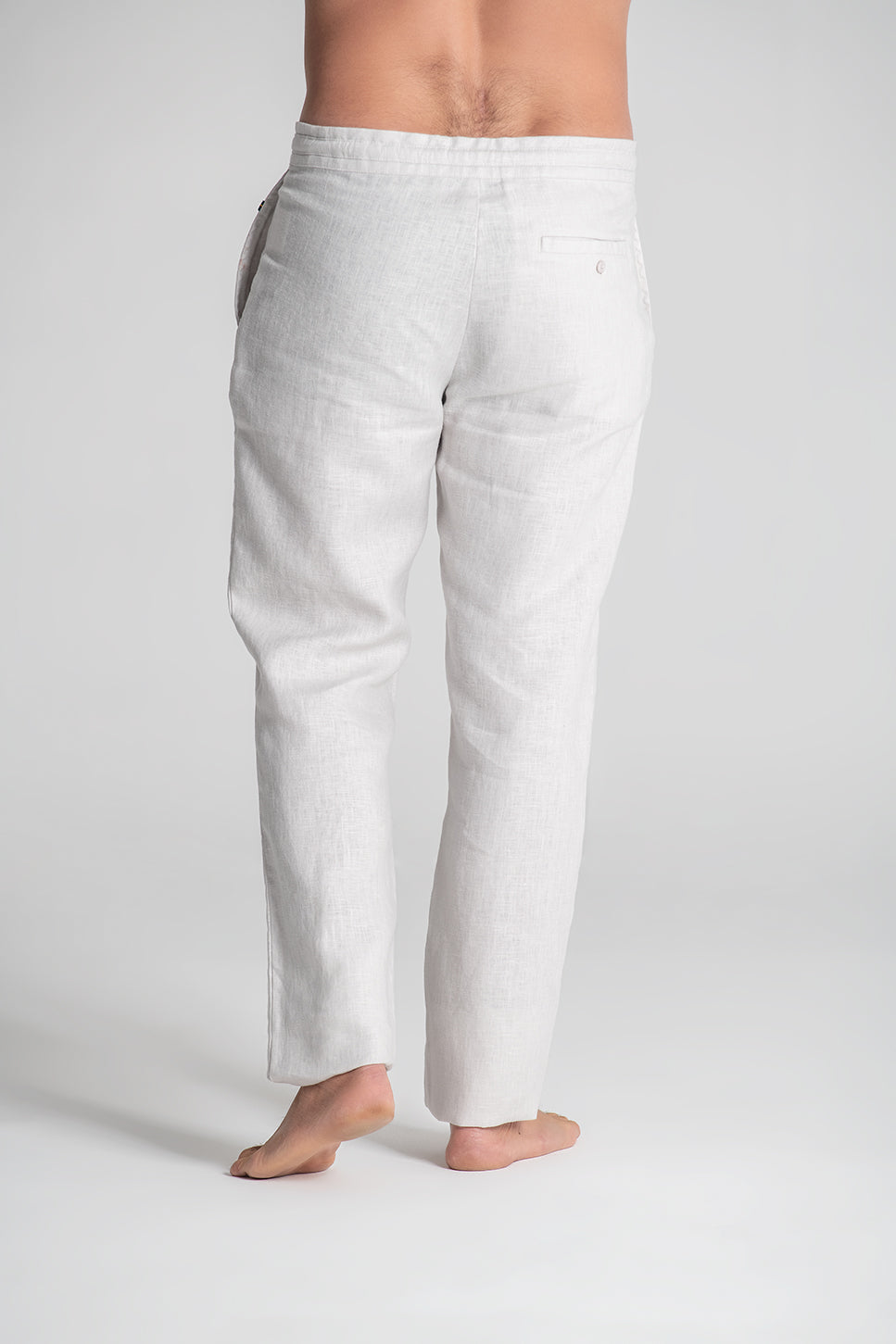 Calças de linho descontraídas. Bolsos de faca nas laterais. Bolso de vivo com botão nas costas. “Tropical Capsule” bordado em tom de contraste. Fita de nastro com as cores da marca.