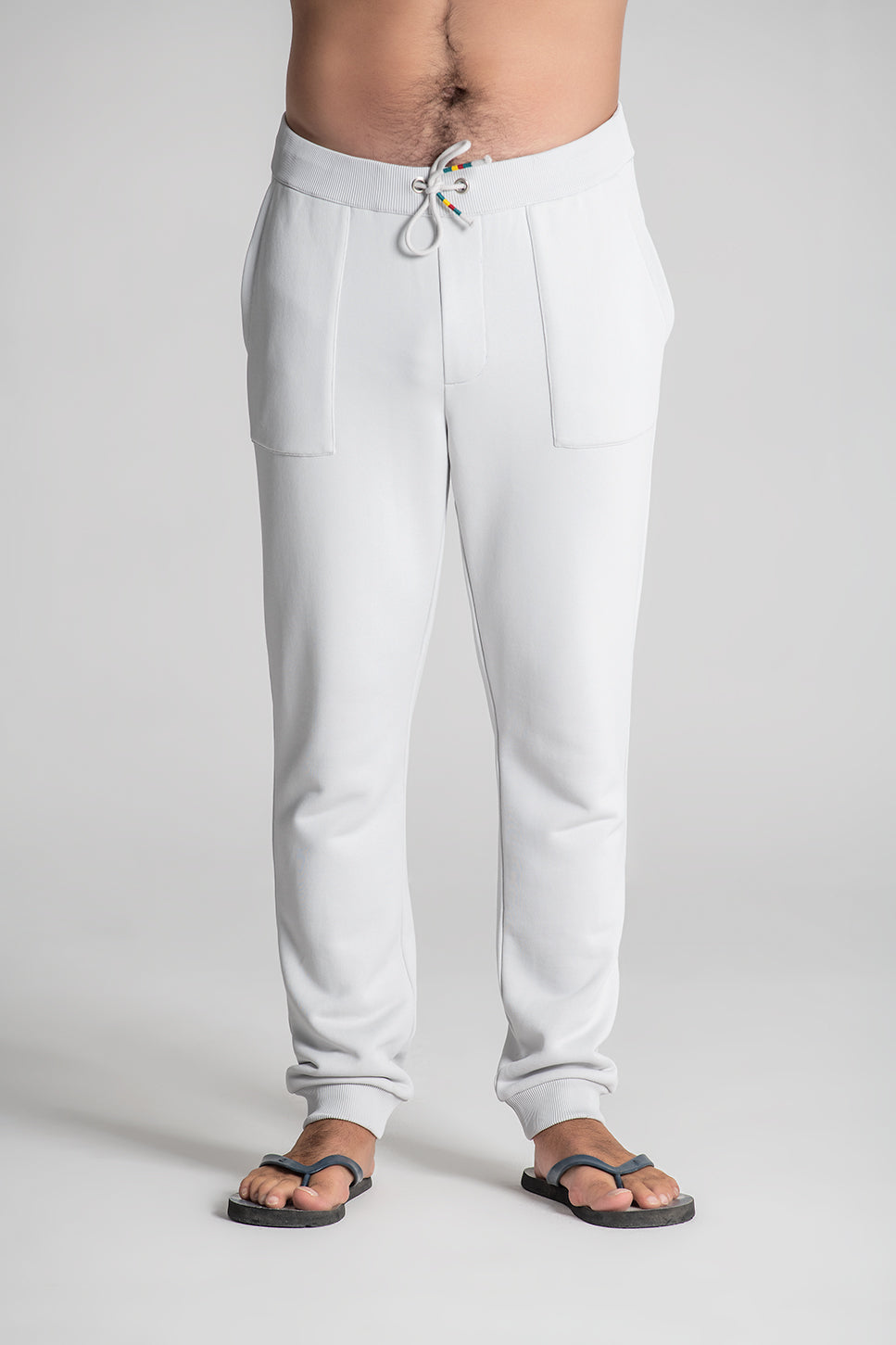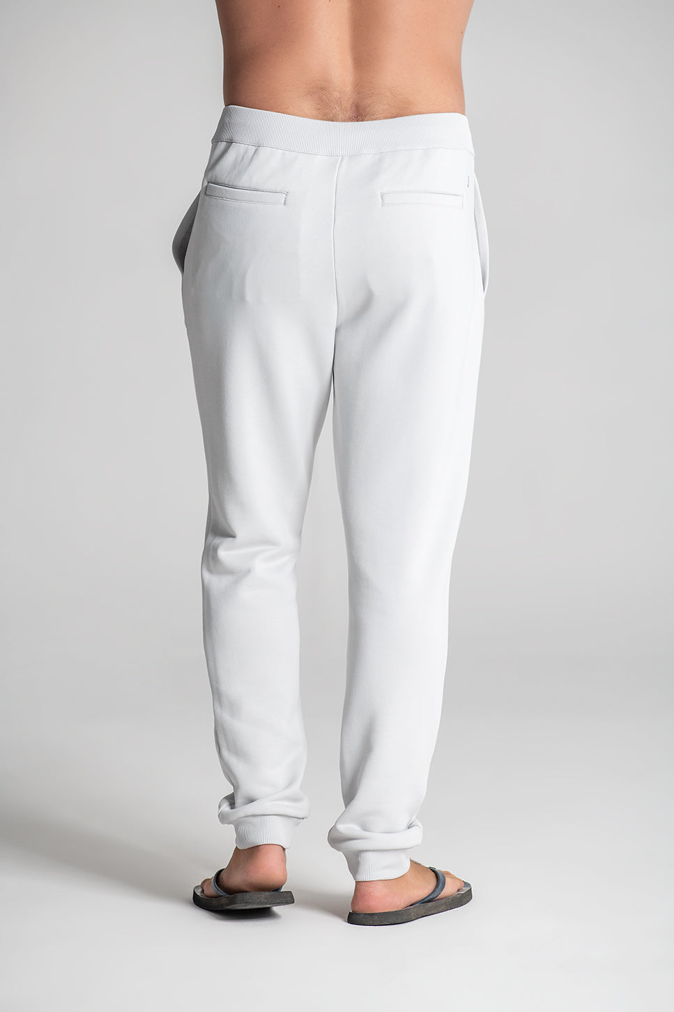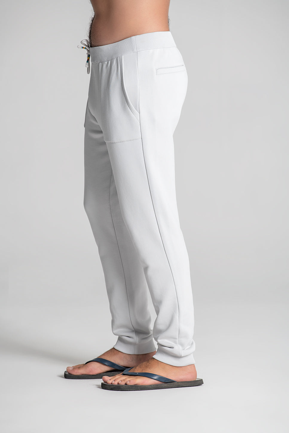 Calça de fato de treino com bolsos de faca nas laterais. Cordões para facilitar o ajuste. Bolsos de vivo nas costas. Costuras interiores avivadas com tecido estampado alusivo ao tema da coleção. Logótipo bordado nas costas à cor da peça.