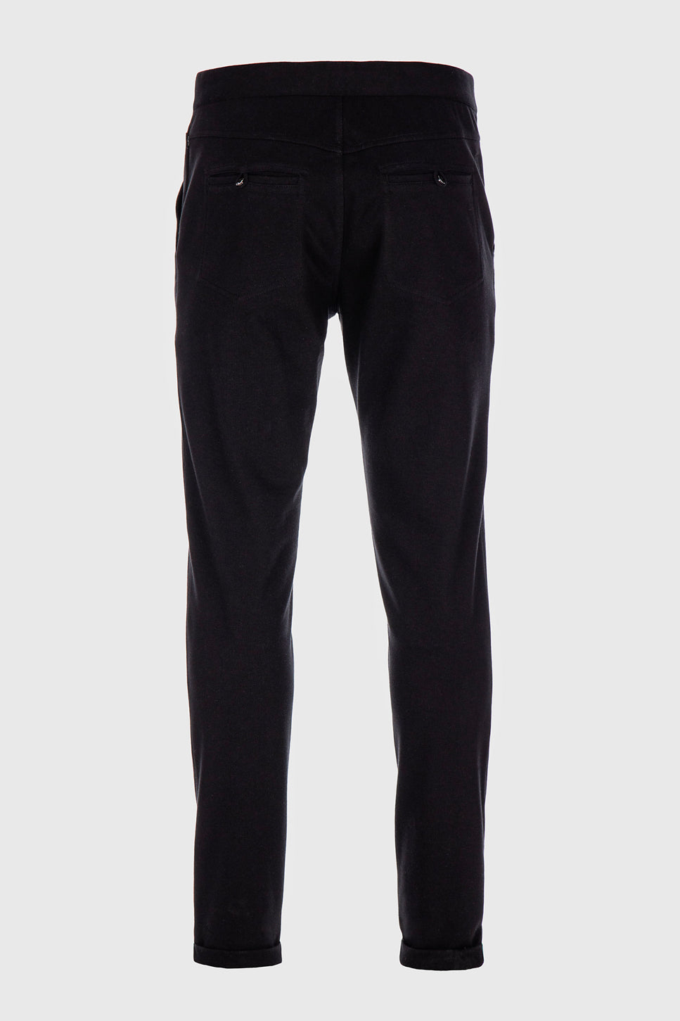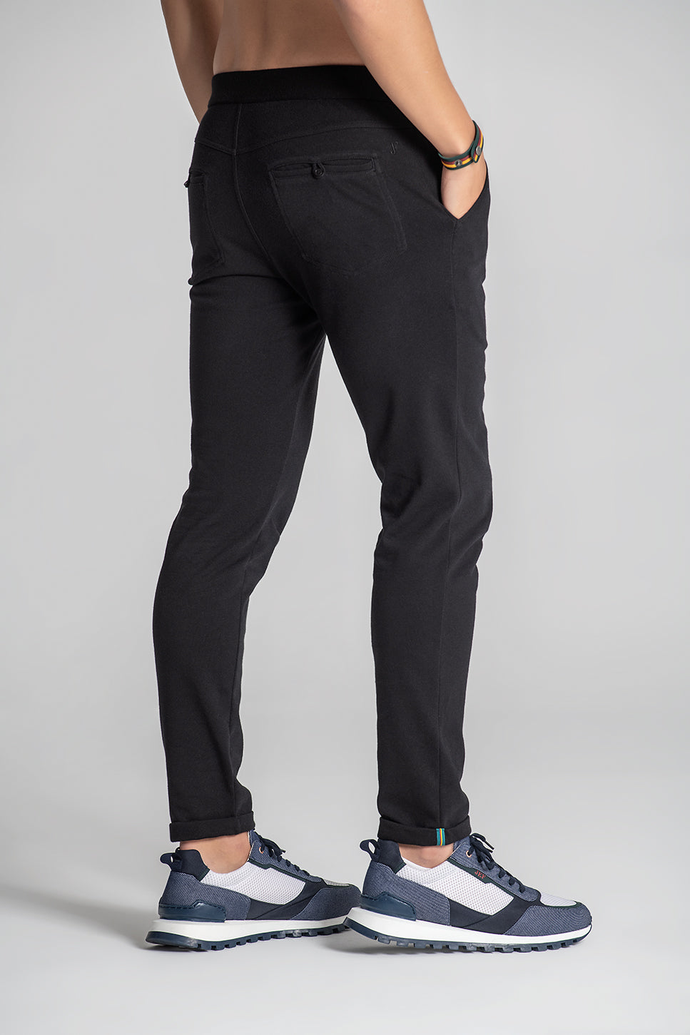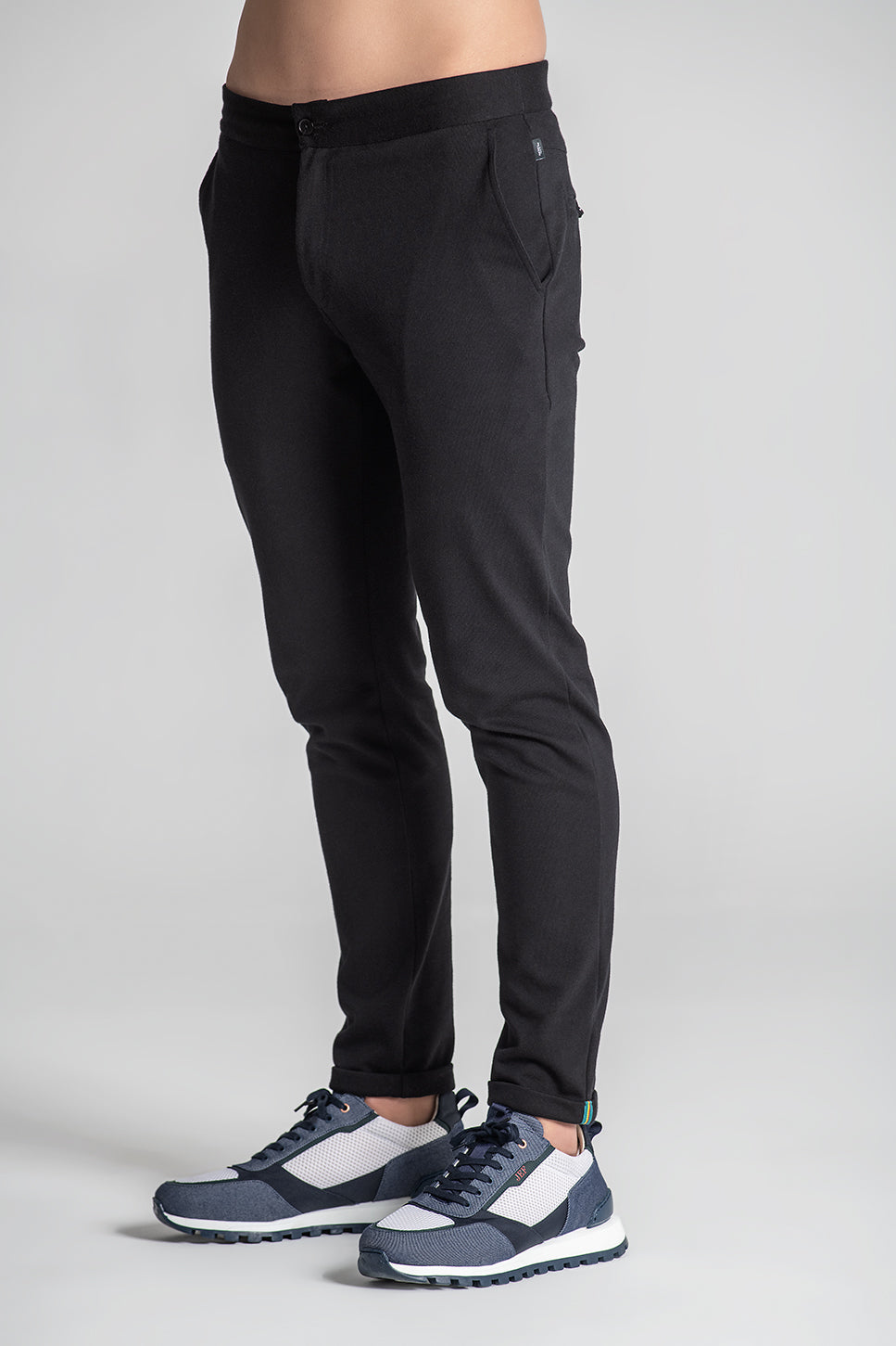 Calças tipo chino em algodão orgânico. Bolsos de faca nas laterais da frente. Bolsos de chapa nas costas com botão. Escapulário das costas com pesponto duplo. Interior com cordões para facilitar o ajuste. Logótipo bordado à cor da peça nas costas lado direito. Tecido estampado (popelina orgânica com acabamento seda), alusivo ao conceito da coleção no interior do cinto na parte da frente, de lateral a lateral. Dobra no fundo da calça com vista da fita de nastro das cores da marca nas laterais.
