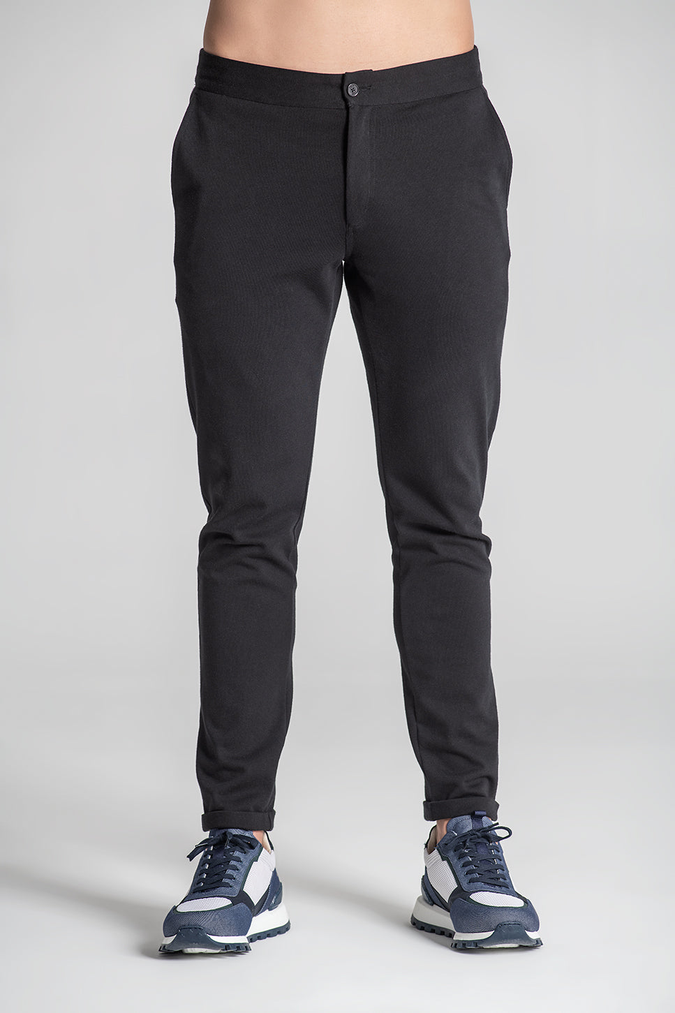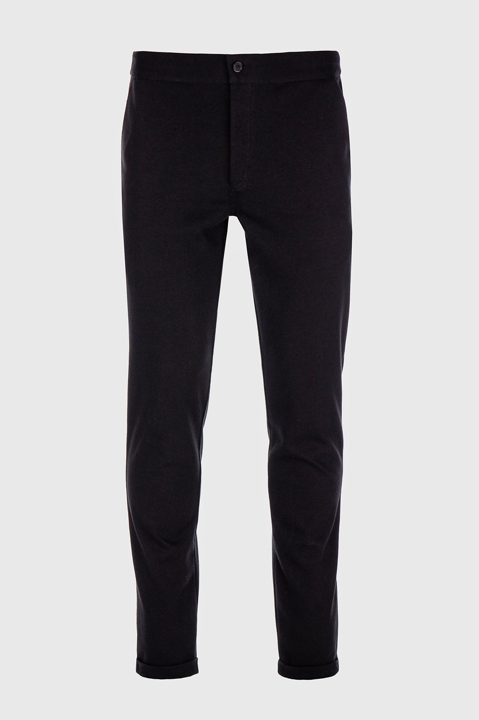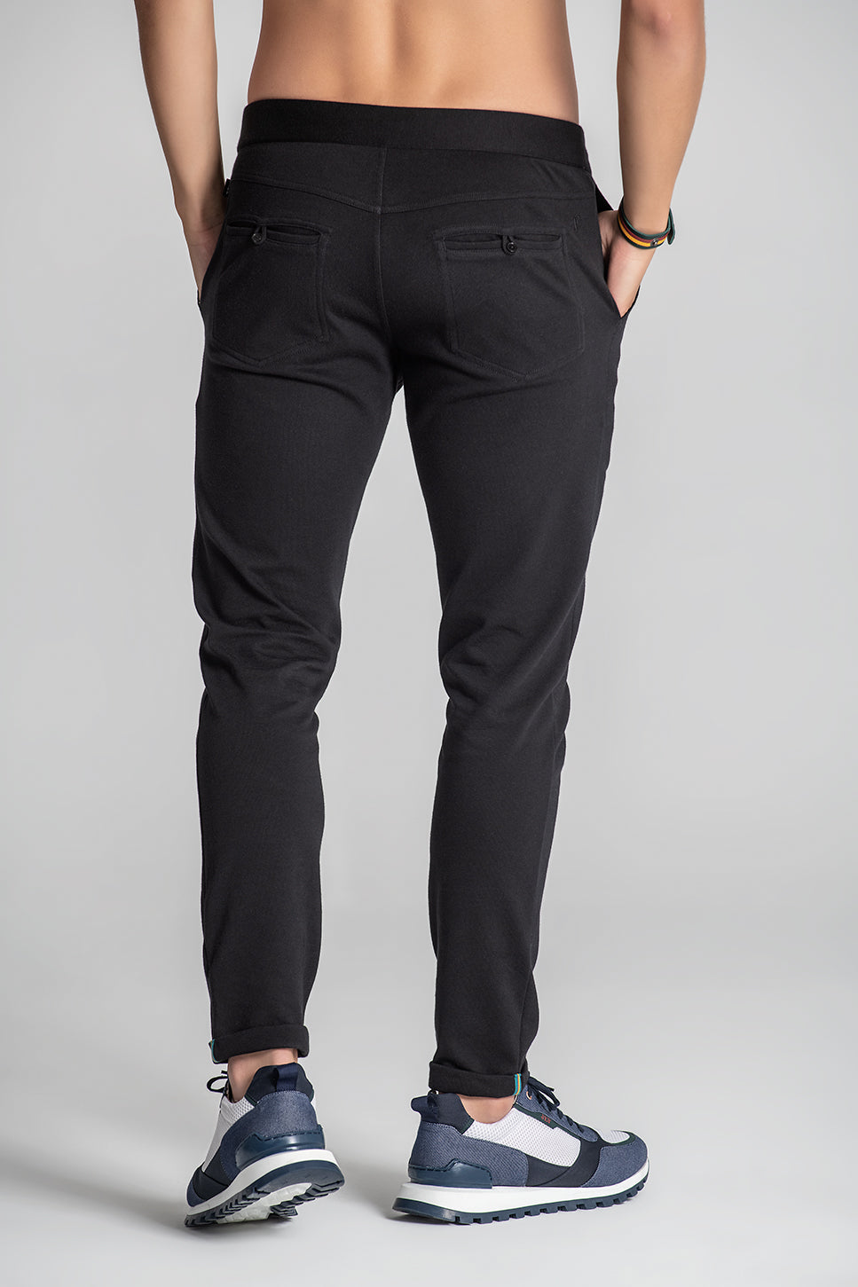 Calças tipo chino em algodão orgânico. Bolsos de faca nas laterais da frente. Bolsos de chapa nas costas com botão. Escapulário das costas com pesponto duplo. Interior com cordões para facilitar o ajuste. Logótipo bordado à cor da peça nas costas lado direito. Tecido estampado (popelina orgânica com acabamento seda), alusivo ao conceito da coleção no interior do cinto na parte da frente, de lateral a lateral. Dobra no fundo da calça com vista da fita de nastro das cores da marca nas laterais.