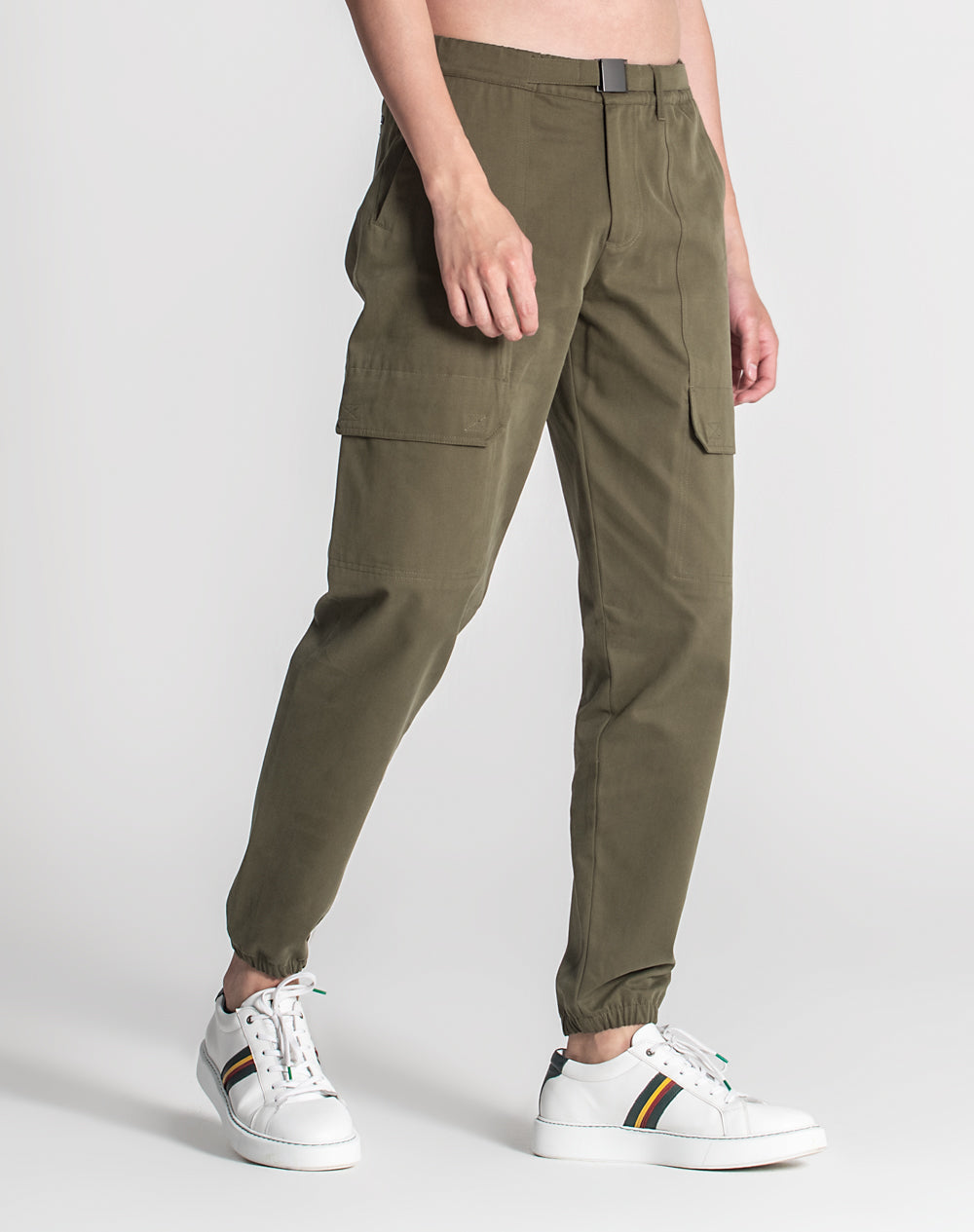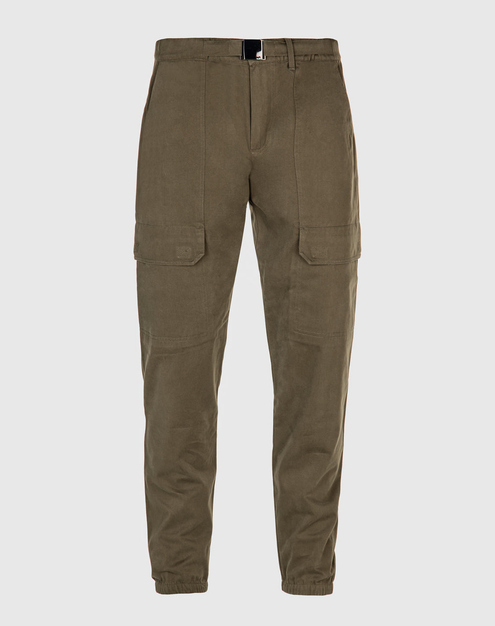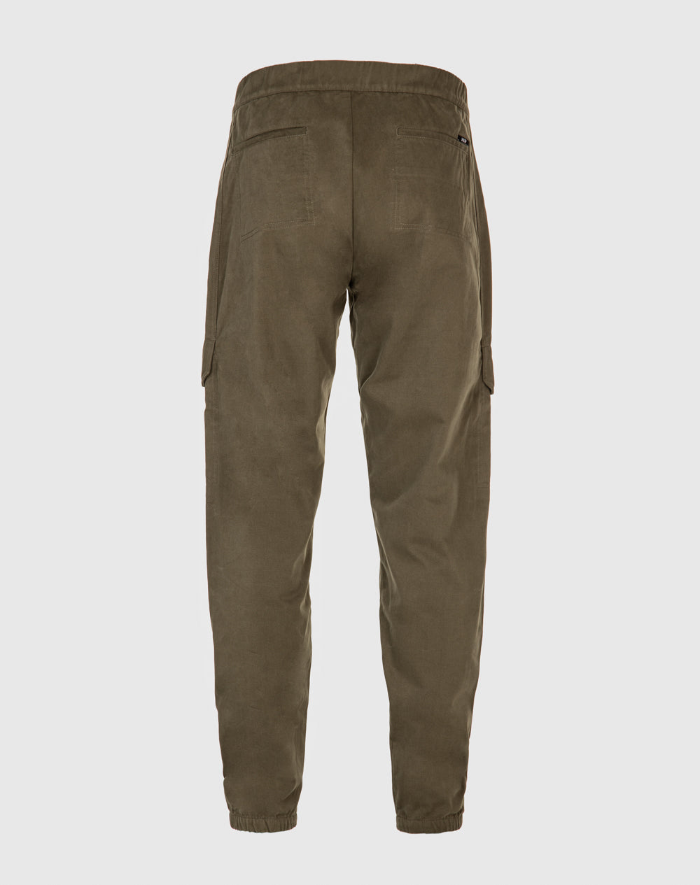 Calças estilo cargo em algodão orgânico. Cinto com elástico e fivela. Na frente bolsos de faca e bolsos de pala. Nas costas bolsos de vivo. Estilo 6 bolsos. Forro dos bolsos e costuras avivadas em tecido estampado.