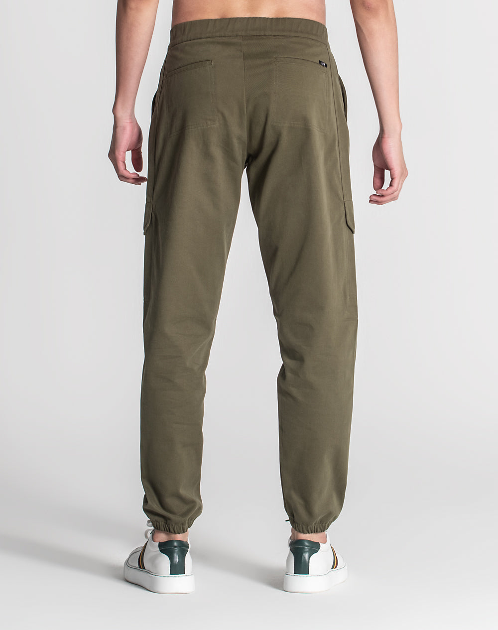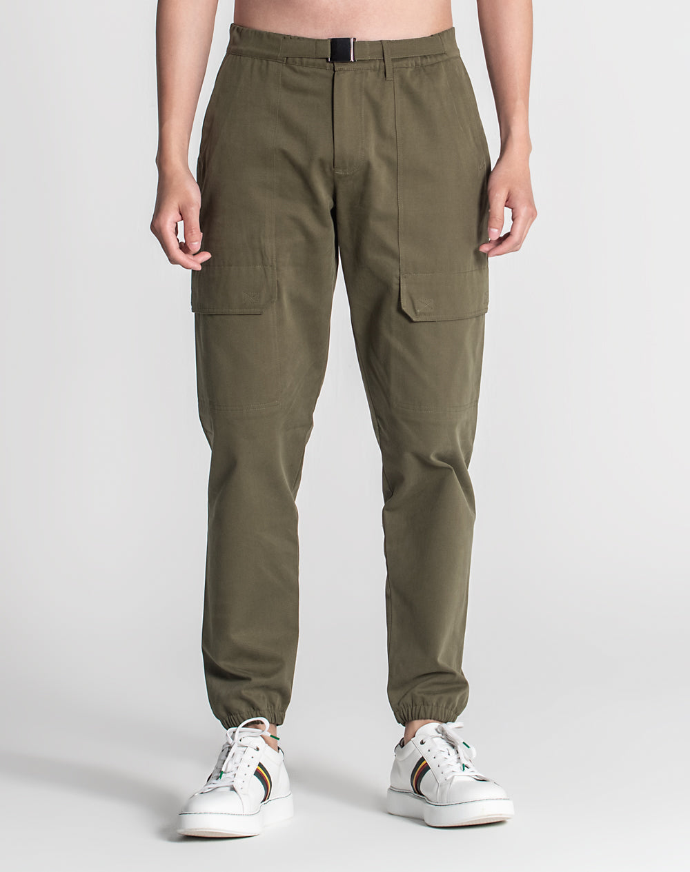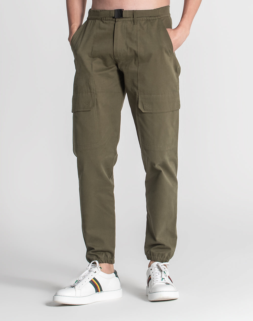 Calças estilo cargo em algodão orgânico. Cinto com elástico e fivela. Na frente bolsos de faca e bolsos de pala. Nas costas bolsos de vivo. Estilo 6 bolsos. Forro dos bolsos e costuras avivadas em tecido estampado.