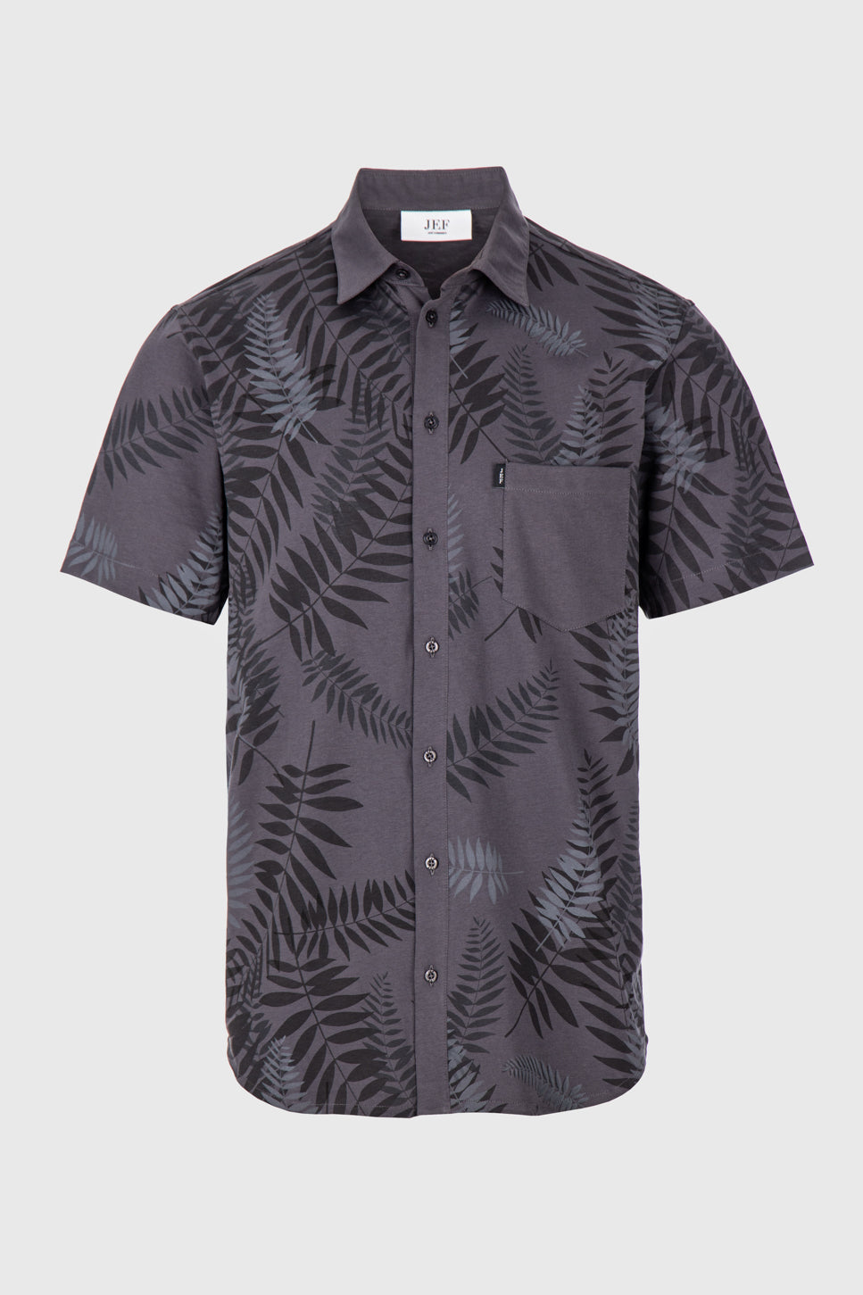 Camisa estilo regular com all-over PALM LEAVE. Bolso sobreposto em malha lisa com etiqueta JEF.