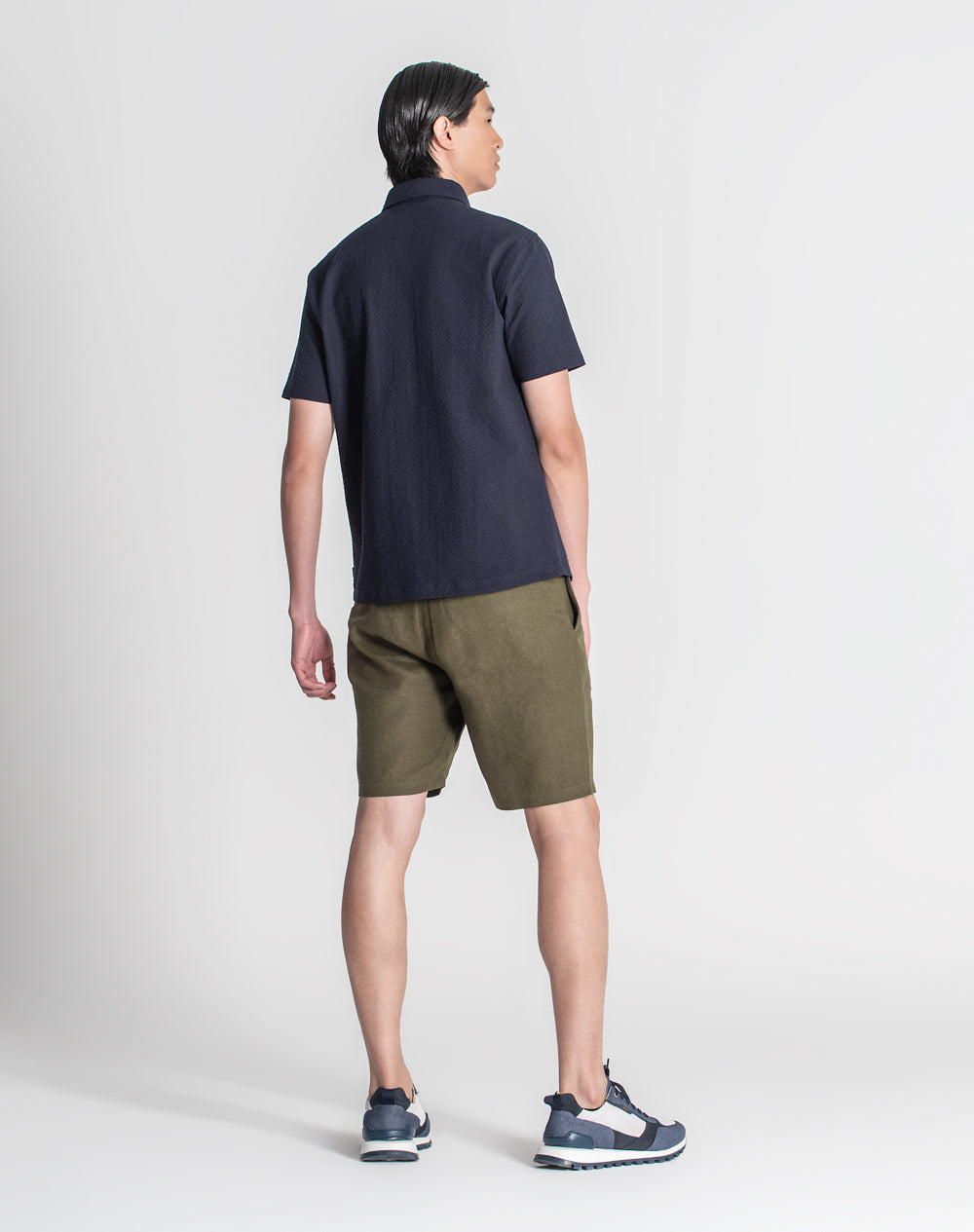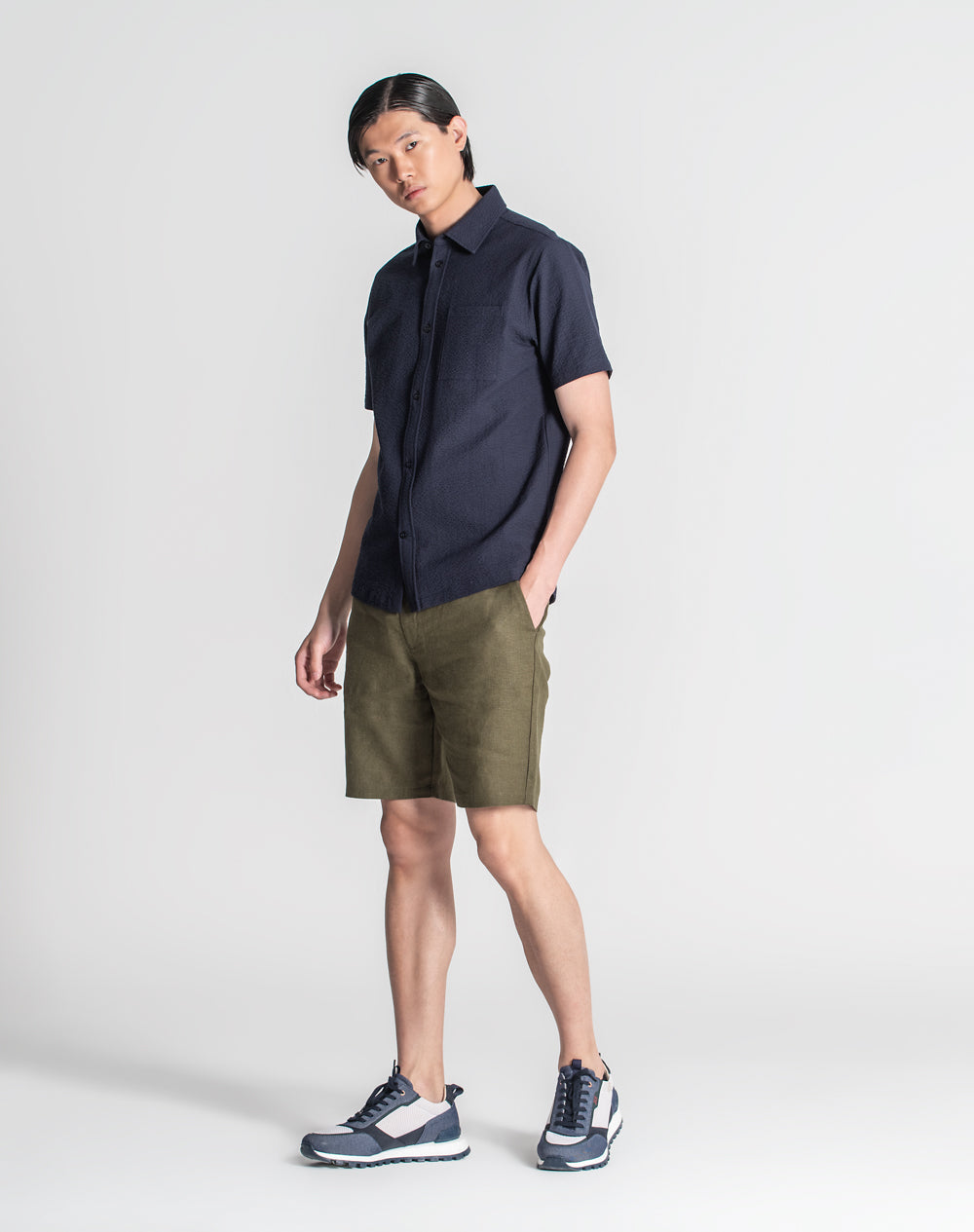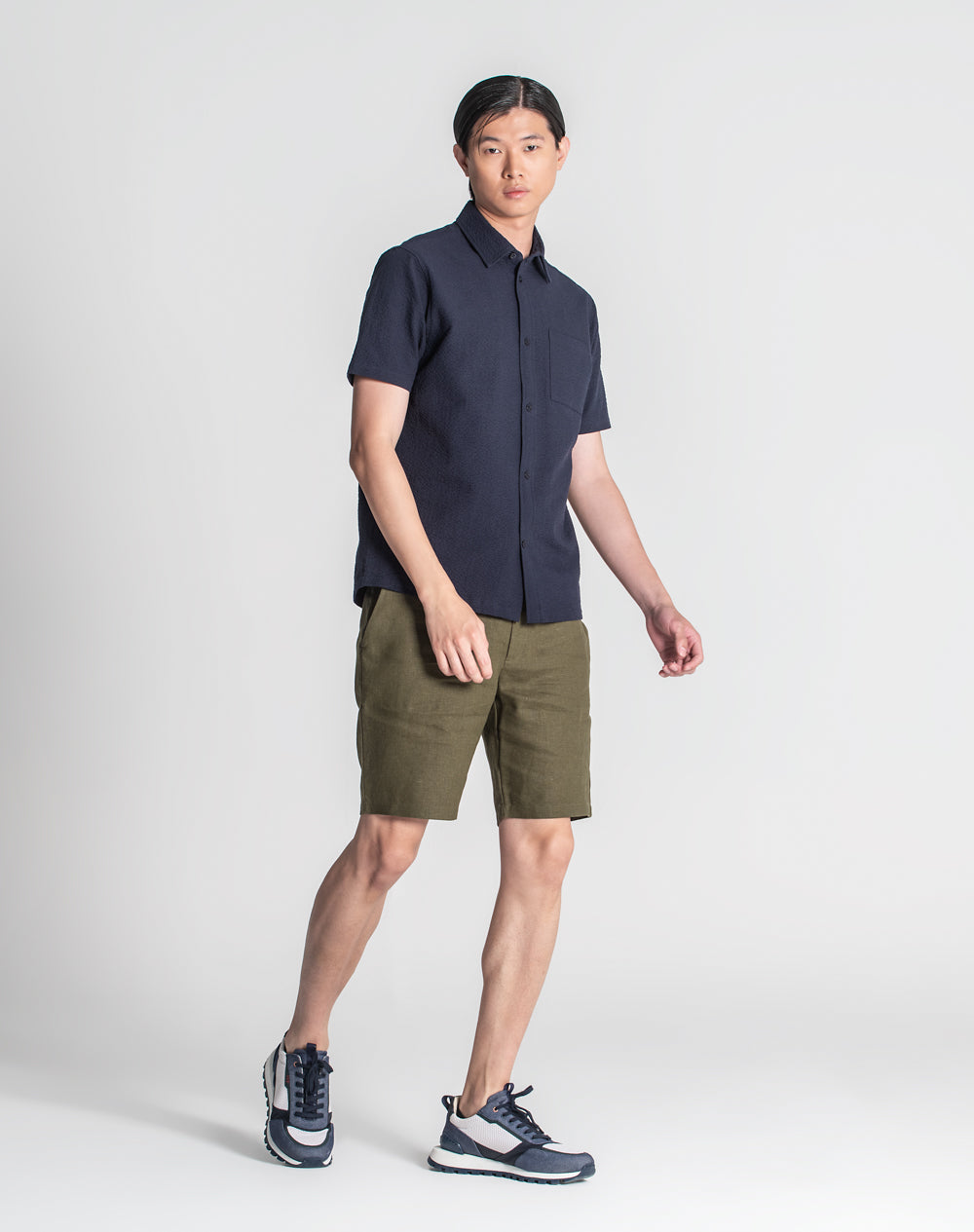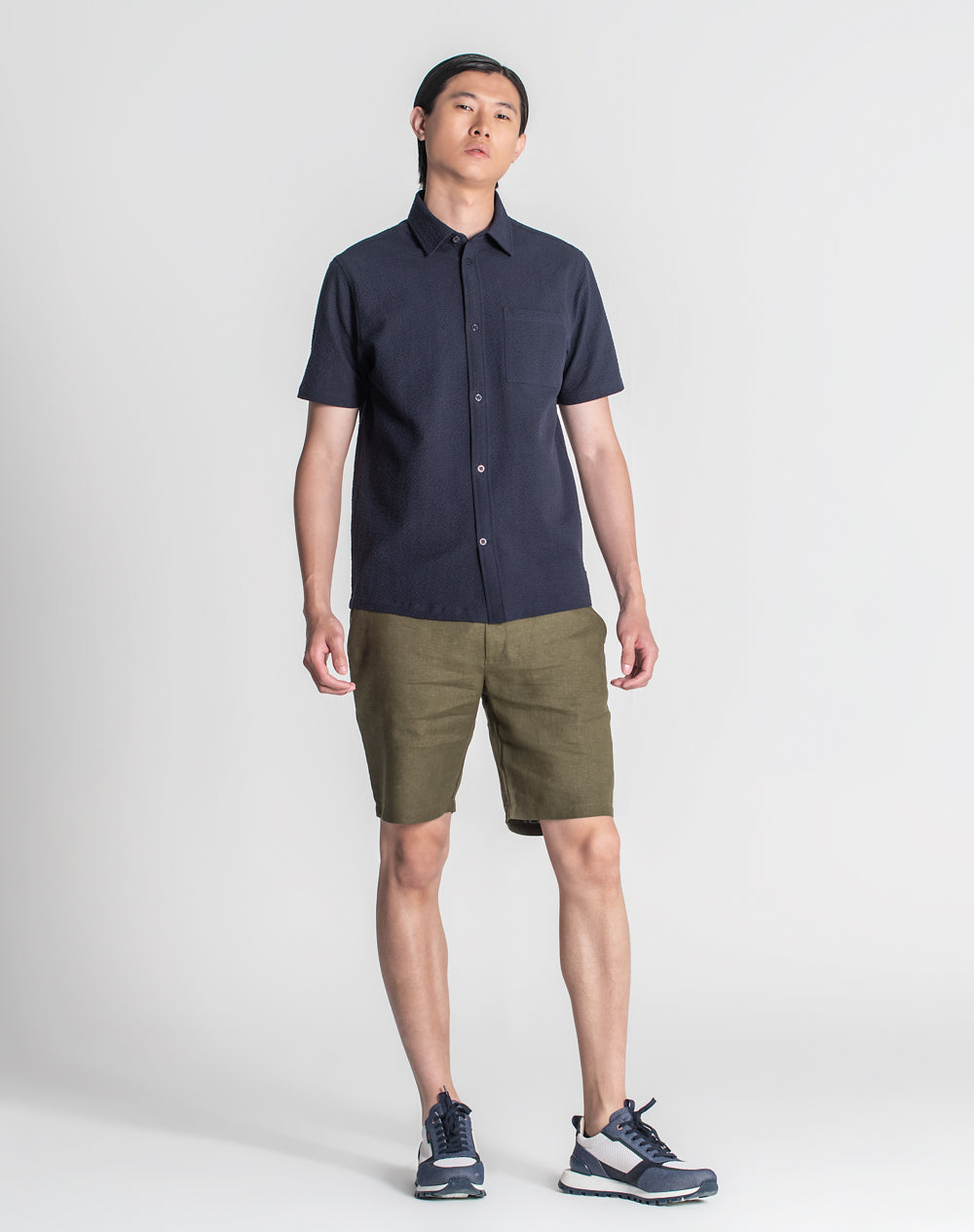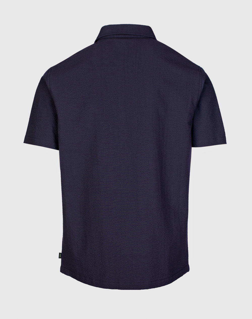 Camisa de manga curta em tecido texturizado. Estilo regular fit. Bolso de chapa. Etiqueta JEF preta na vertical metida na costura.