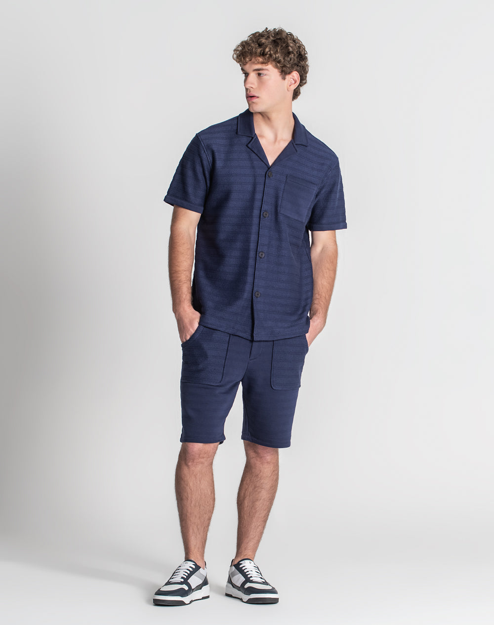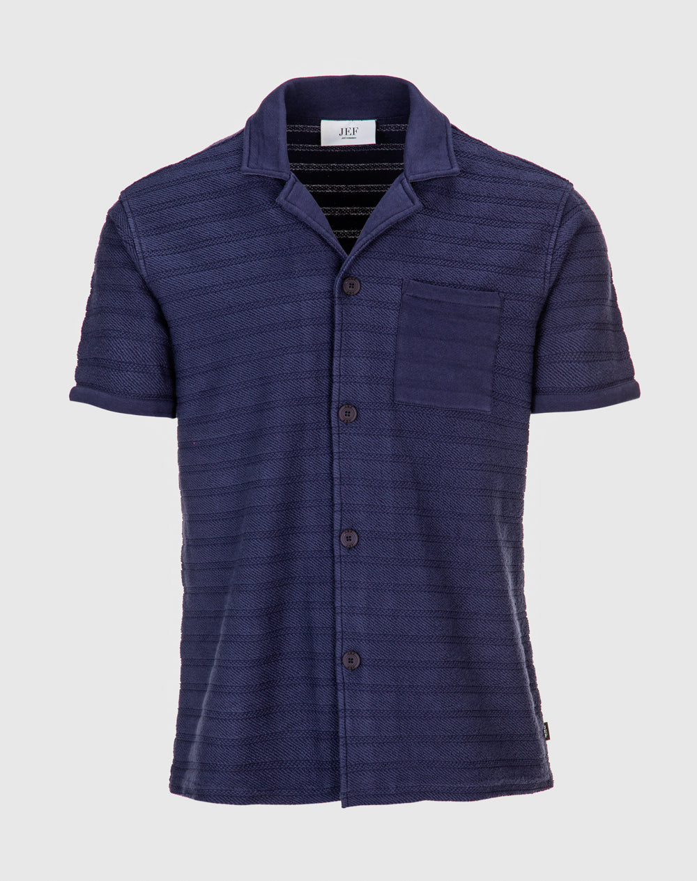 Camisa de manga curta em algodão orgânico. Bolso de chapa. Etiqueta JEF preta na vertical metida na costura lateral.