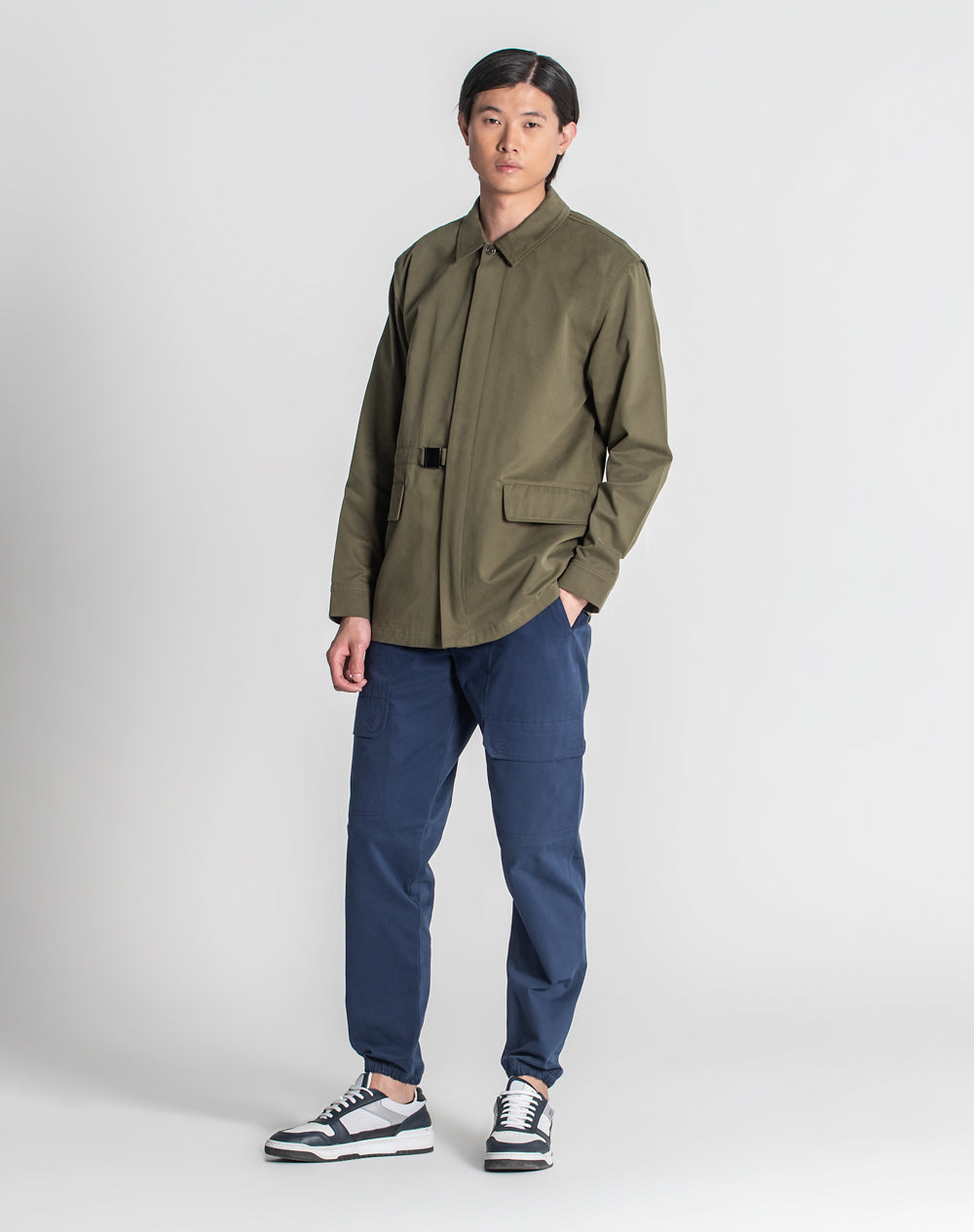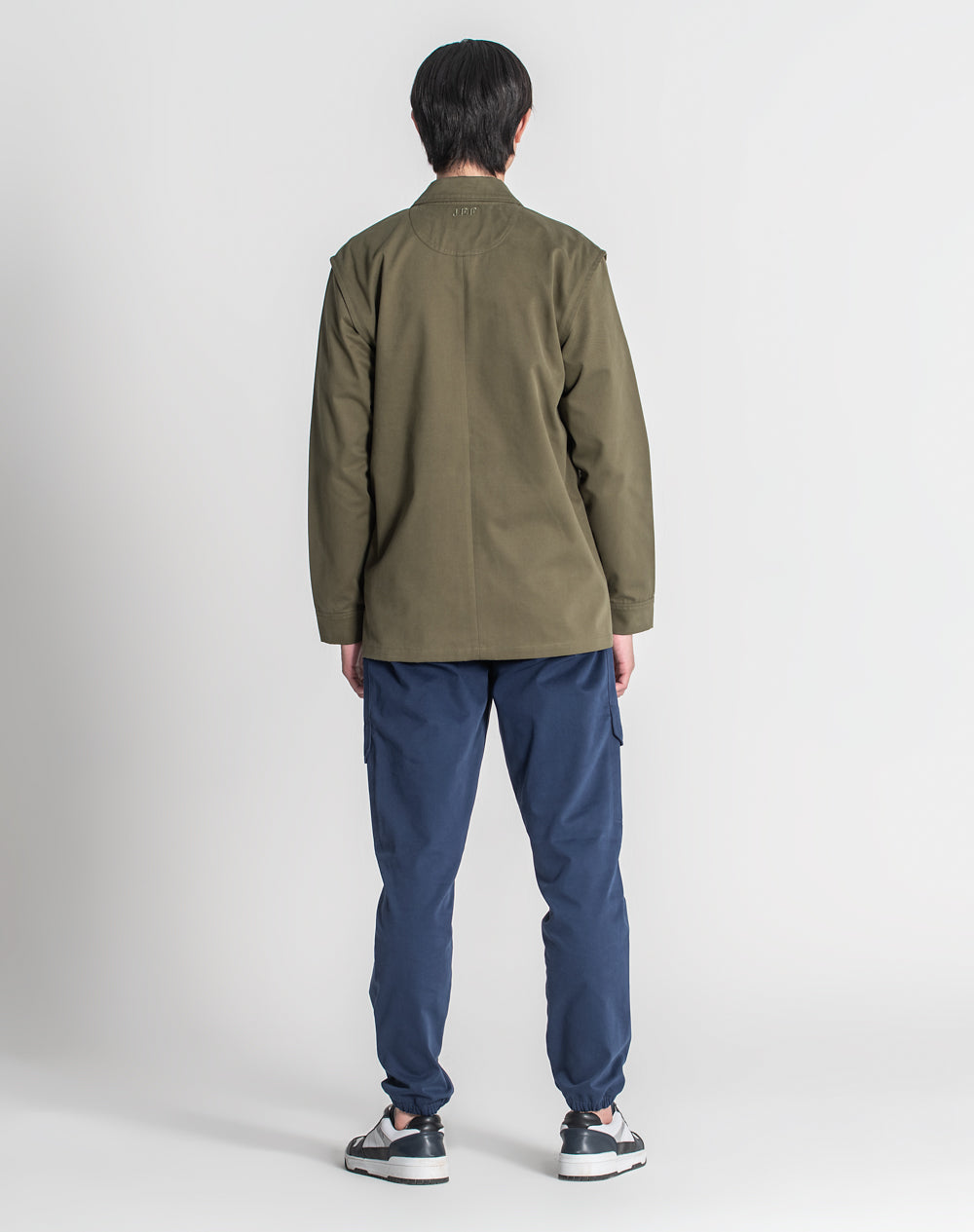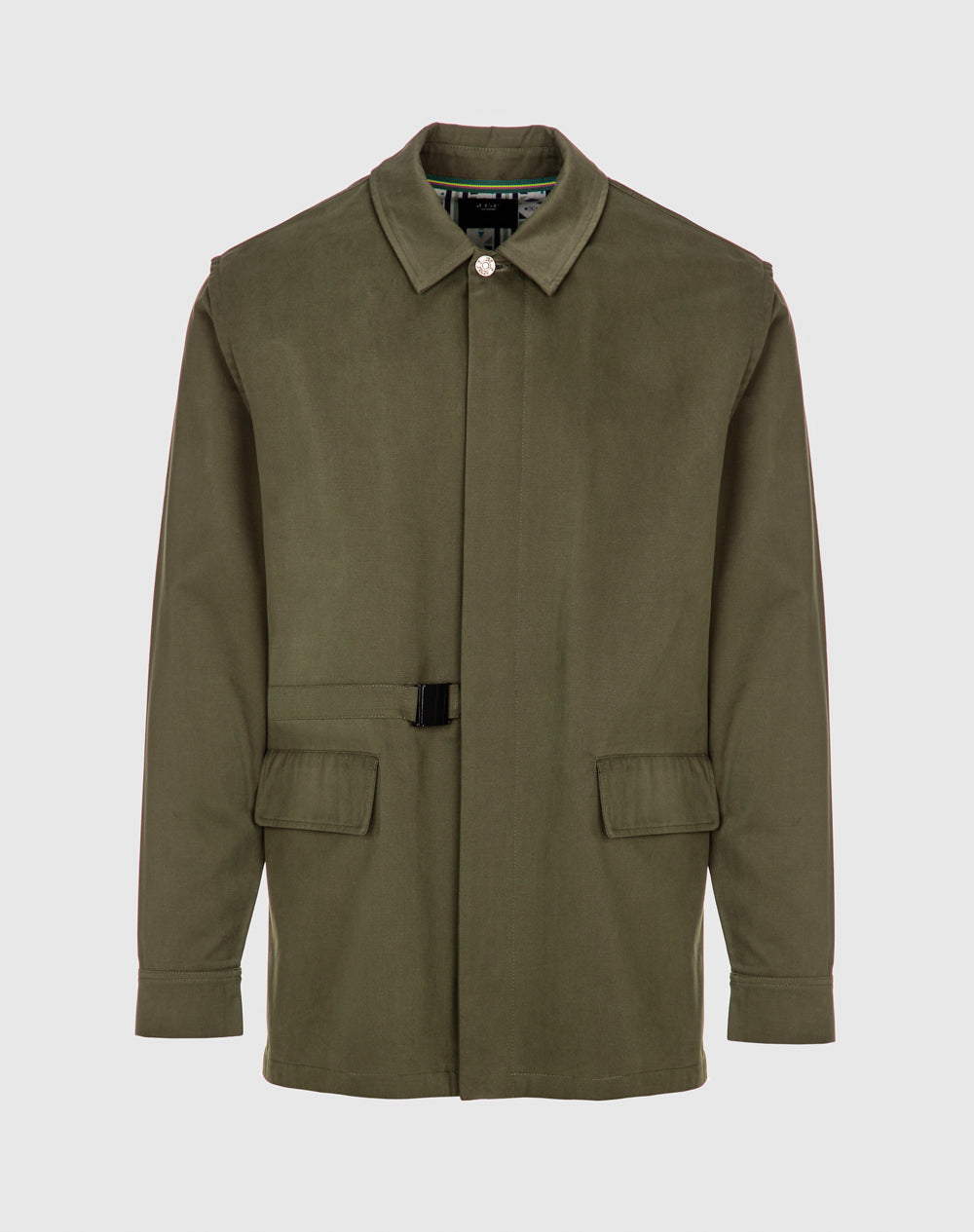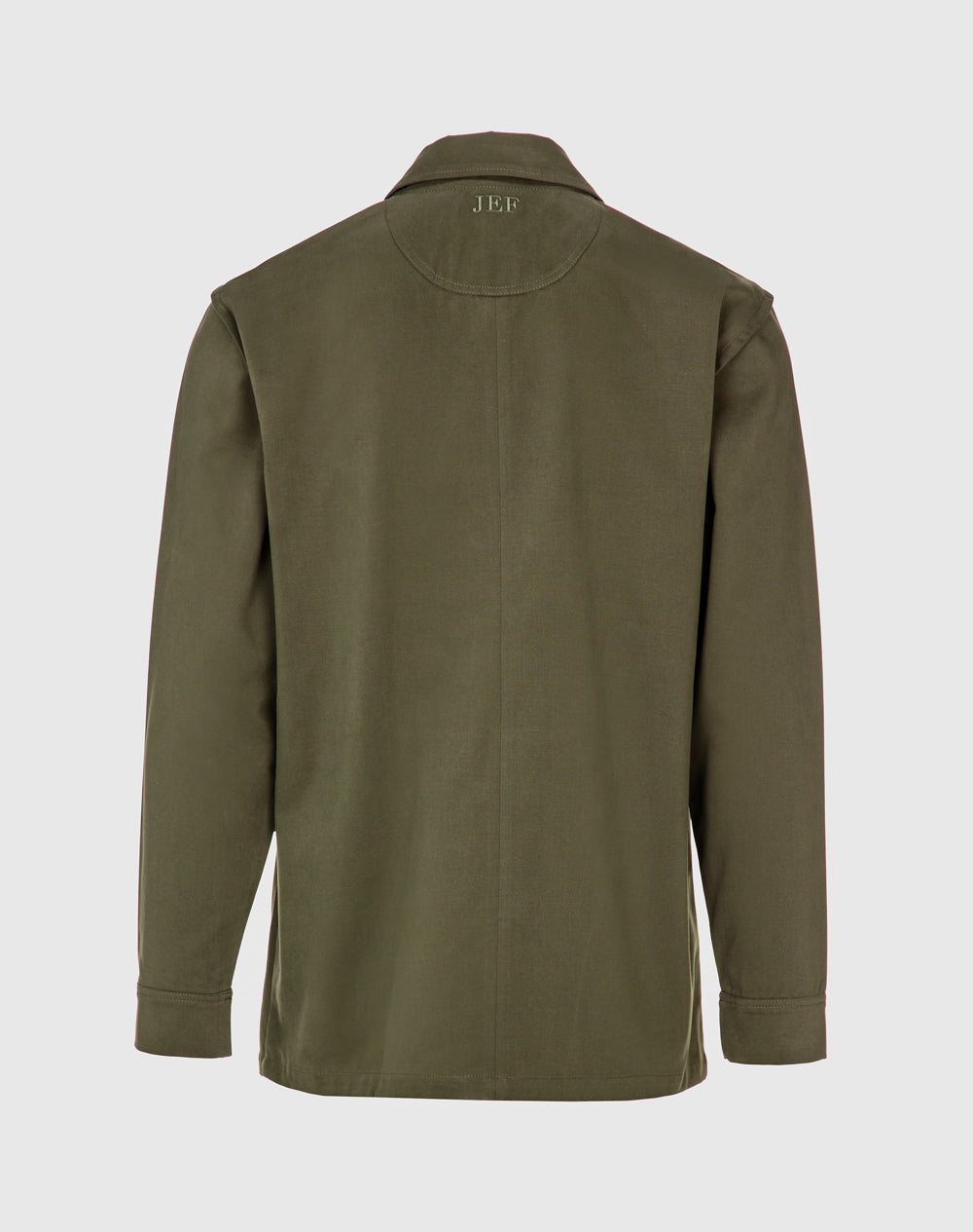 Casaco em algodão orgânico. Abertura através de fecho interior e botão de prego. Cinto decorativo com fivela. Bolsos de pala. Meia-lua e costuras avivadas em tecido estampado. Logótipo JEF bordado nas costas à cor da peça.