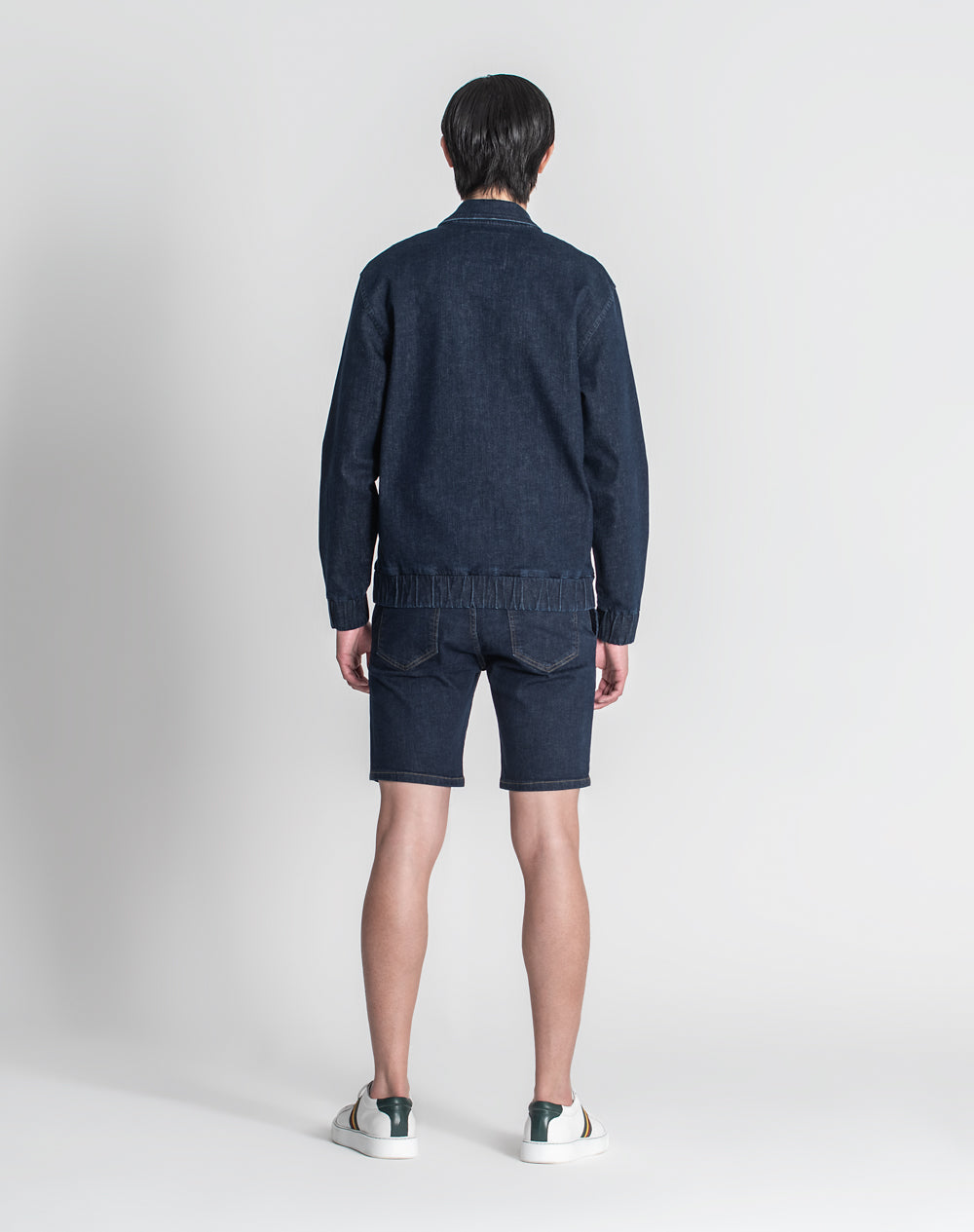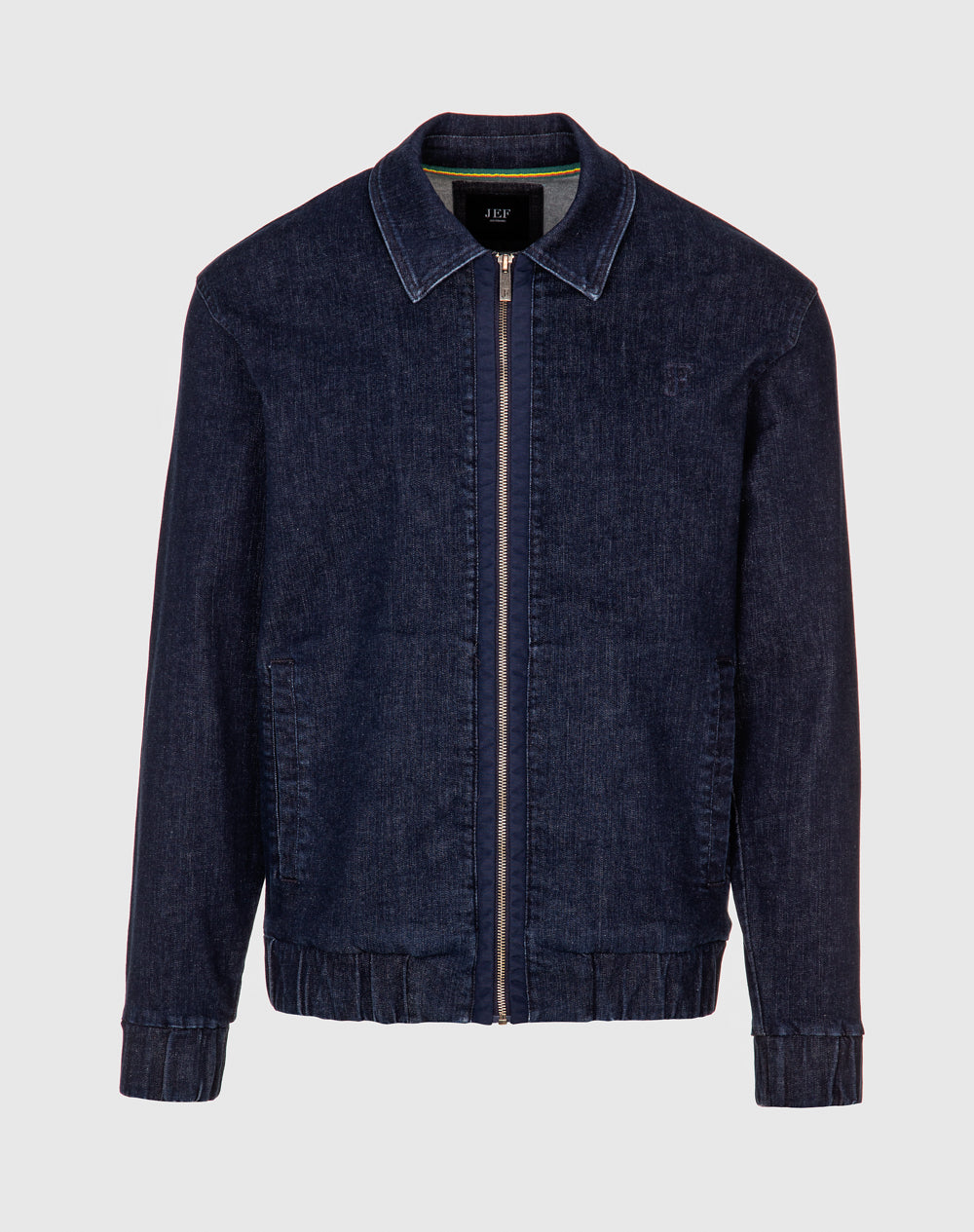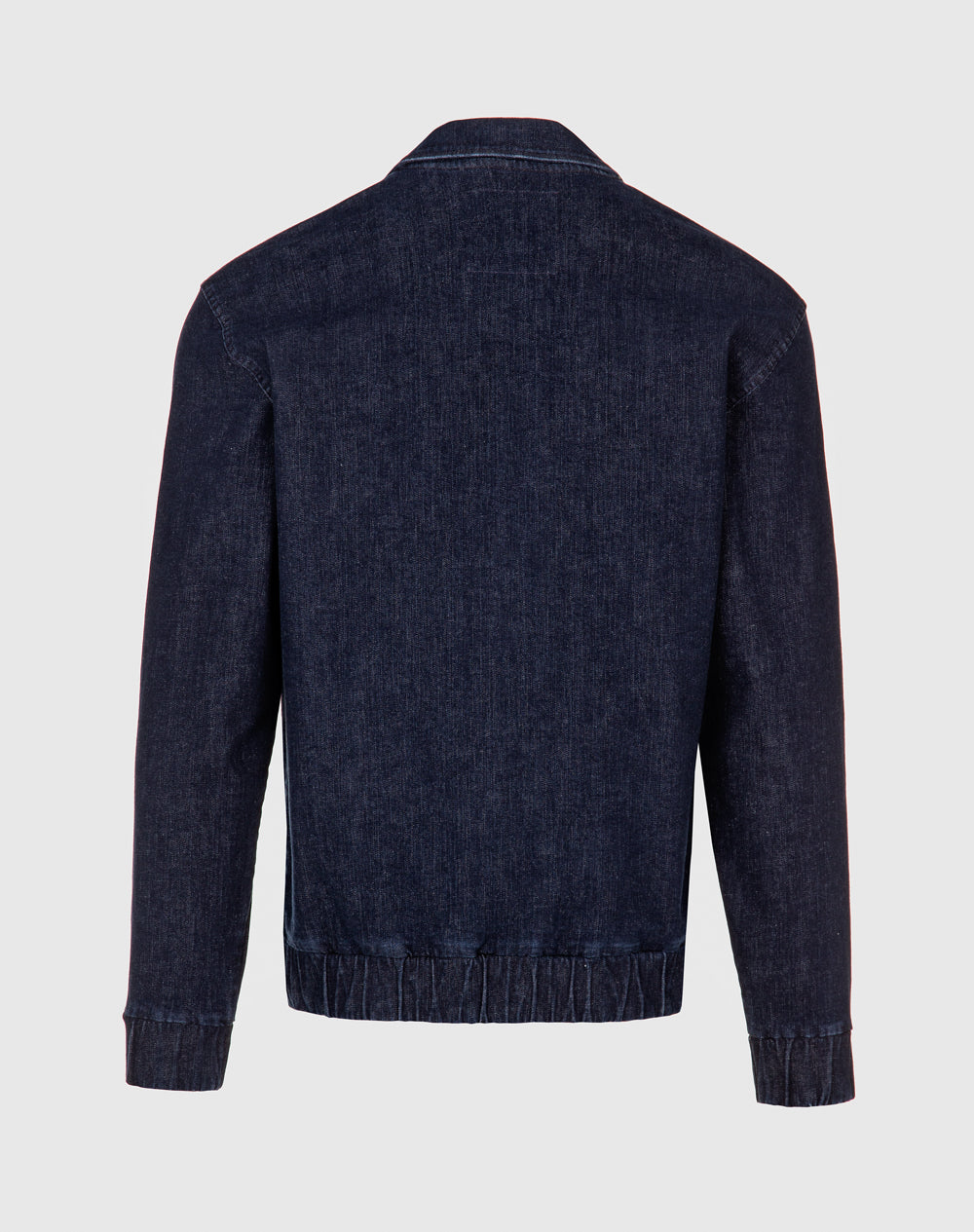 Casaco de denim em algodão orgânico. Gola pontiaguda com cantos arredondados. Abertura no meio-frente por um fecho divisível. Cinto e punhos com elástico. Bolsos de vivo nas laterais e costuras avivadas com tecido estampado. Logótipo da marca através da técnica bordado com enchimento.