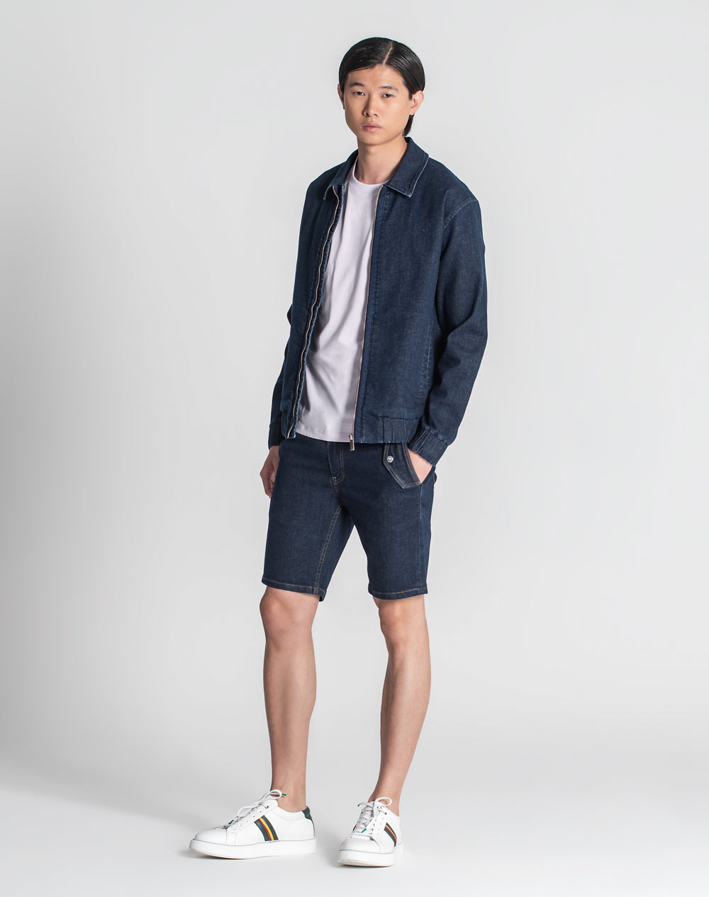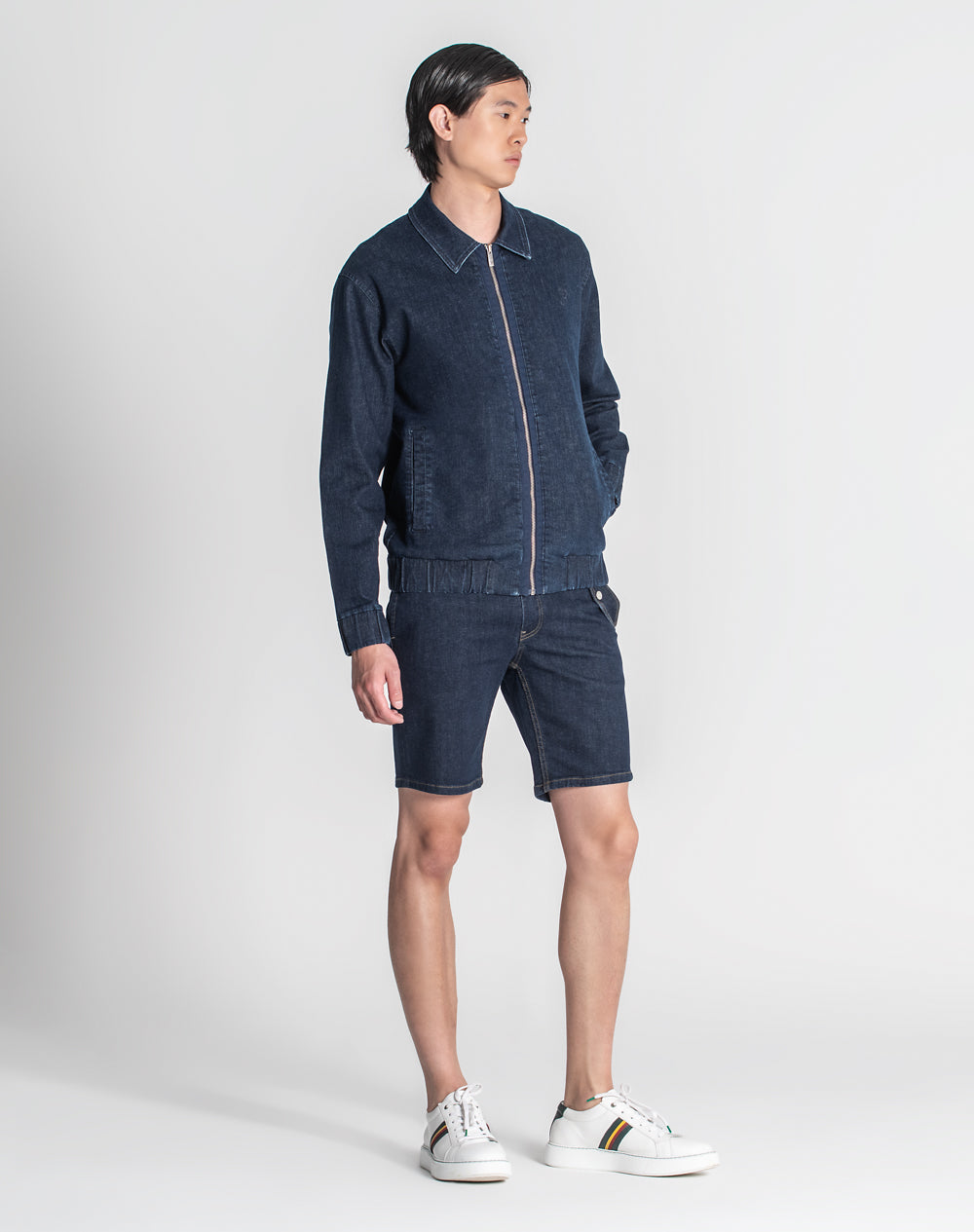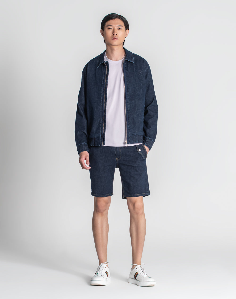 Casaco de denim em algodão orgânico. Gola pontiaguda com cantos arredondados. Abertura no meio-frente por um fecho divisível. Cinto e punhos com elástico. Bolsos de vivo nas laterais e costuras avivadas com tecido estampado. Logótipo da marca através da técnica bordado com enchimento.