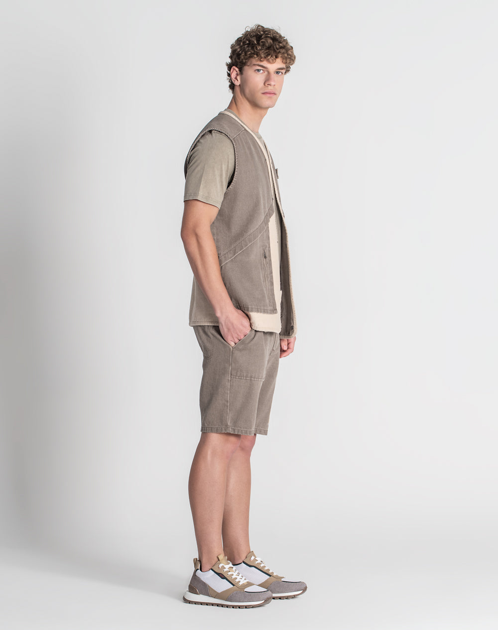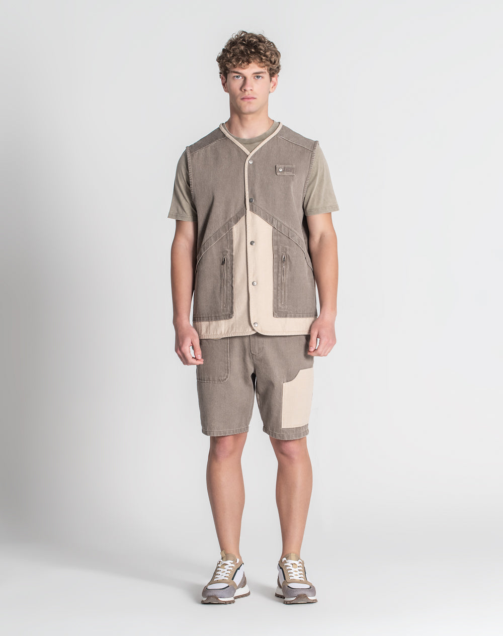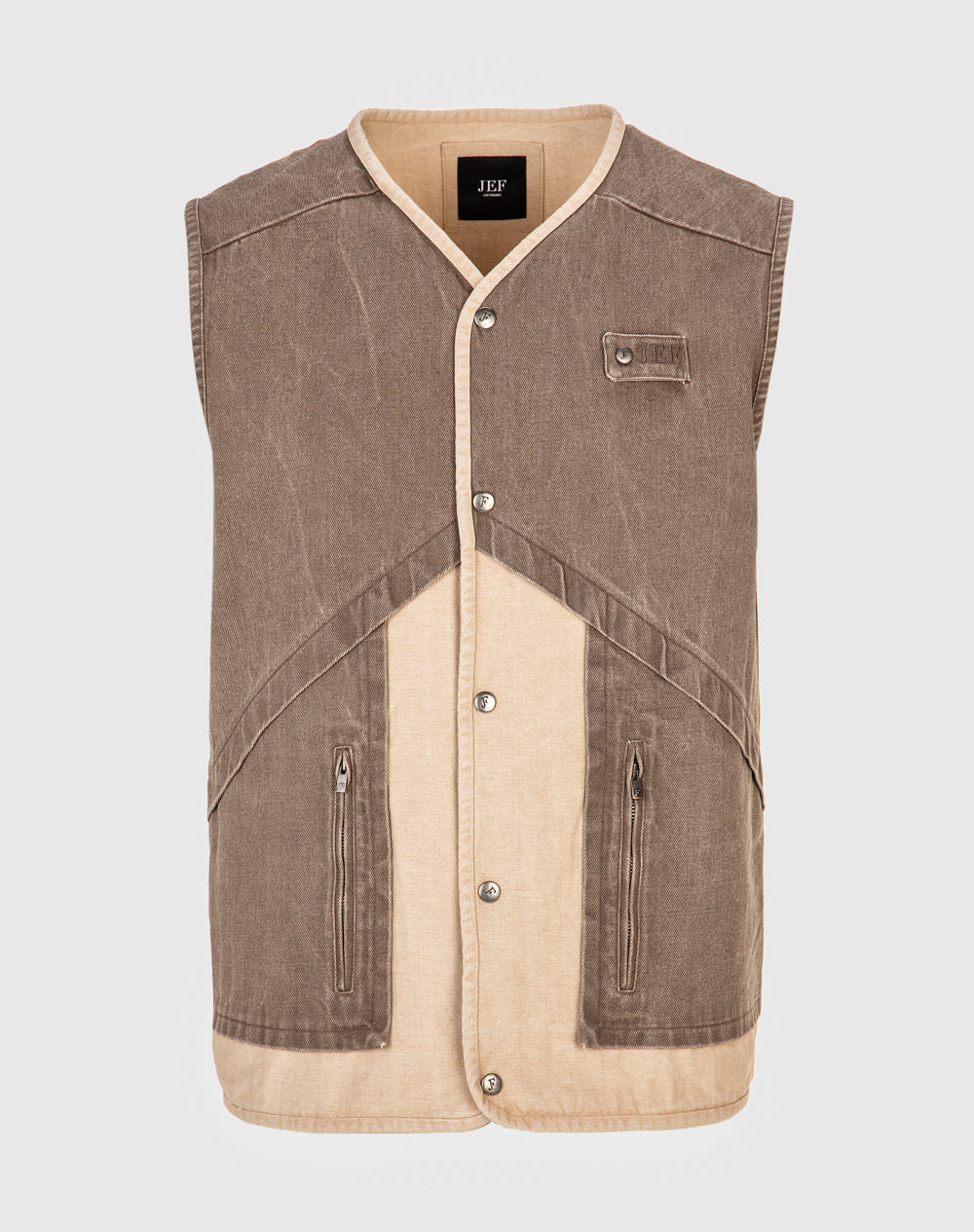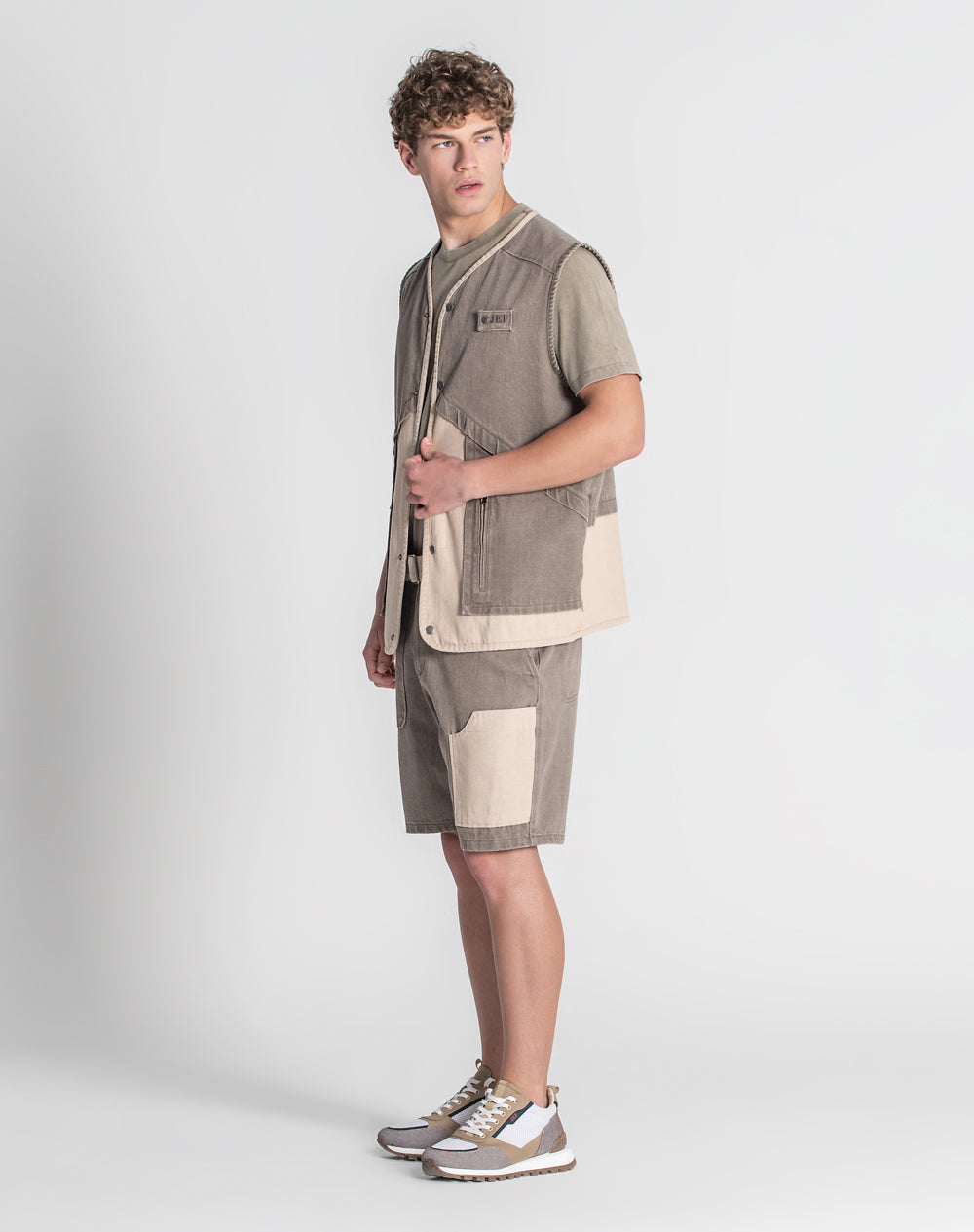 Colete em denim 100% algodão orgânico. Estilo regular fit. Bolsos laterais com abertura através de fecho. Abertura no meio frente através de molas. Logótipo JEF bordado à cor da peça. Interior da peça com costuras avivadas em tecido estampado.