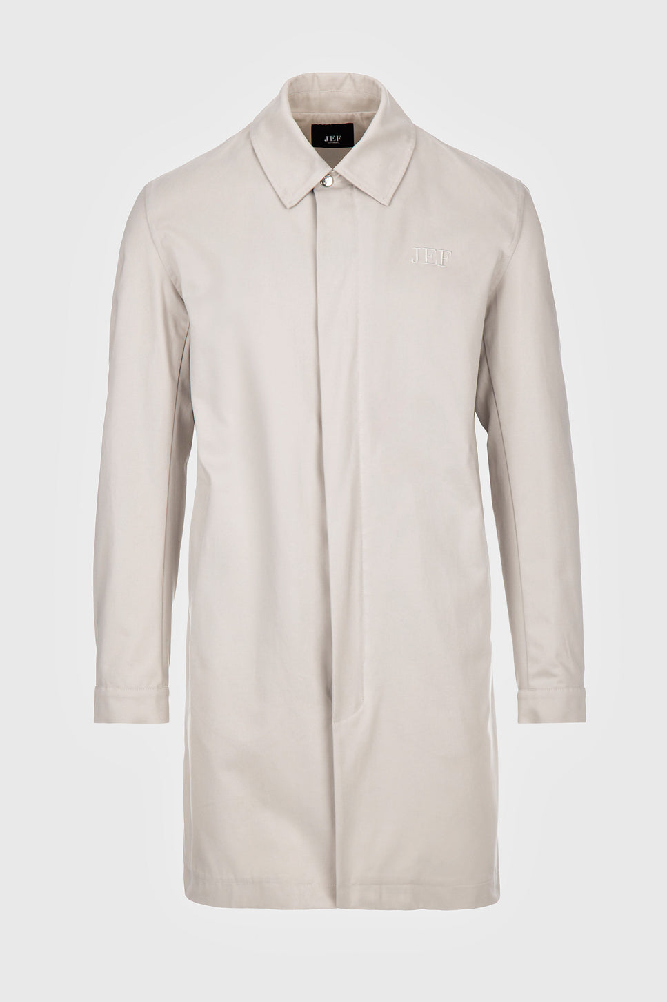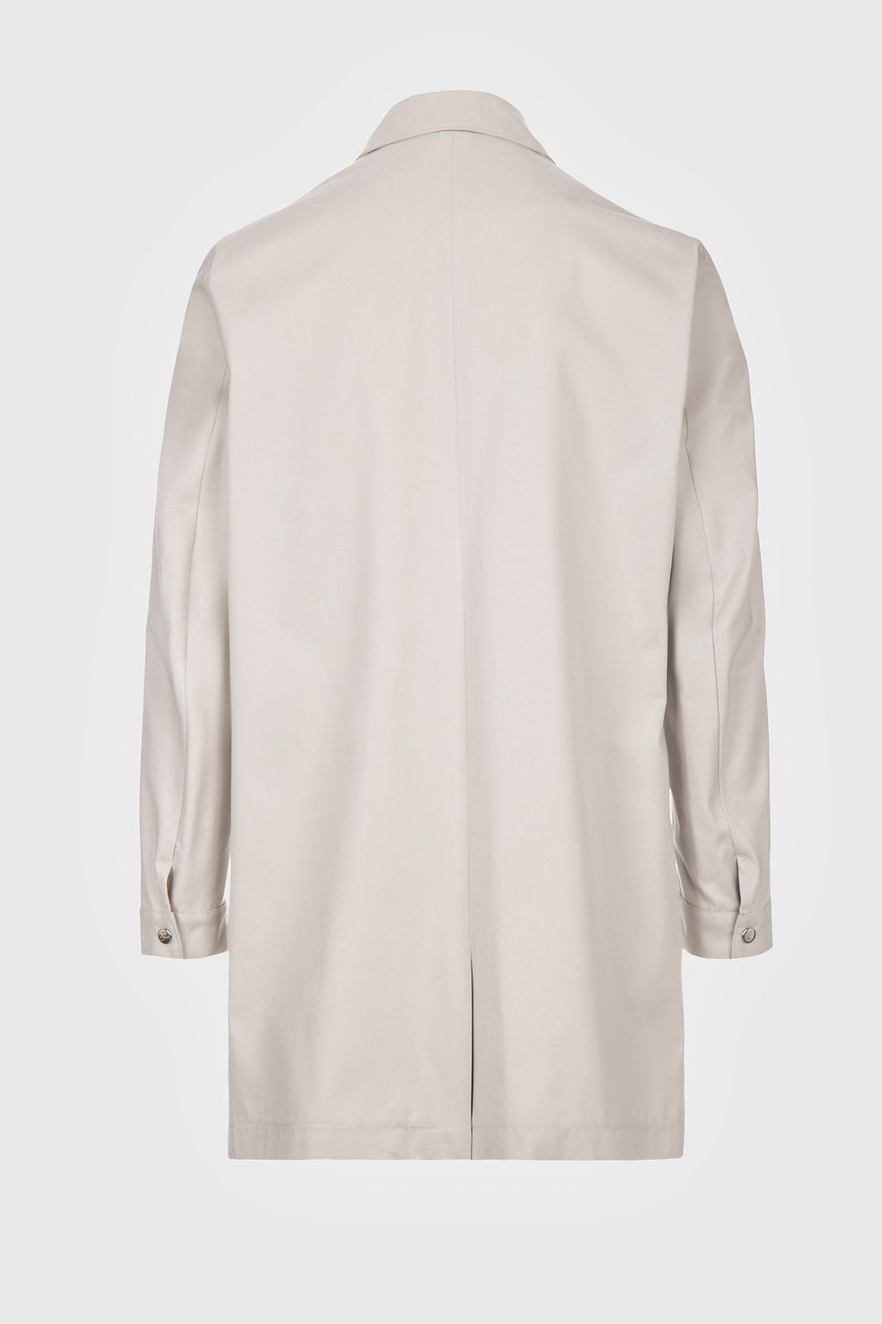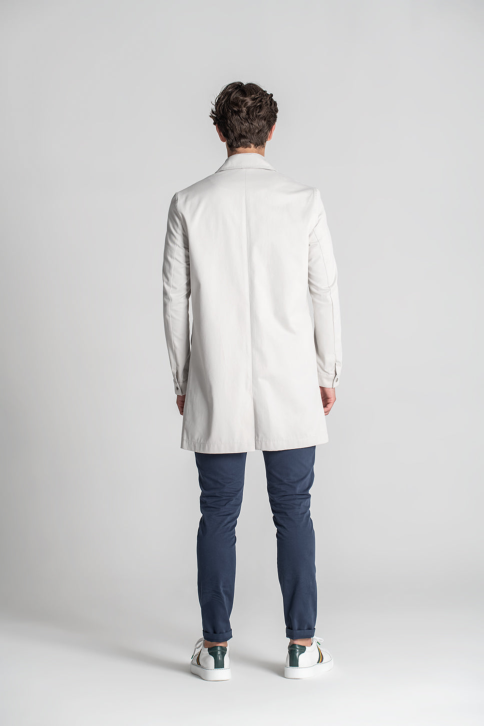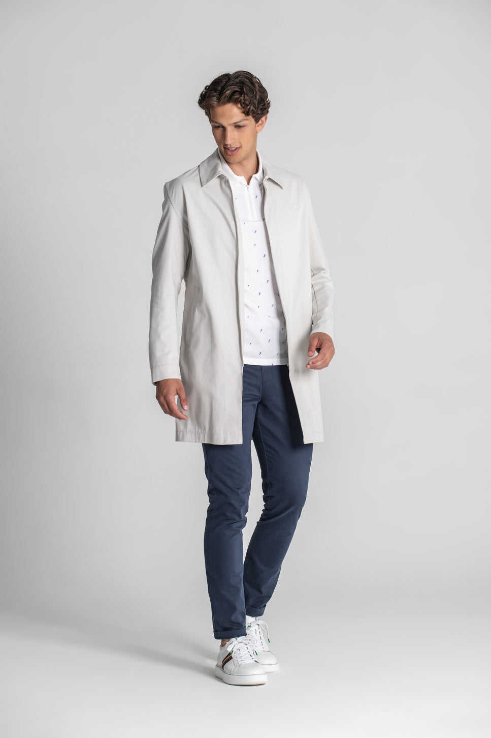 Gabardine com fecho interior e mola. Bolsos de vivo nas laterais. Costuras avivadas e bolsos interiores forrados com tecido estampado (popelina orgânica com acabamento seda) alusivo ao conceito da coleção. Racha no meio costas. Logótipo da marca bordado à cor da peça.