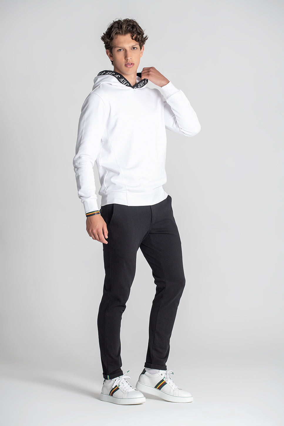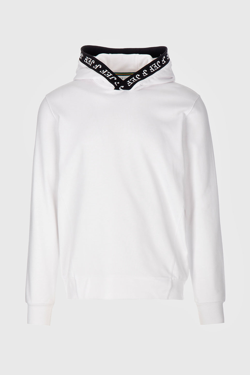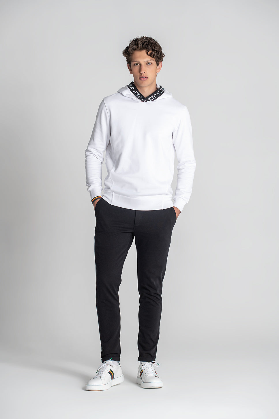 Hoodie com capuz e sem cordões. Tira-reta à volta do capuz com logótipos da marca. Etiqueta do logótipo JEF no meio frente costurada à volta com ponto Zig Zag à cor da peça.