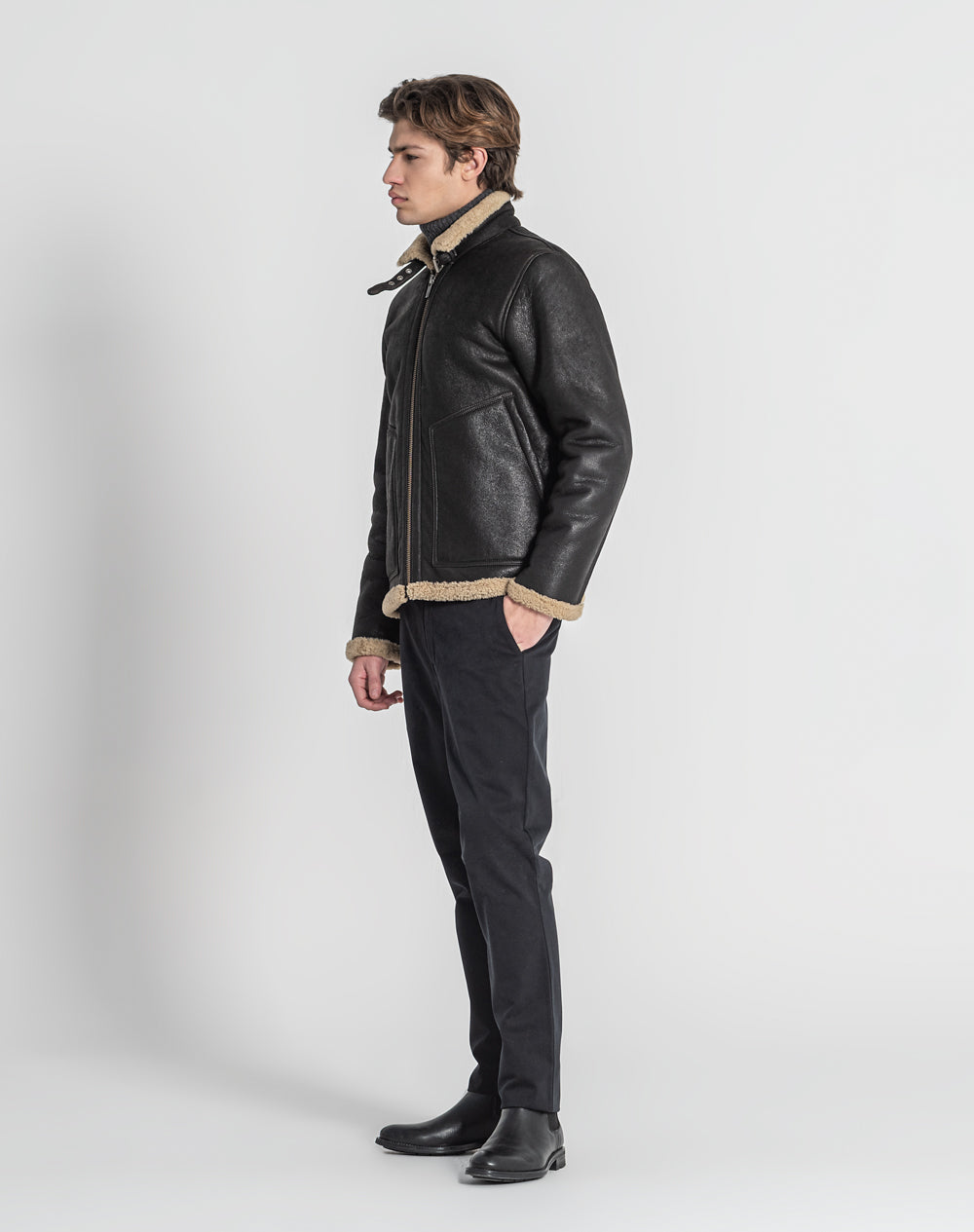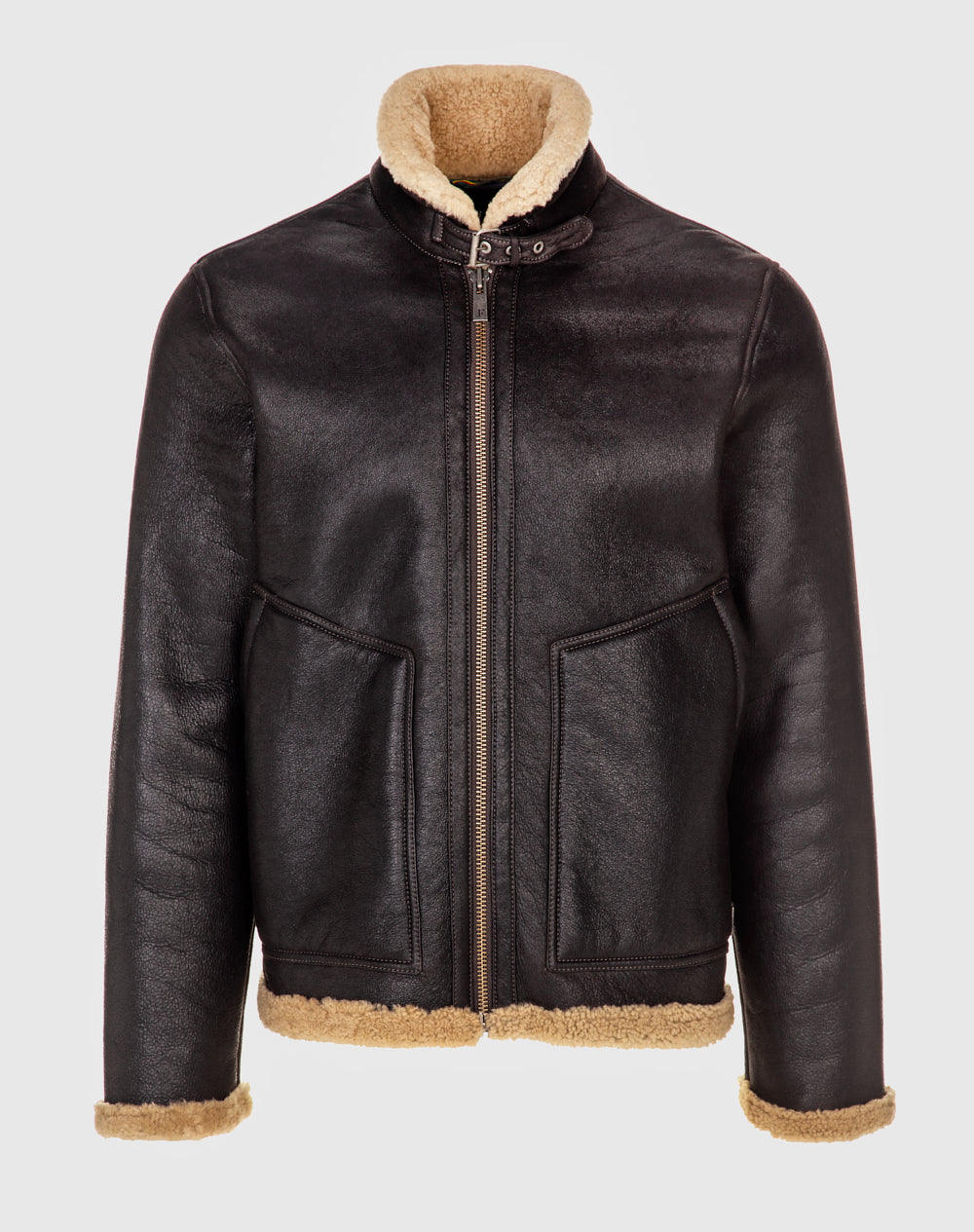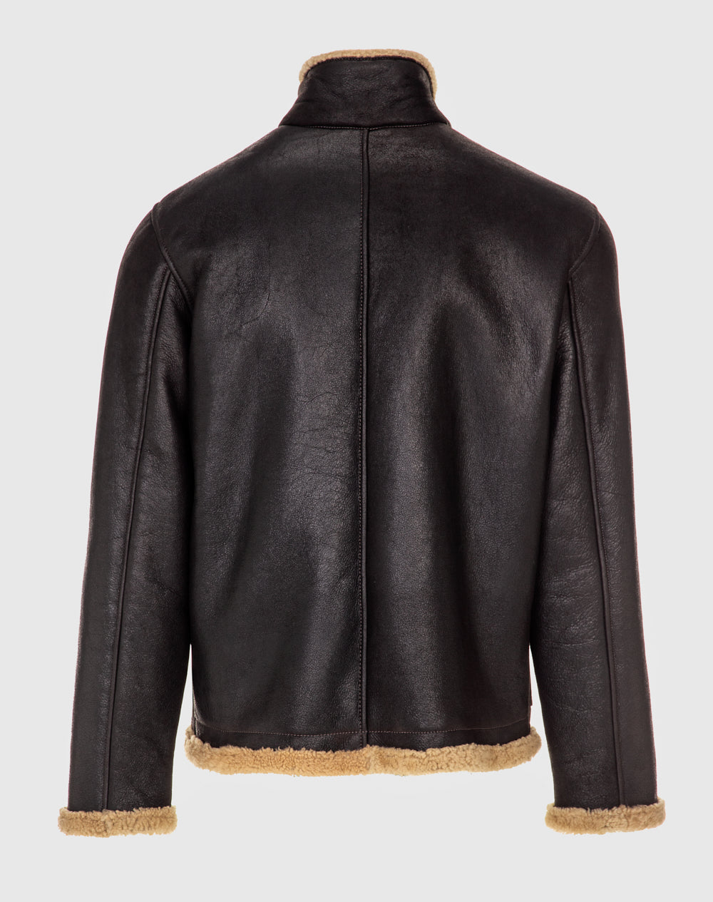 Casaco estilo aviador 100% pele. Bolsos grandes e abertura meio frente através de fecho metálico prata velho. Fivela e ilhós contornam a gola para melhor ajuste. Argola no interior da peça através da fita de nastro com cores da marca. Chapa metálica com logótipo da marca.