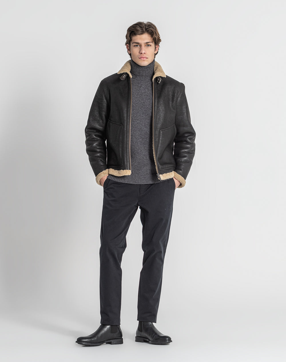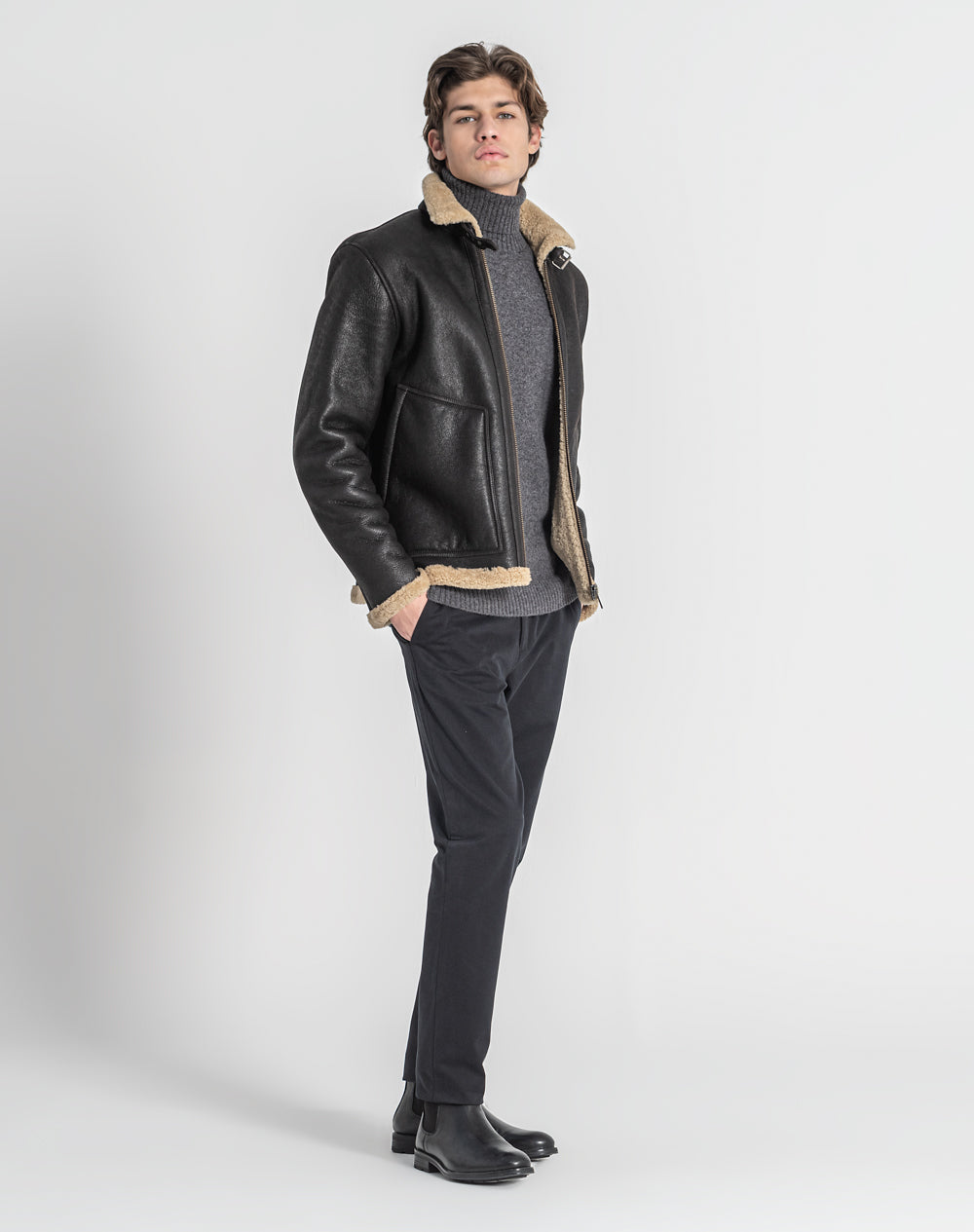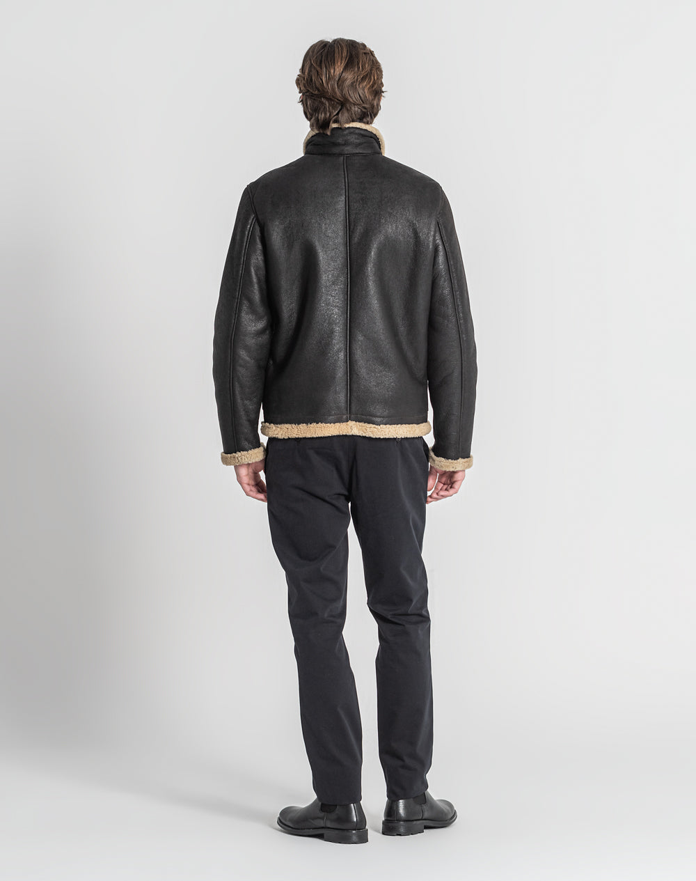 Casaco estilo aviador 100% pele. Bolsos grandes e abertura meio frente através de fecho metálico prata velho. Fivela e ilhós contornam a gola para melhor ajuste. Argola no interior da peça através da fita de nastro com cores da marca. Chapa metálica com logótipo da marca.