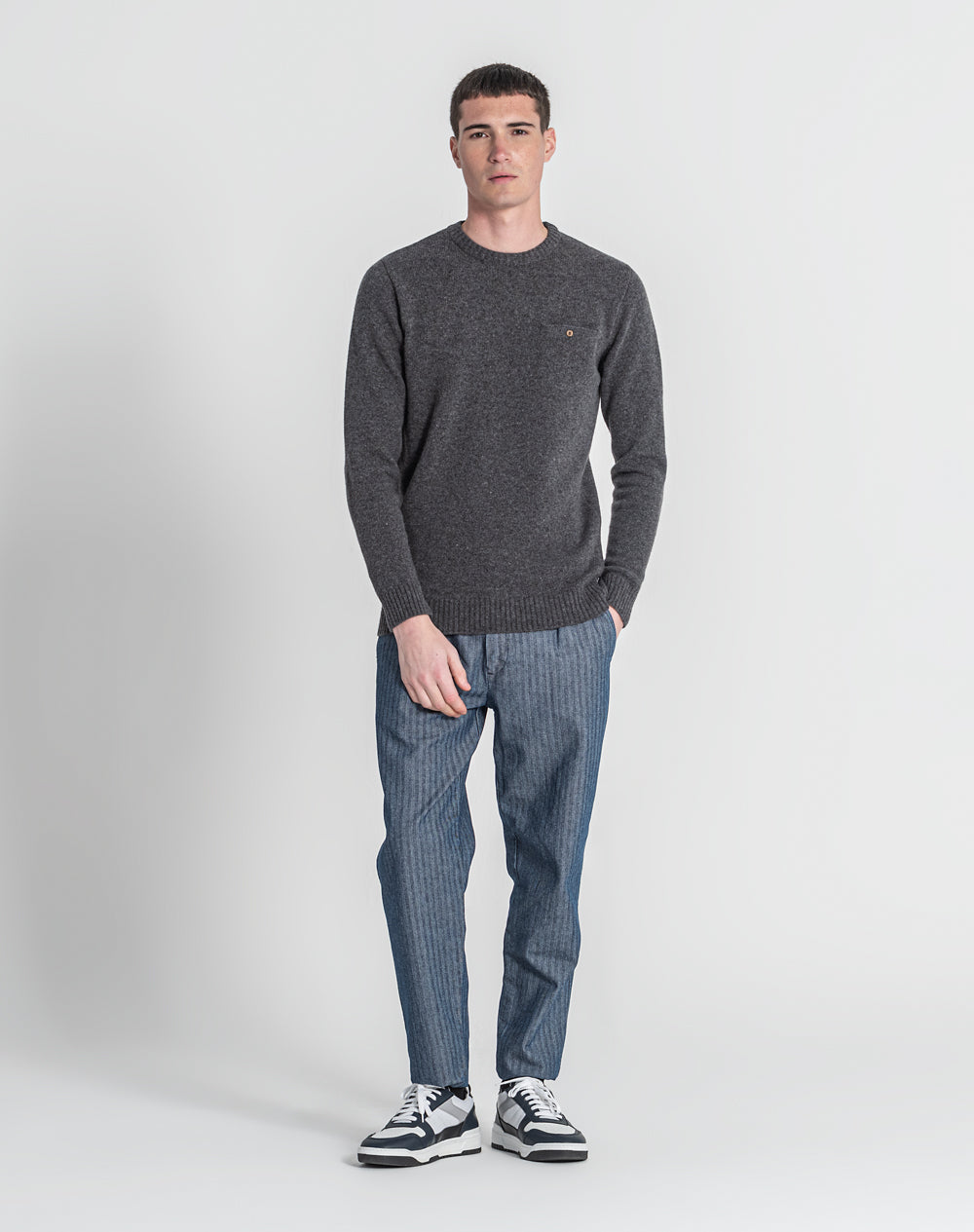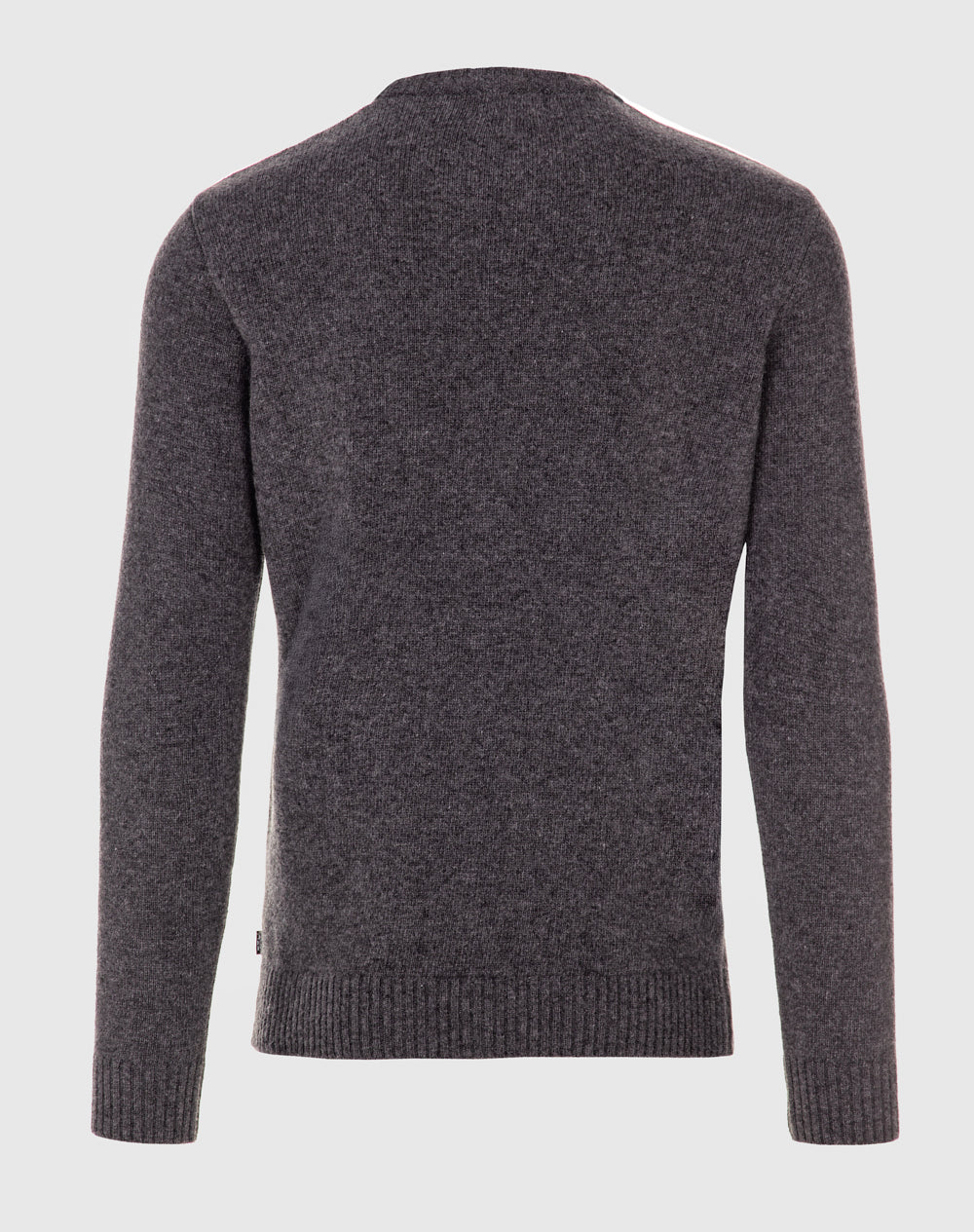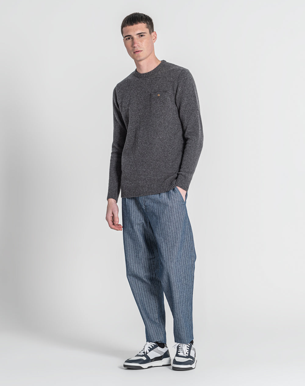 Sweat decote redondo em malha tricotada. Bolso superior com botão de madeira. Etiqueta da marca na lateral.