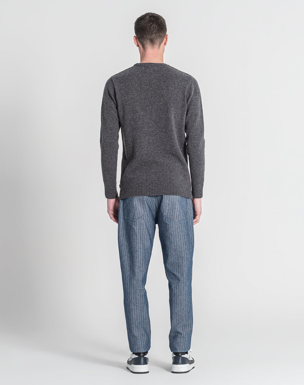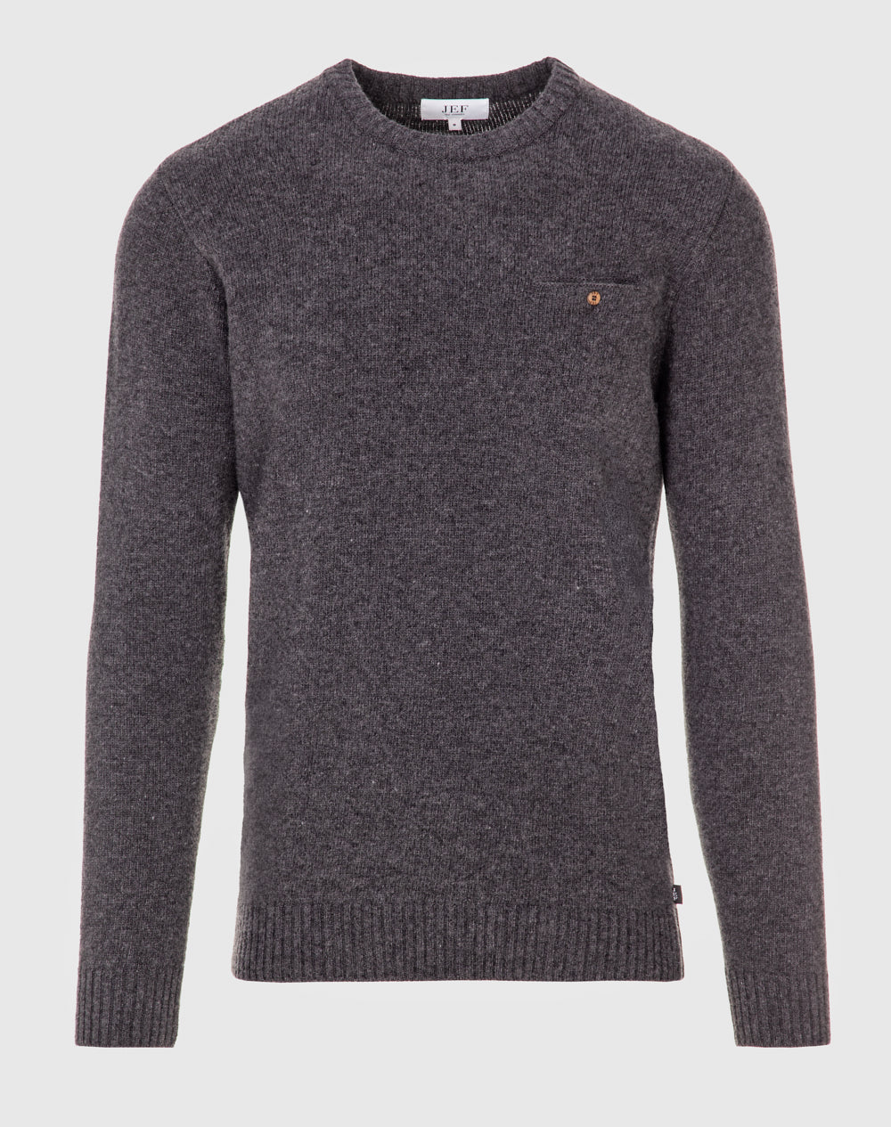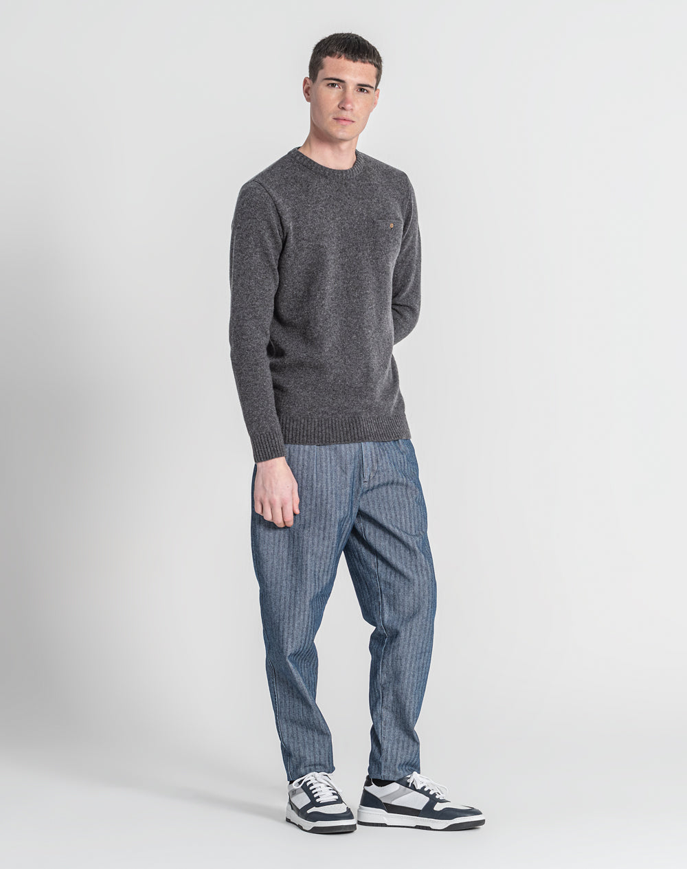 Sweat decote redondo em malha tricotada. Bolso superior com botão de madeira. Etiqueta da marca na lateral.