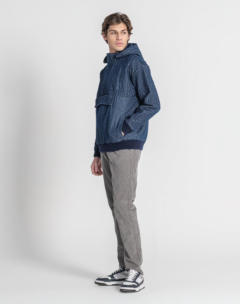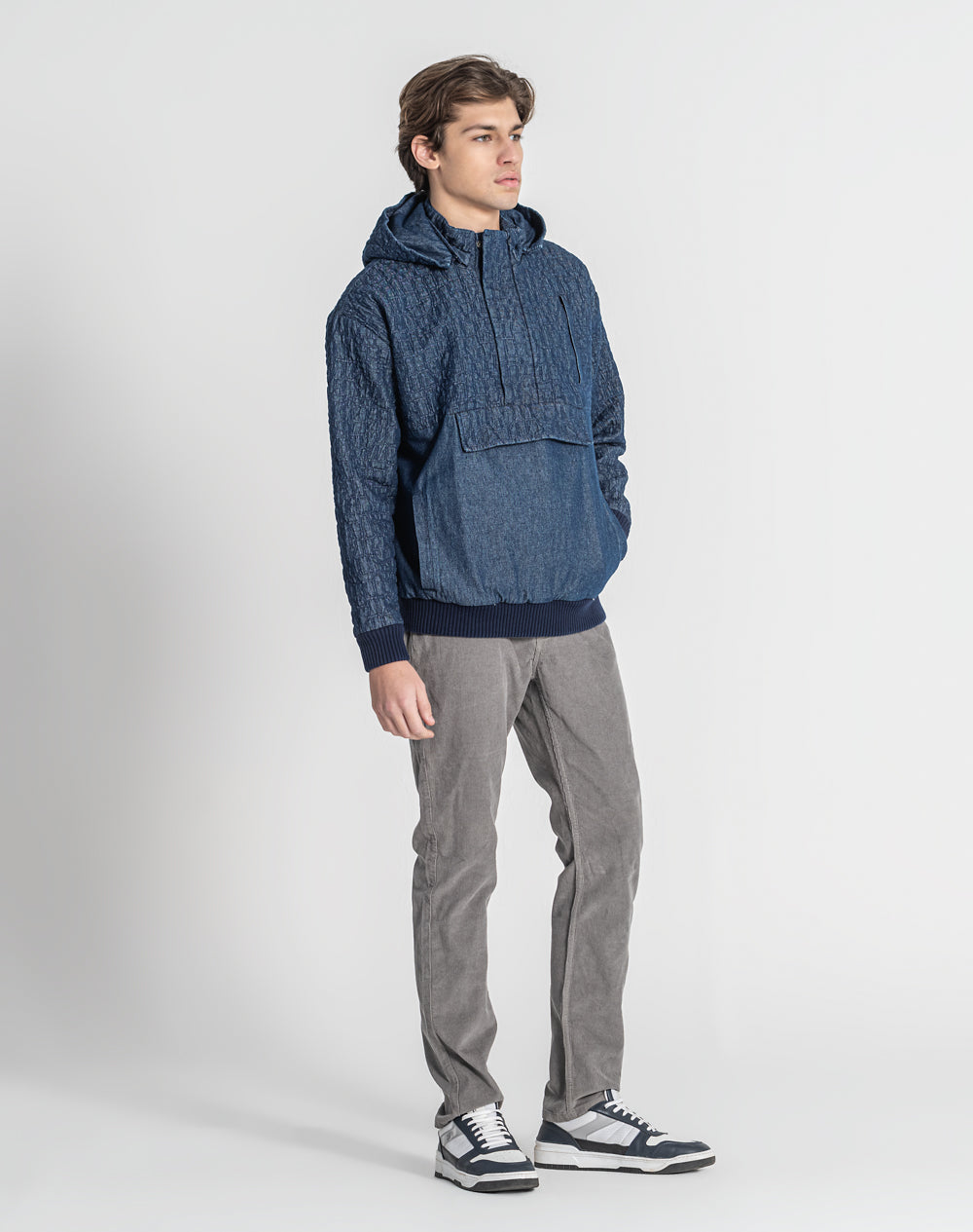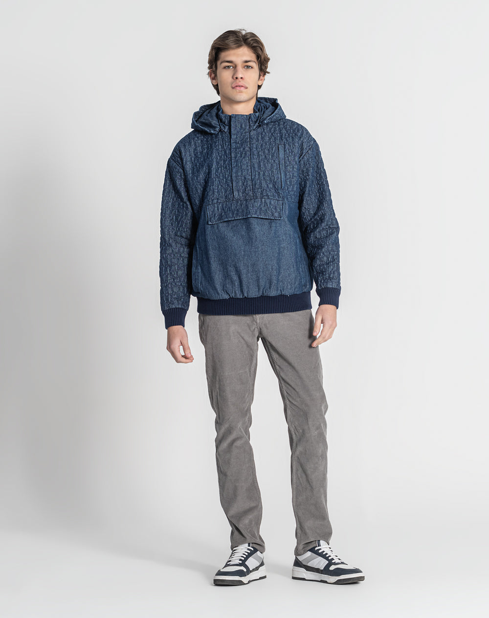 Anorak em denim acolchoado com capuz removível e manga normal. Abertura meio-frente através de fecho e molas interiores. Bolsos de vivo nas laterais. Bolso de vivo superior. Bolso central com pala.