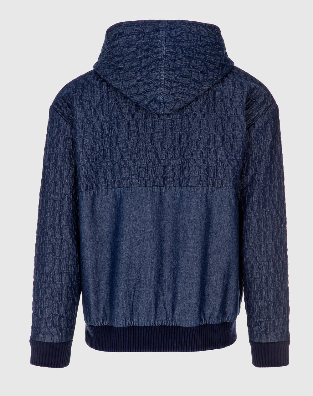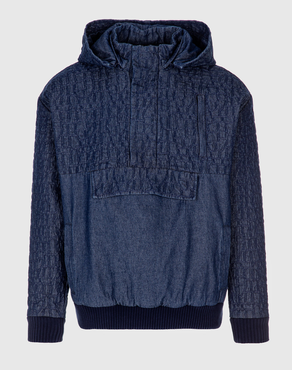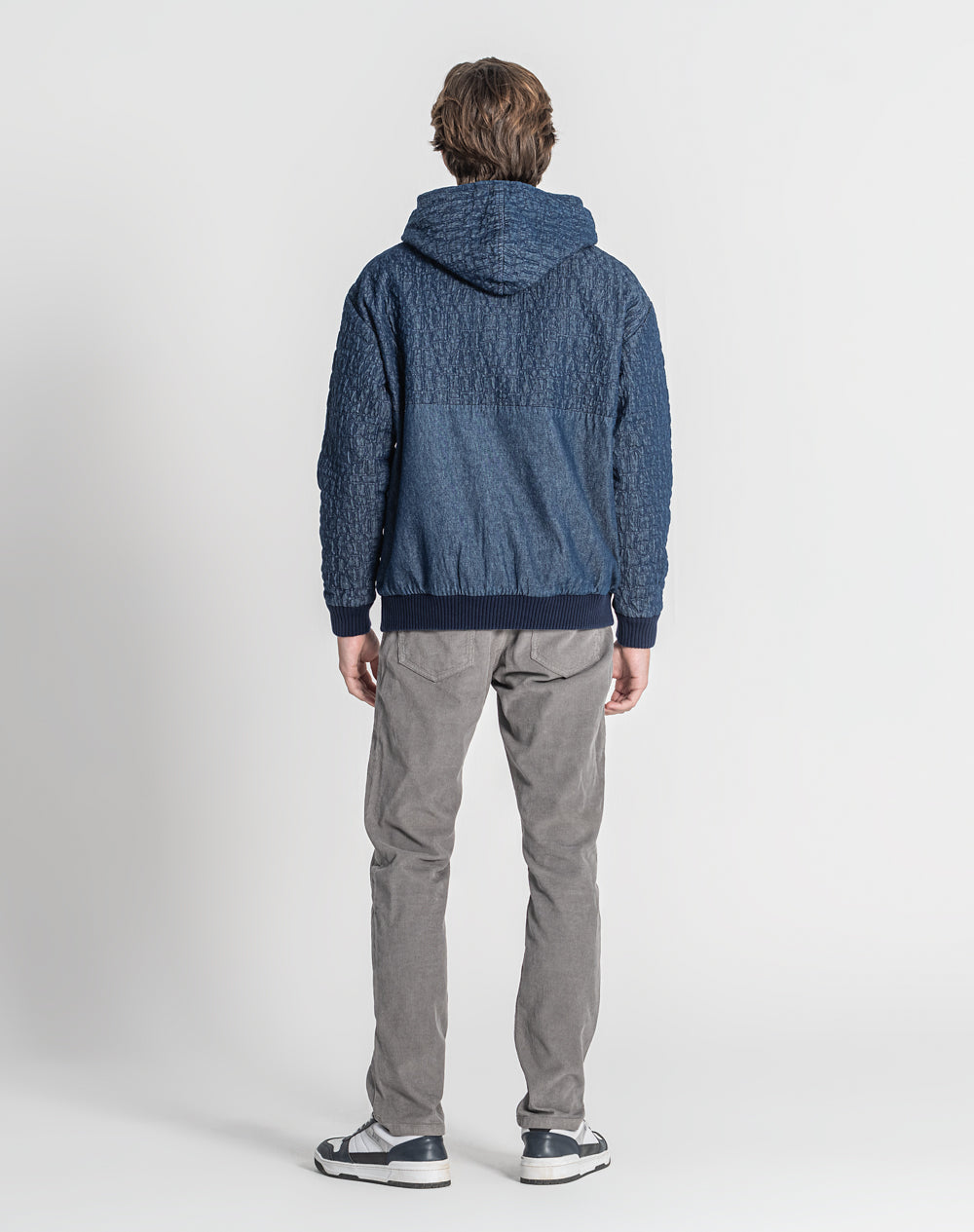 Anorak em denim acolchoado com capuz removível e manga normal. Abertura meio-frente através de fecho e molas interiores. Bolsos de vivo nas laterais. Bolso de vivo superior. Bolso central com pala.