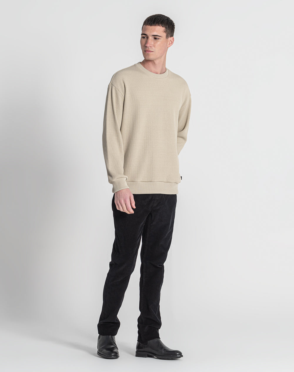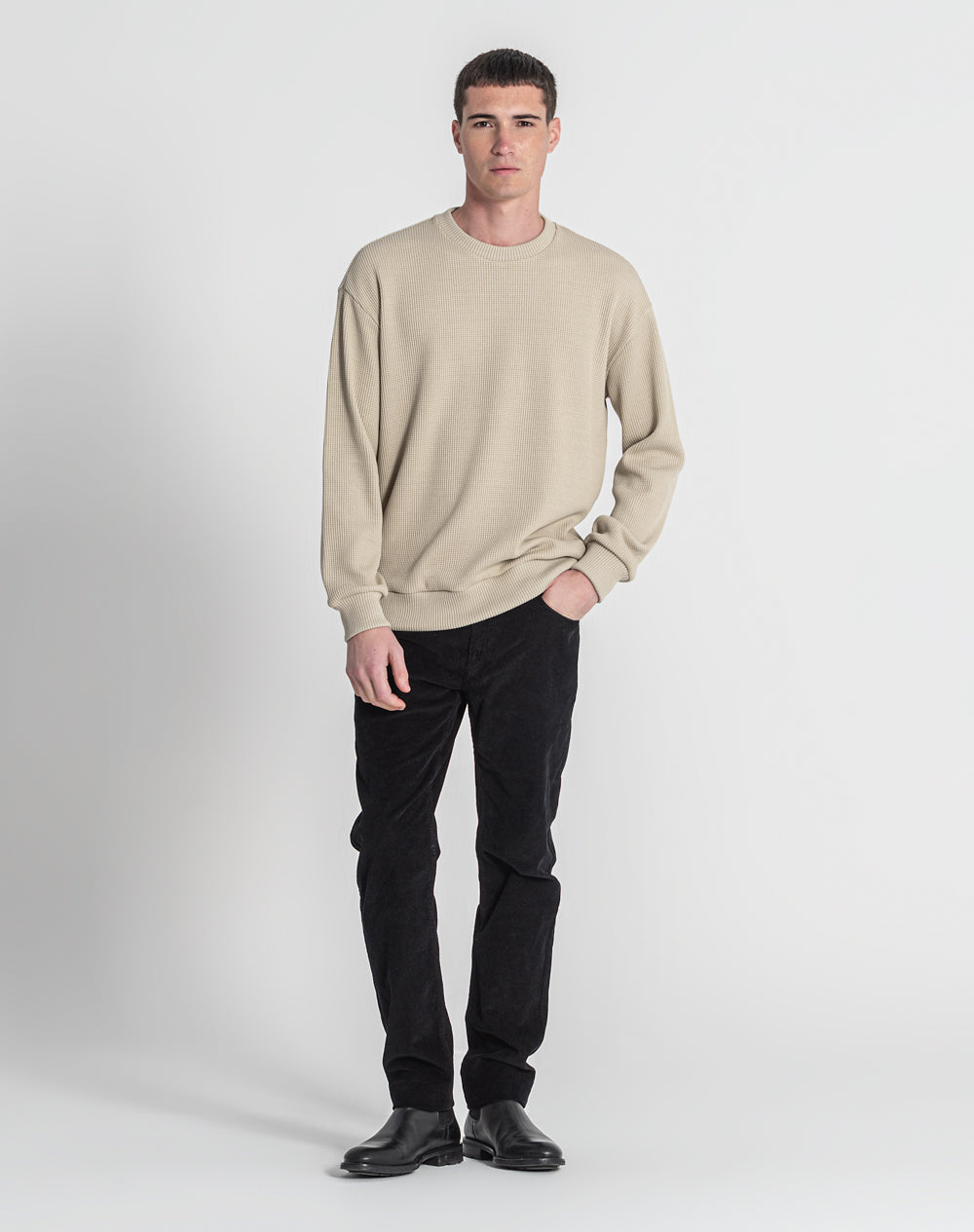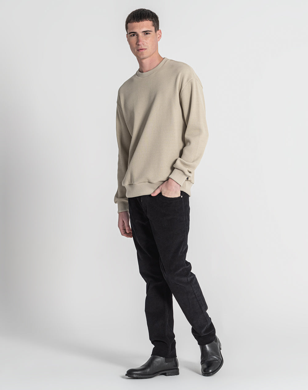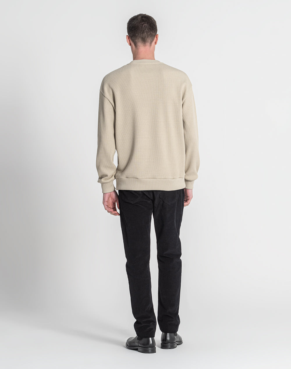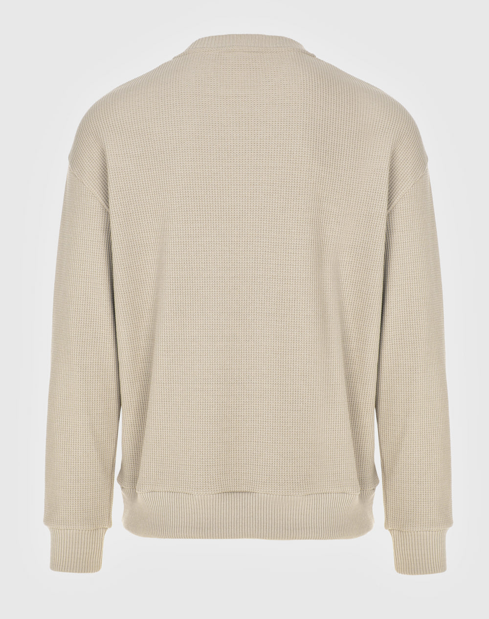 Sweatshirt decote redondo em malha jacquard. Etiqueta JEF preta na vertical metida nas costuras.