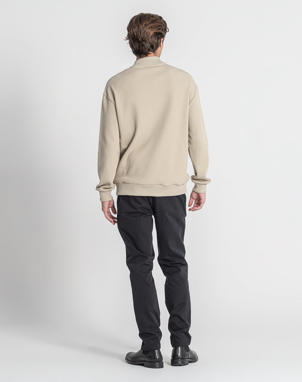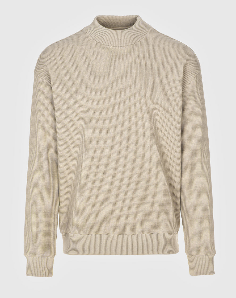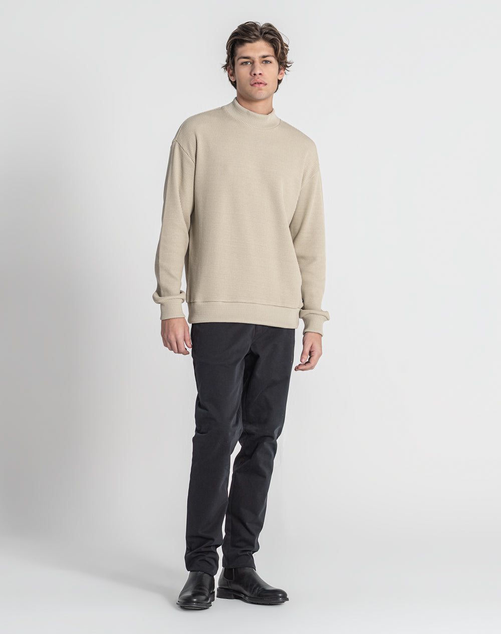 Sweatshirt gola alta em malha jacquard. Etiqueta JEF preta na vertical metida nas costuras.