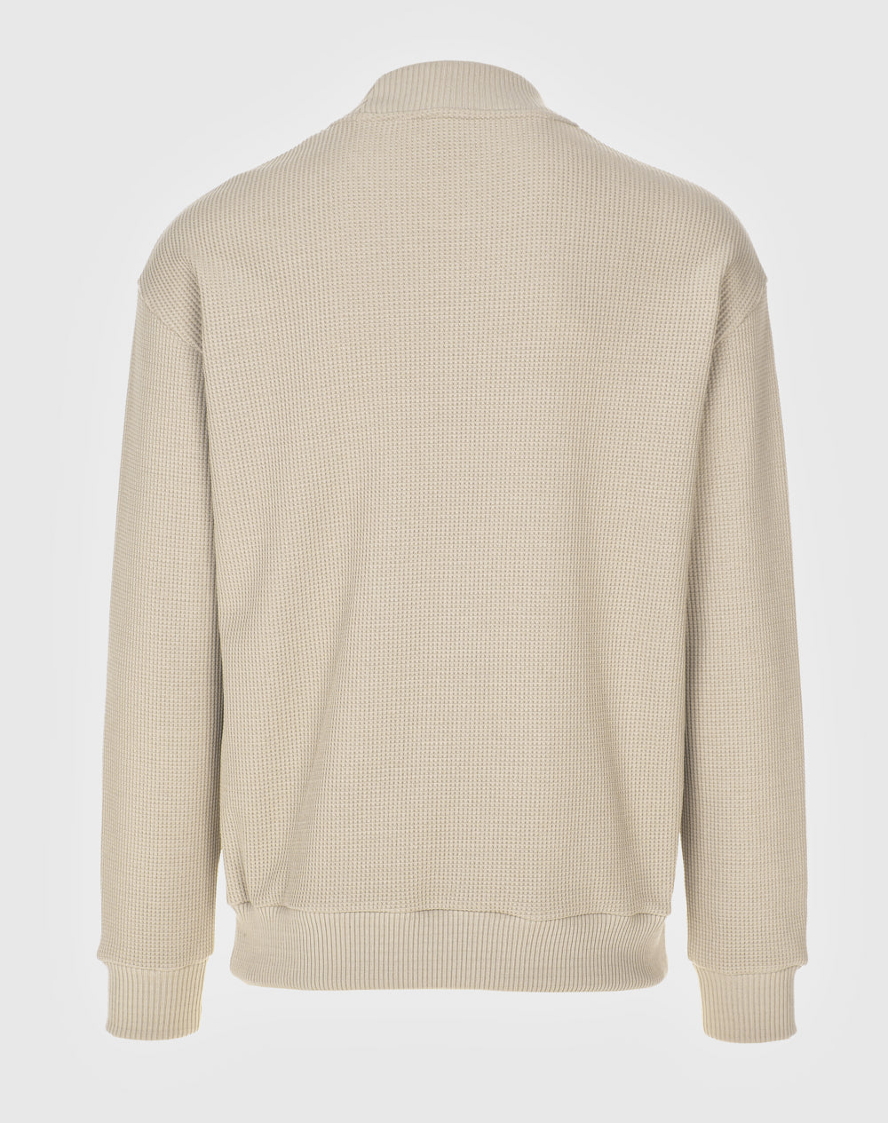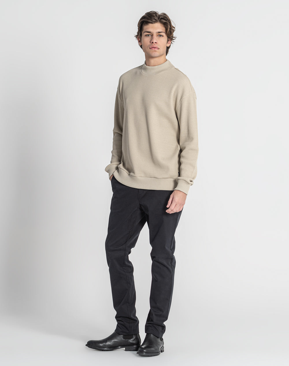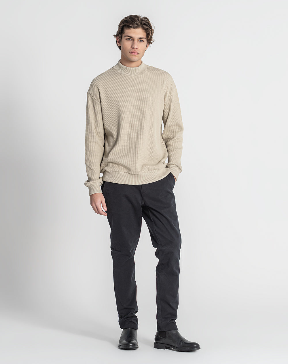 Sweatshirt gola alta em malha jacquard. Etiqueta JEF preta na vertical metida nas costuras.