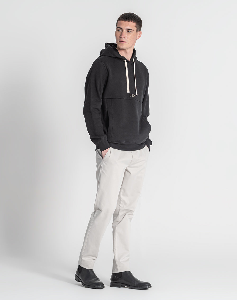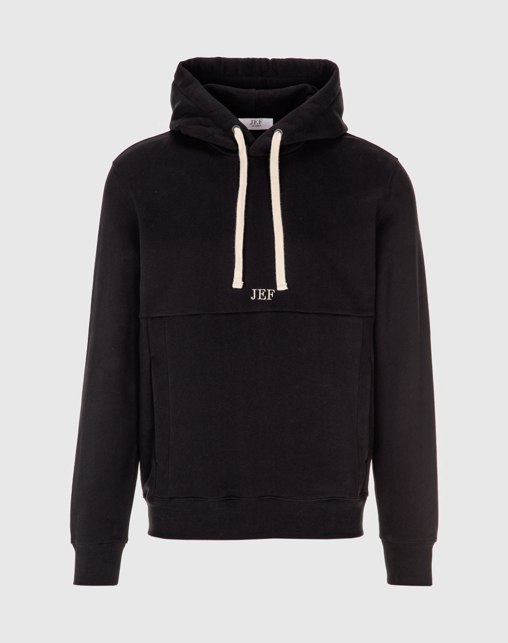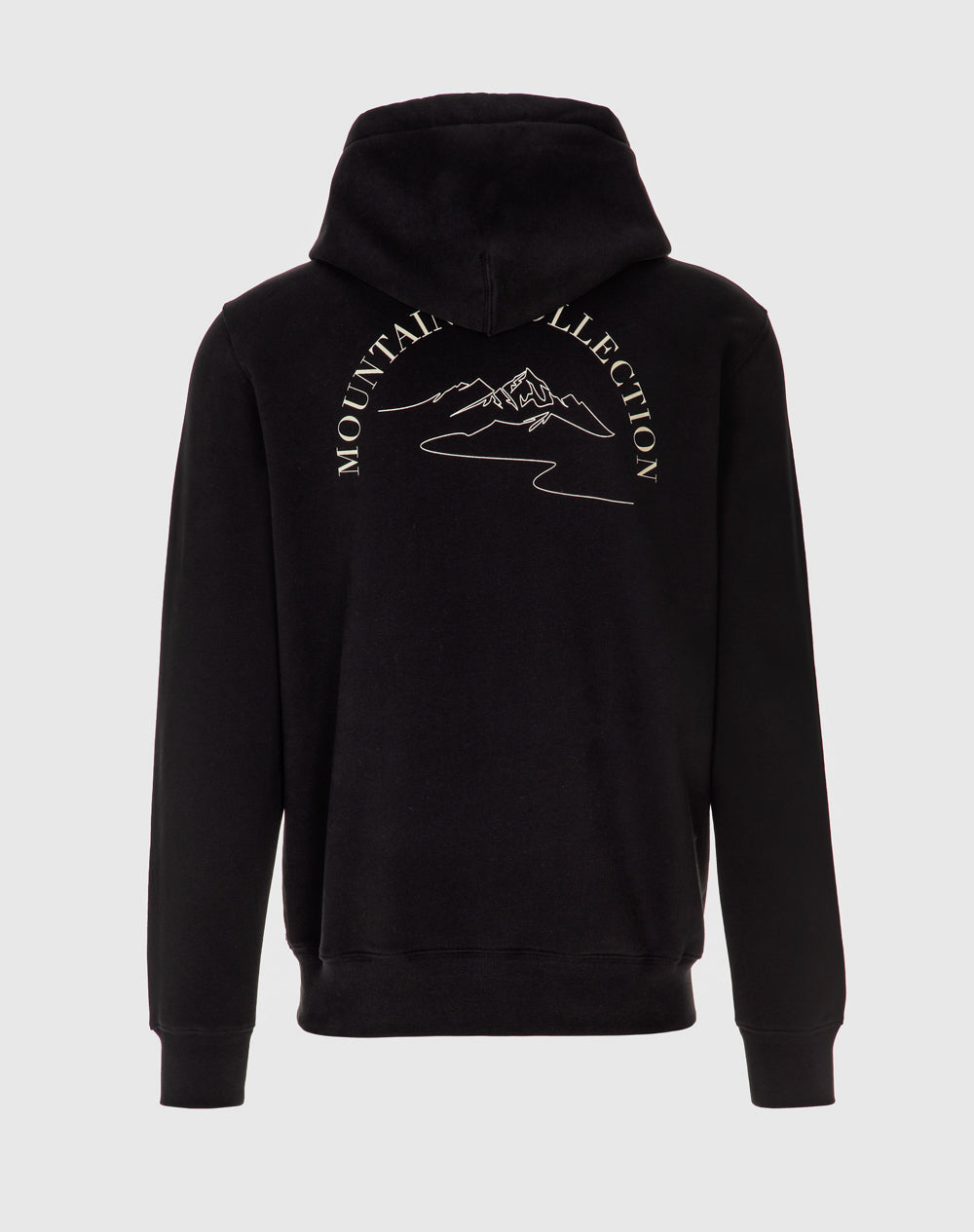 Hoodie com capuz forrado na própria malha. Cordões largos para ajuste do capuz. Encaixes laterais com bolsos incorporados. Bordado JEF na frente na cor de contraste. Desenho “Mountains collection” estampado nas costas na cor de contraste.