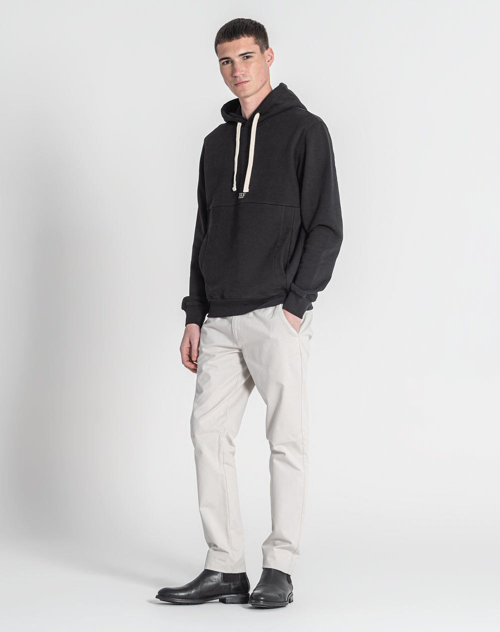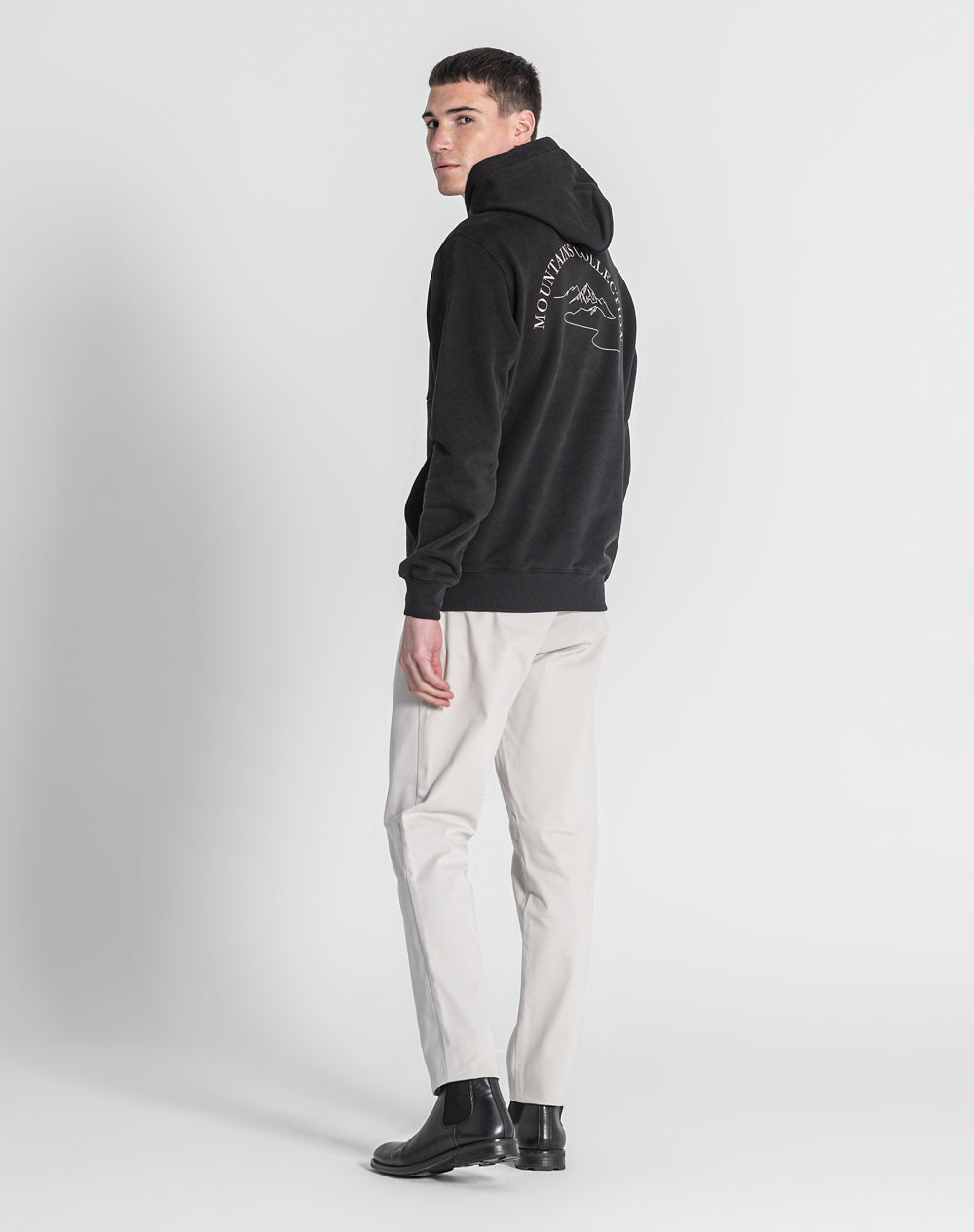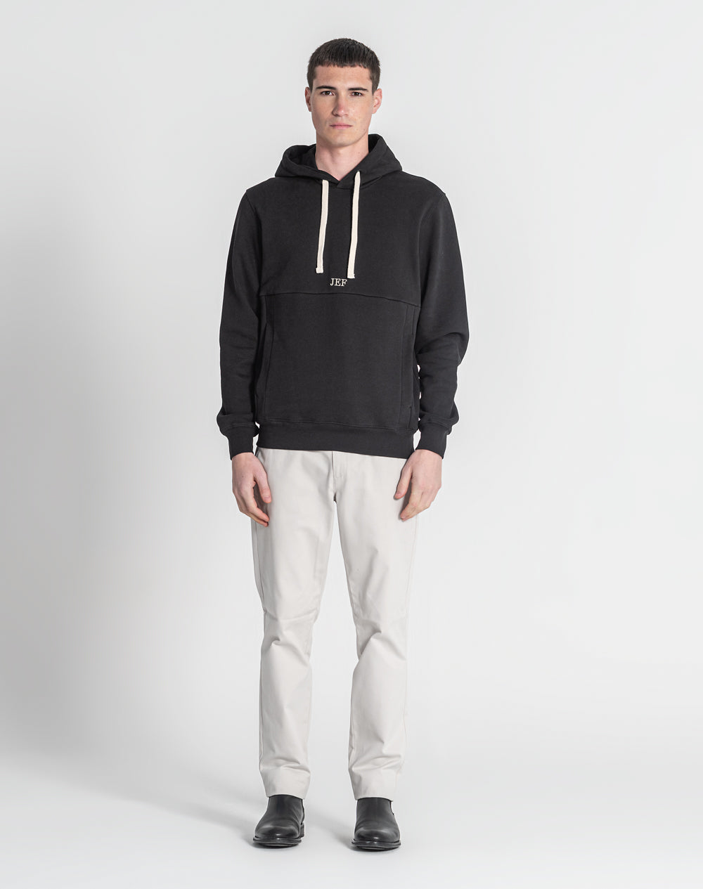 Hoodie com capuz forrado na própria malha. Cordões largos para ajuste do capuz. Encaixes laterais com bolsos incorporados. Bordado JEF na frente na cor de contraste. Desenho “Mountains collection” estampado nas costas na cor de contraste.
