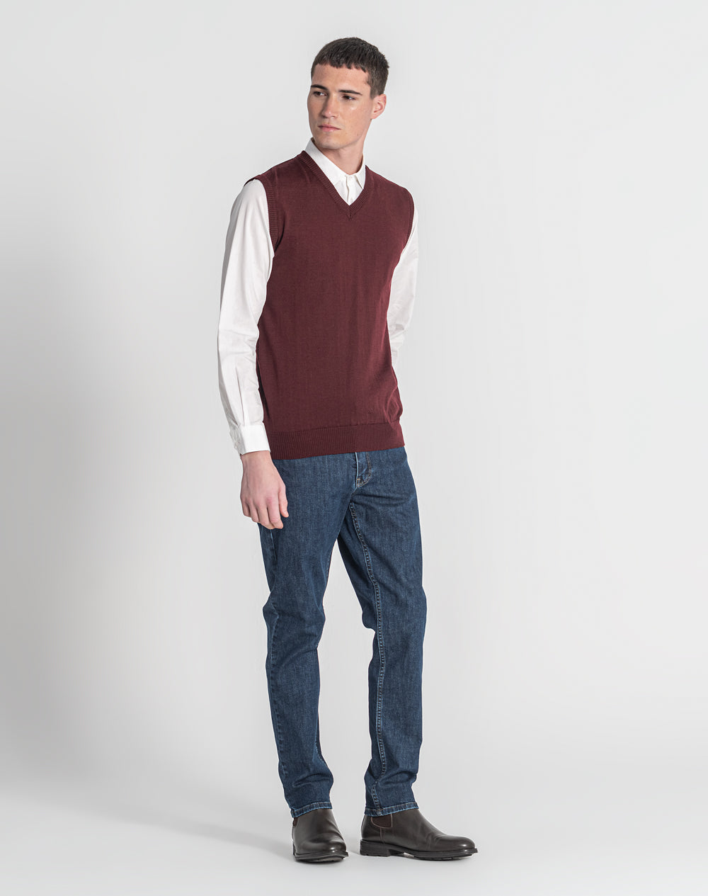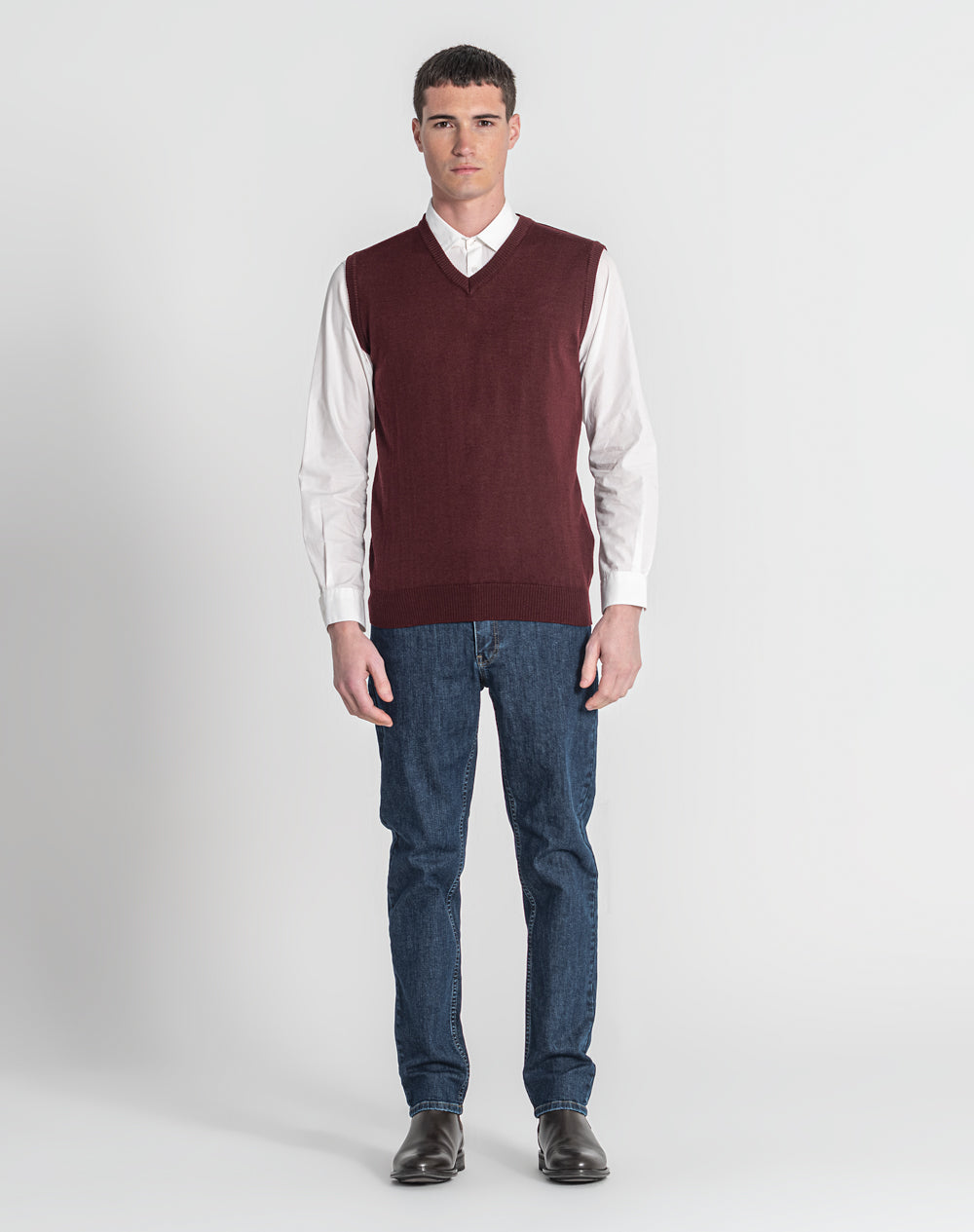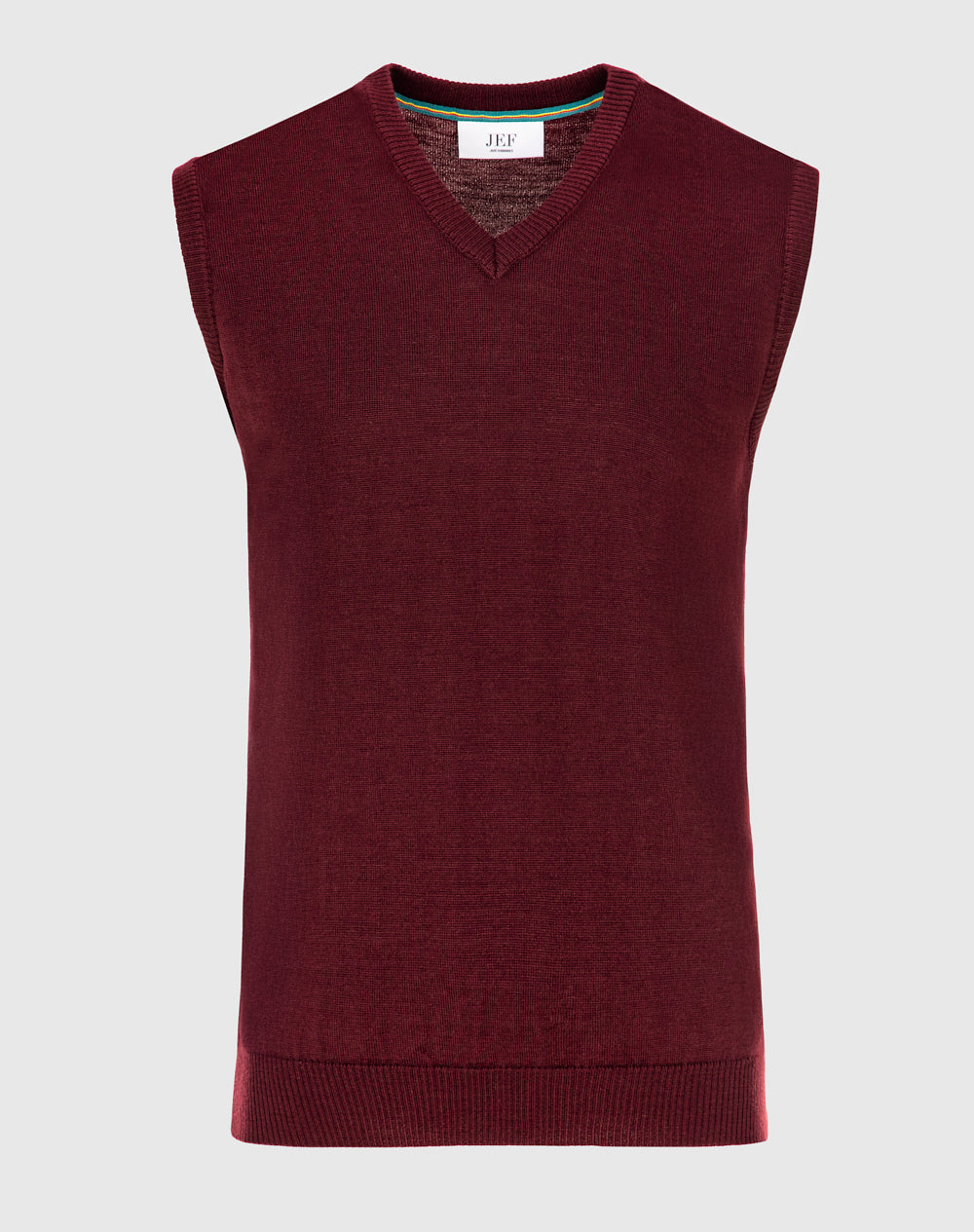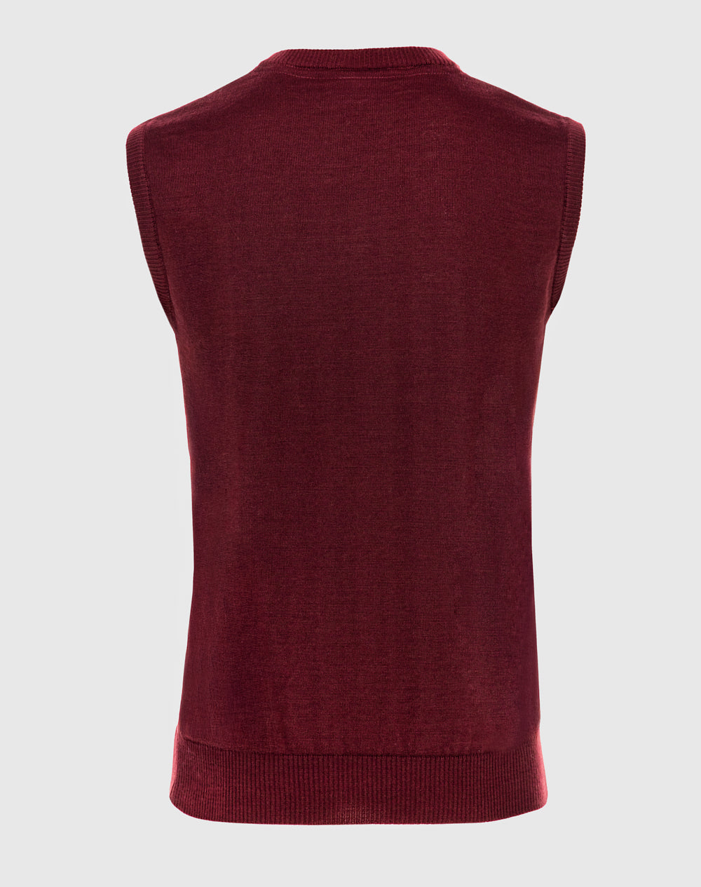 Colete em malha tricotada 100% lã merino. Decote em V. Logótipo da marca através da técnica bordado em ponto cadeia à cor da peça. Tapa-costuras com cores da marca.