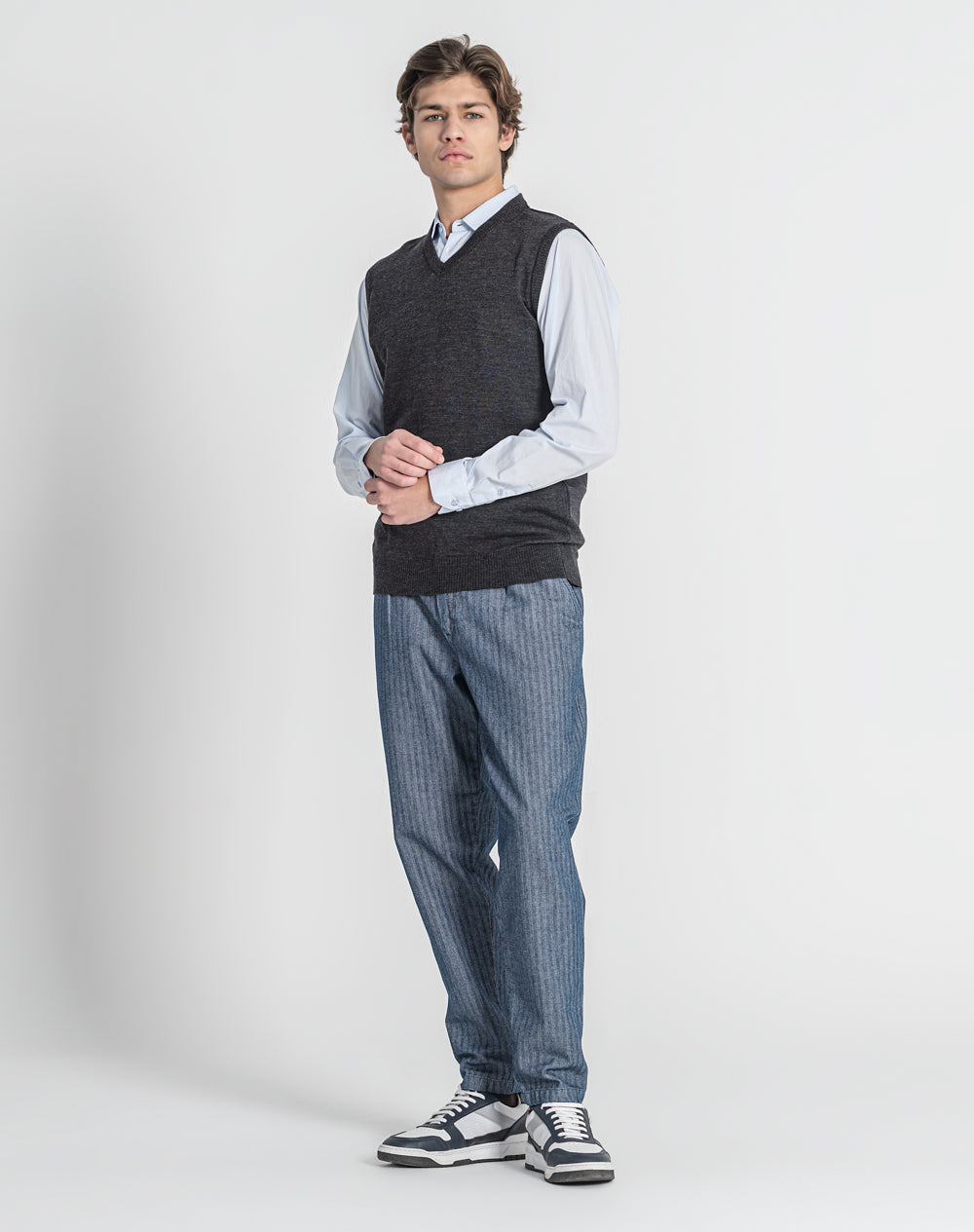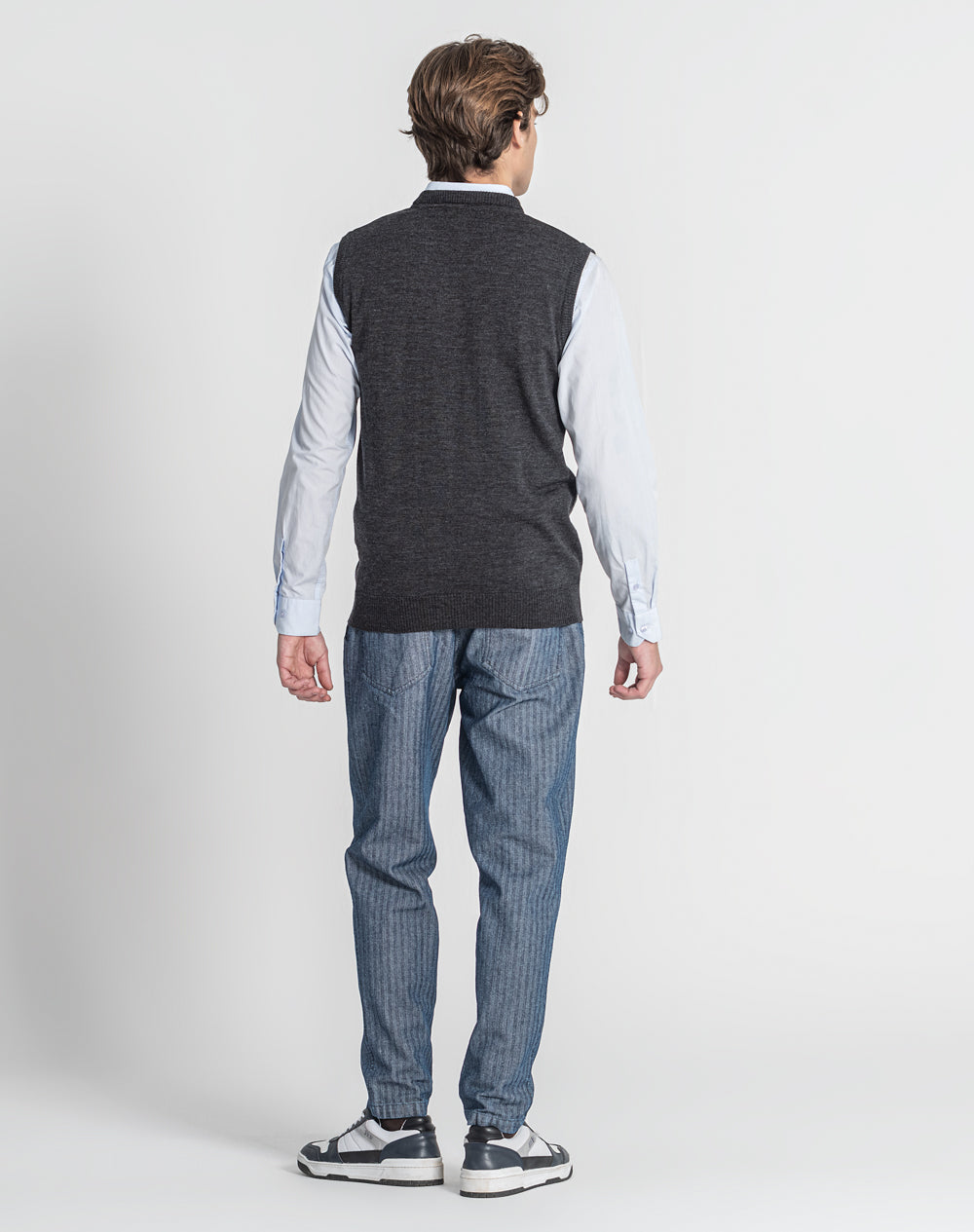 Colete em malha tricotada 100% lã merino. Decote em V. Logótipo da marca através da técnica bordado em ponto cadeia à cor da peça. Tapa-costuras com cores da marca.