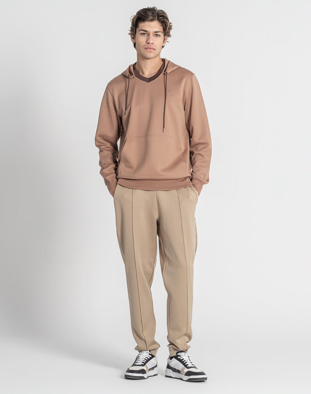 Hoodie com capuz e decote em V incorporado. Cordões para melhor ajuste em contraste. Bolso canguru. Logótipo da marca bordado à cor da peça.