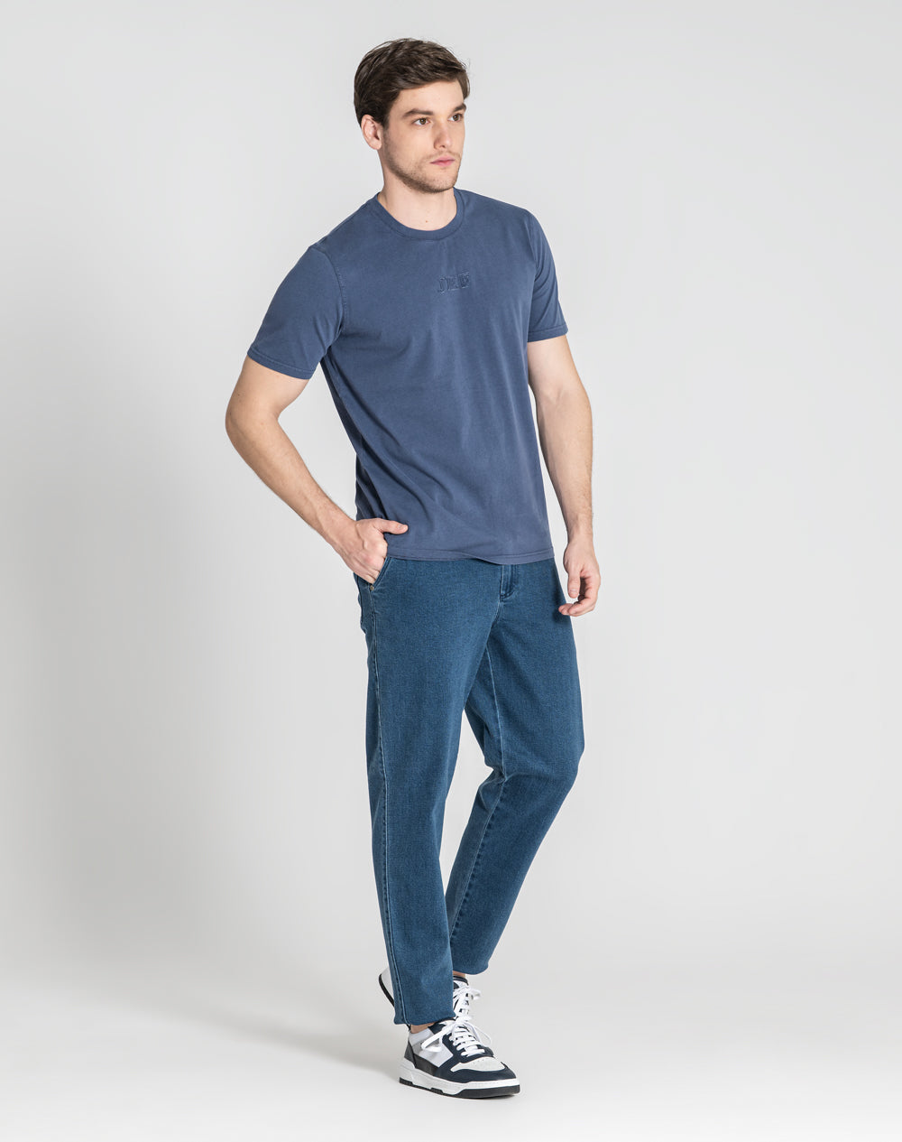 T-shirt em algodão orgânico com decote redondo. Acabamento de desgaste por toda a peça. Tapa-costuras na própria malha. Logótipo JEF recortado a laser e aplicado na peça.