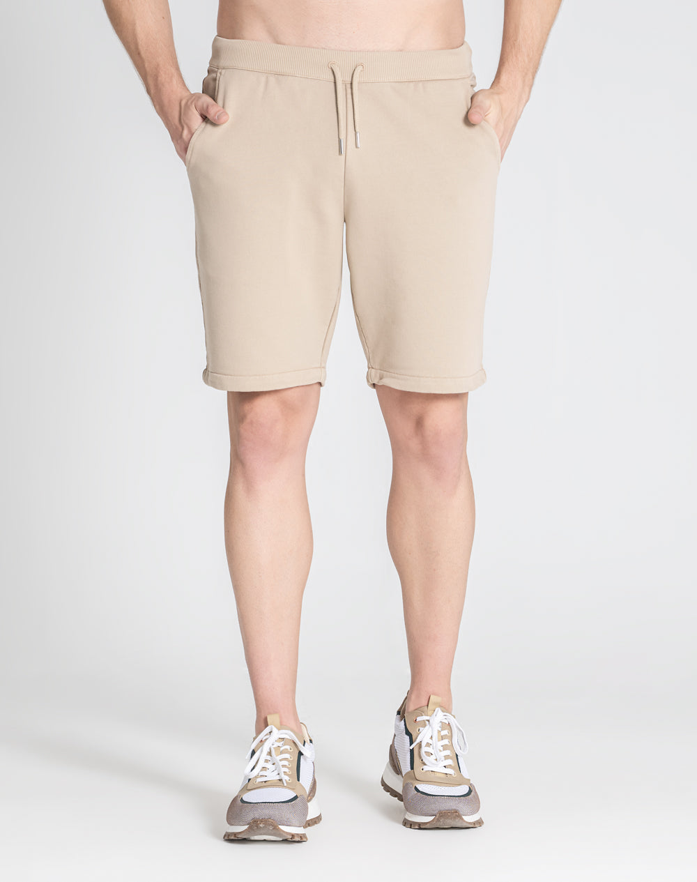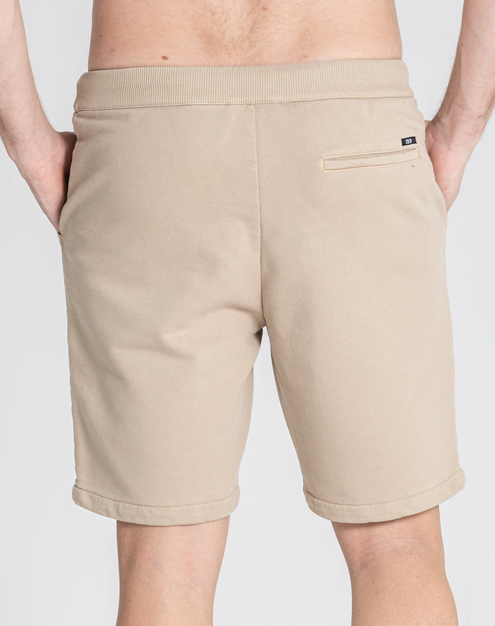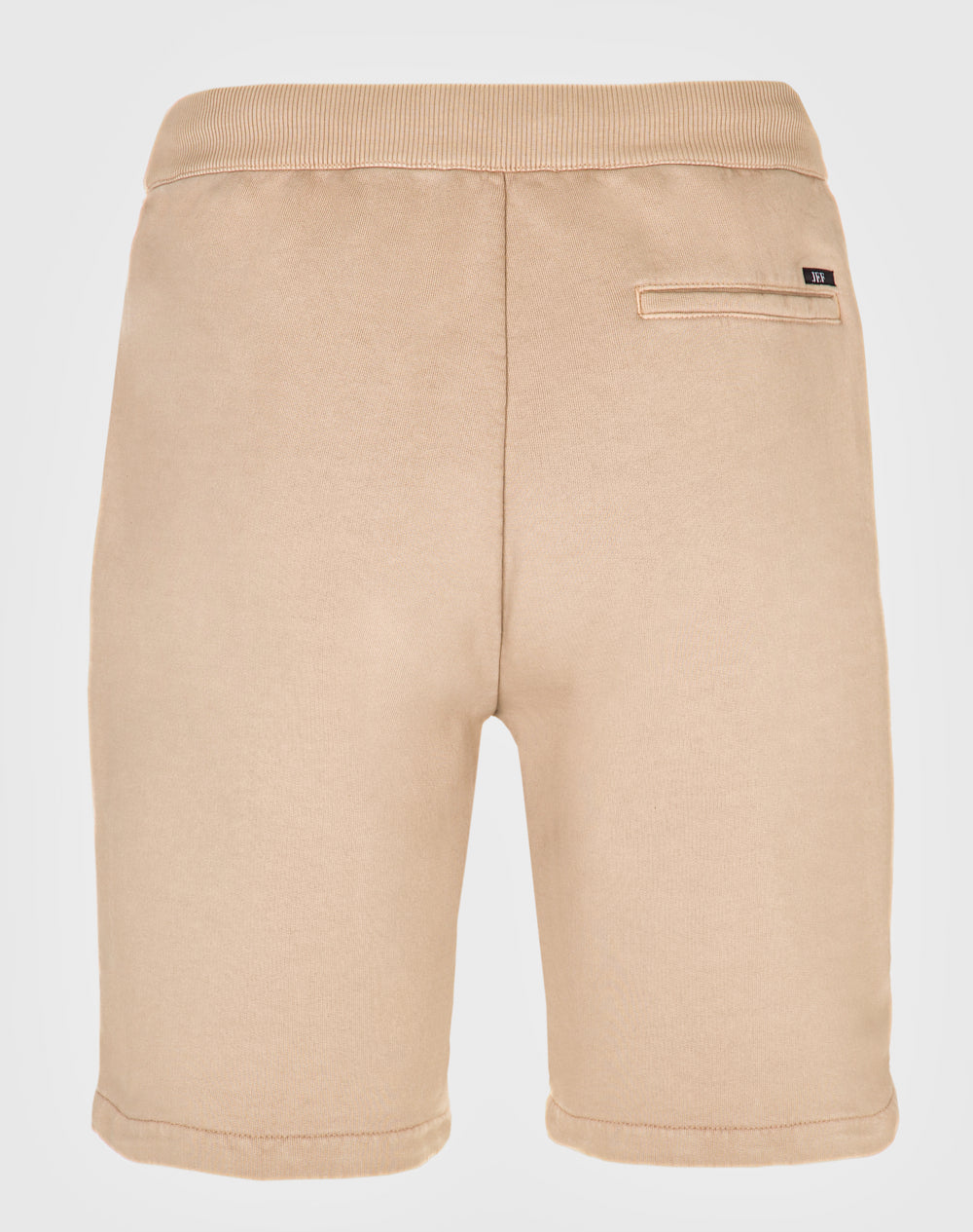 Calção com acabamento dye fast. Bolsos de faca arredondados na frente e bolso de vivo nas costas com etiqueta preta JEF na horizontal por cima do bolso. Cinto em rib com cordões para melhor ajuste.