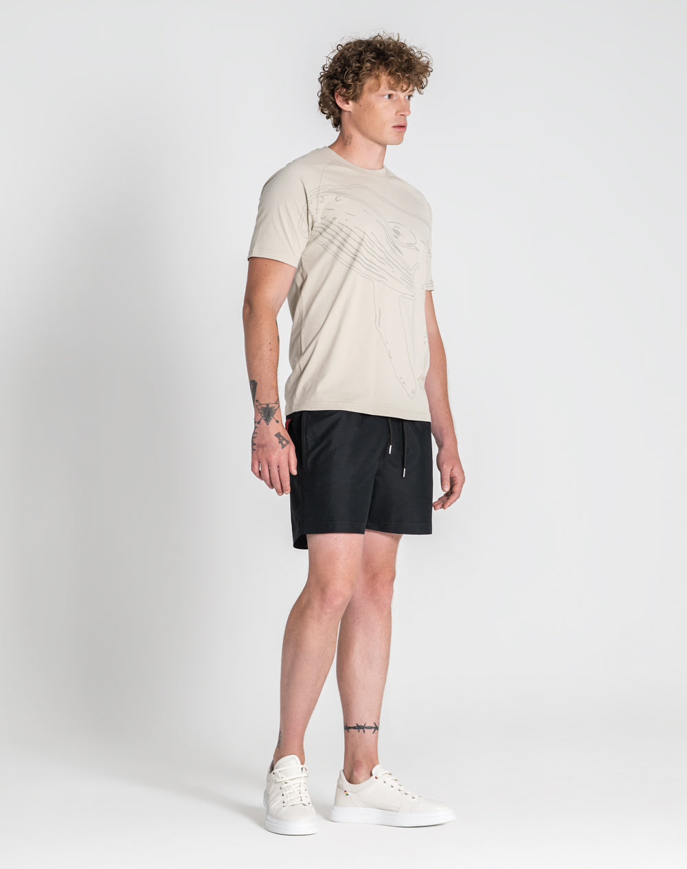 T-shirt em jersey orgânico com decote redondo. Manga raglan. Desenho de cachalote estampado na frente e mangas. Logótipo JEF bordado à cor da peça nas costas.
