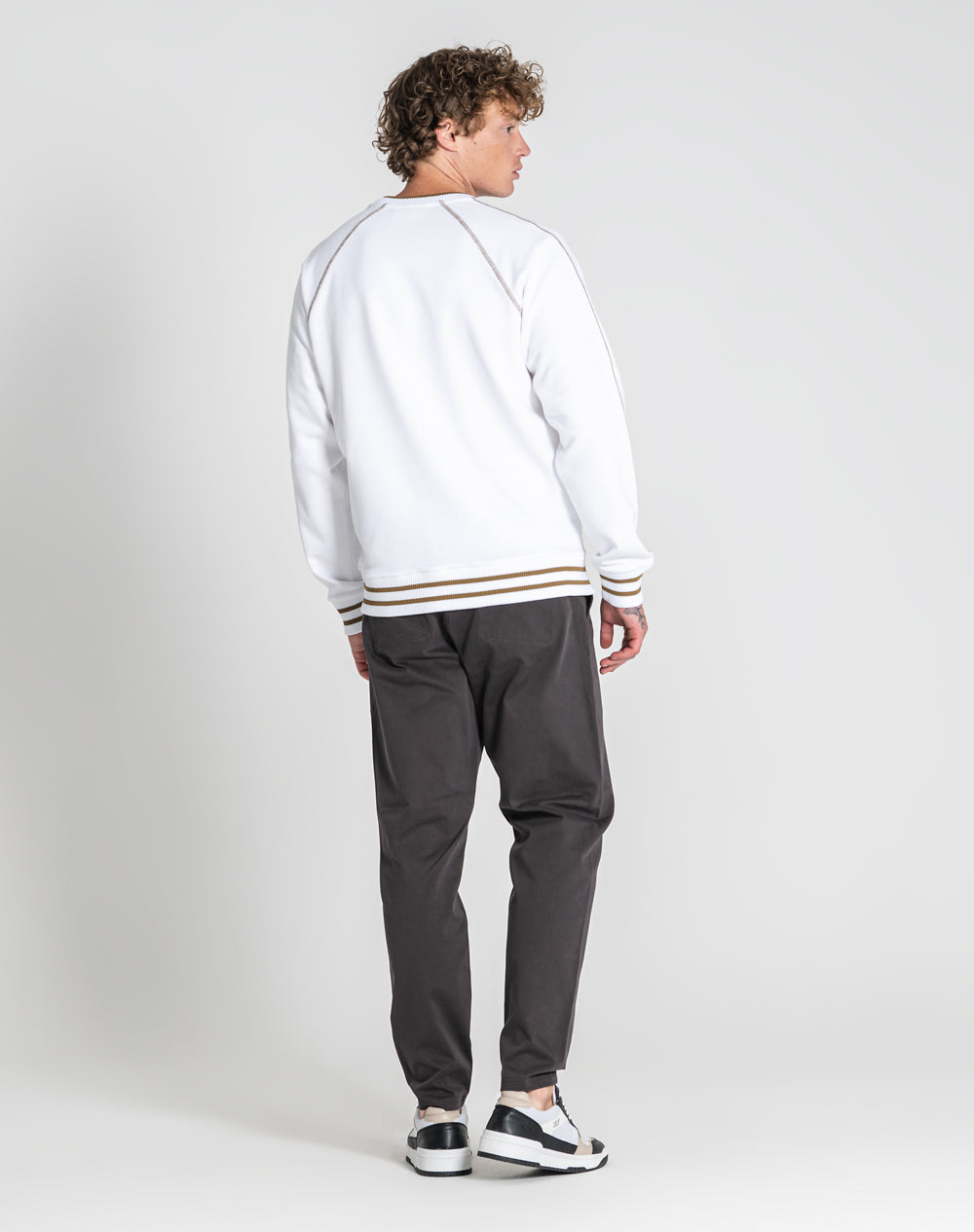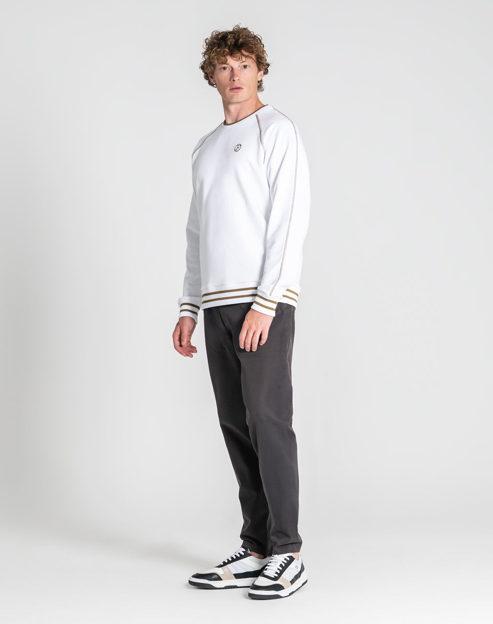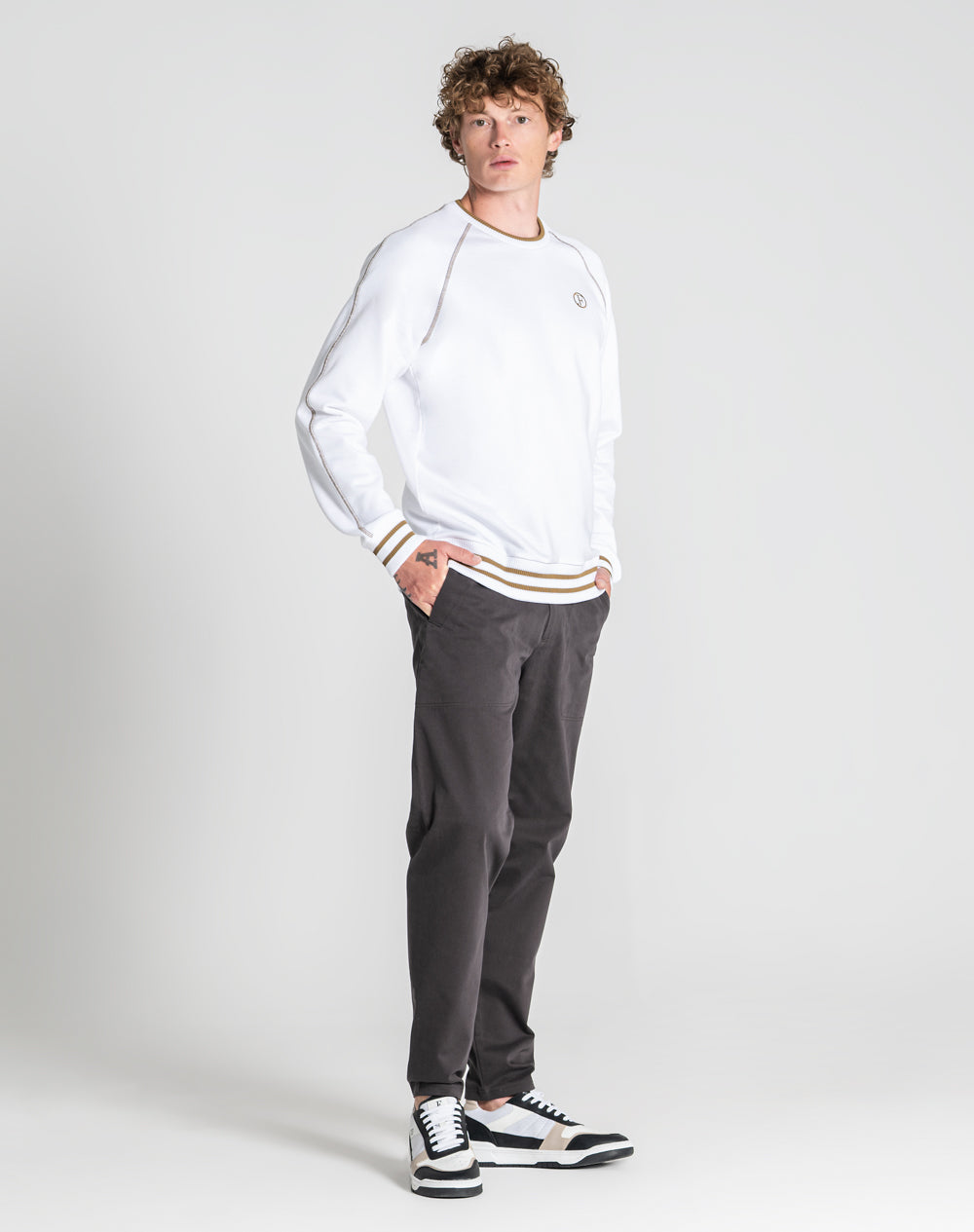 Sweat manga raglan e decote redondo. Logótipo da marca bordado na frente em cor de contraste. Cavas com recobrimento 3 agulhas em cor de contraste. Gola, punhos e cinto com riscas na cor de contraste.