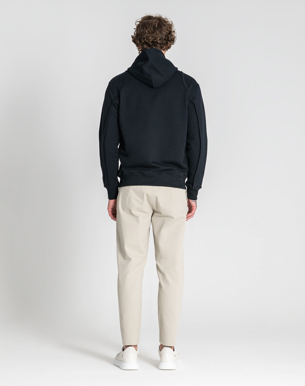 Hoodie com capuz e com cordões em contraste na cor branco. Interior do capuz na própria malha. Bolsos de vivo inclinados com fecho invisível. Vivos na própria malha a simular cavas e a descer pela manga. Logótipo da marca na frente bordado à cor da peça.
