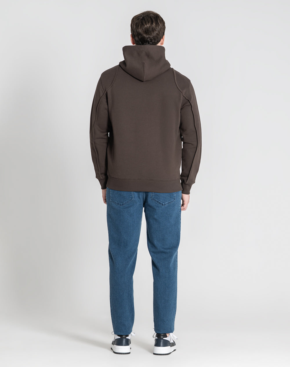 Hoodie com capuz e com cordões em contraste na cor branco. Interior do capuz na própria malha. Bolsos de vivo inclinados com fecho invisível. Vivos na própria malha a simular cavas e a descer pela manga. Logótipo da marca na frente bordado à cor da peça.