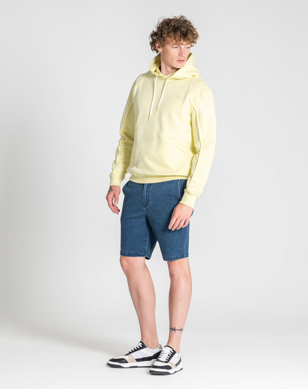 Hoodie com capuz e com cordões em contraste na cor branco. Interior do capuz na própria malha. Bolsos de vivo inclinados com fecho invisível. Vivos na própria malha a simular cavas e a descer pela manga. Logótipo da marca na frente bordado à cor da peça.