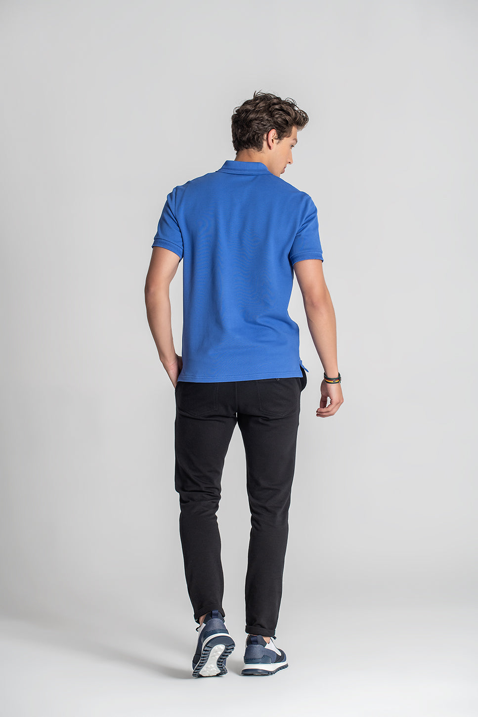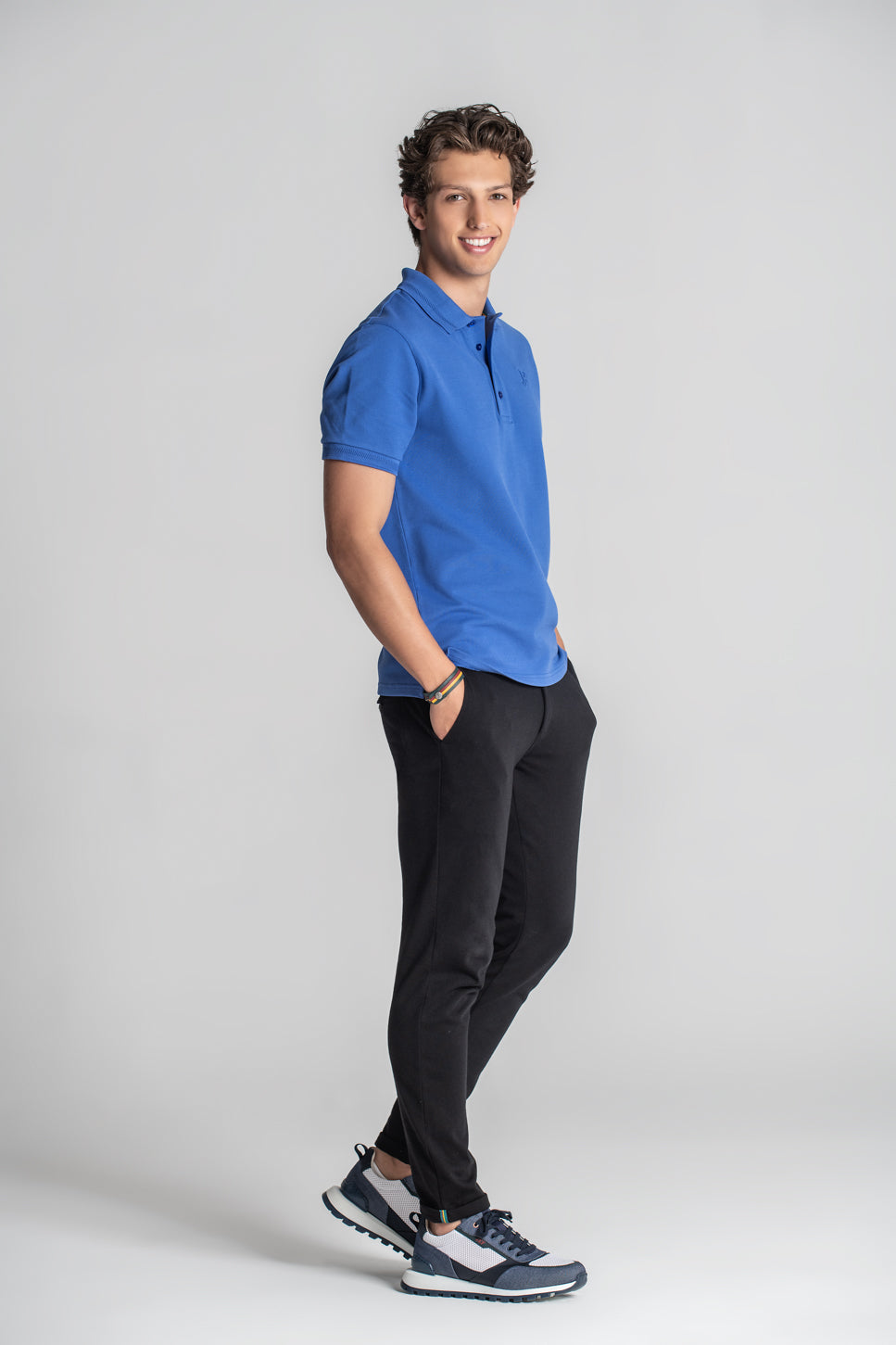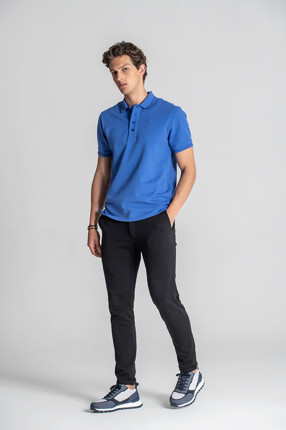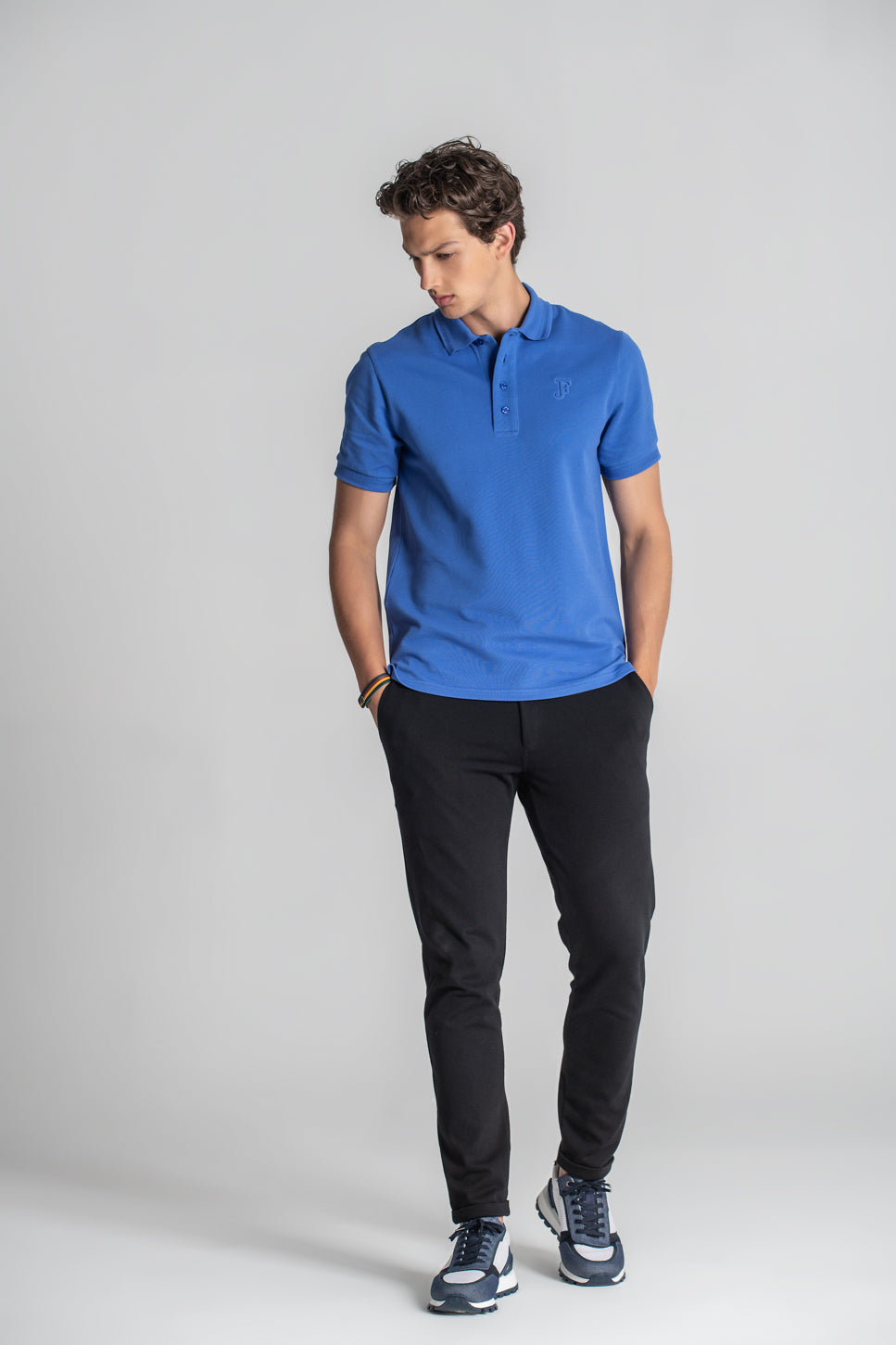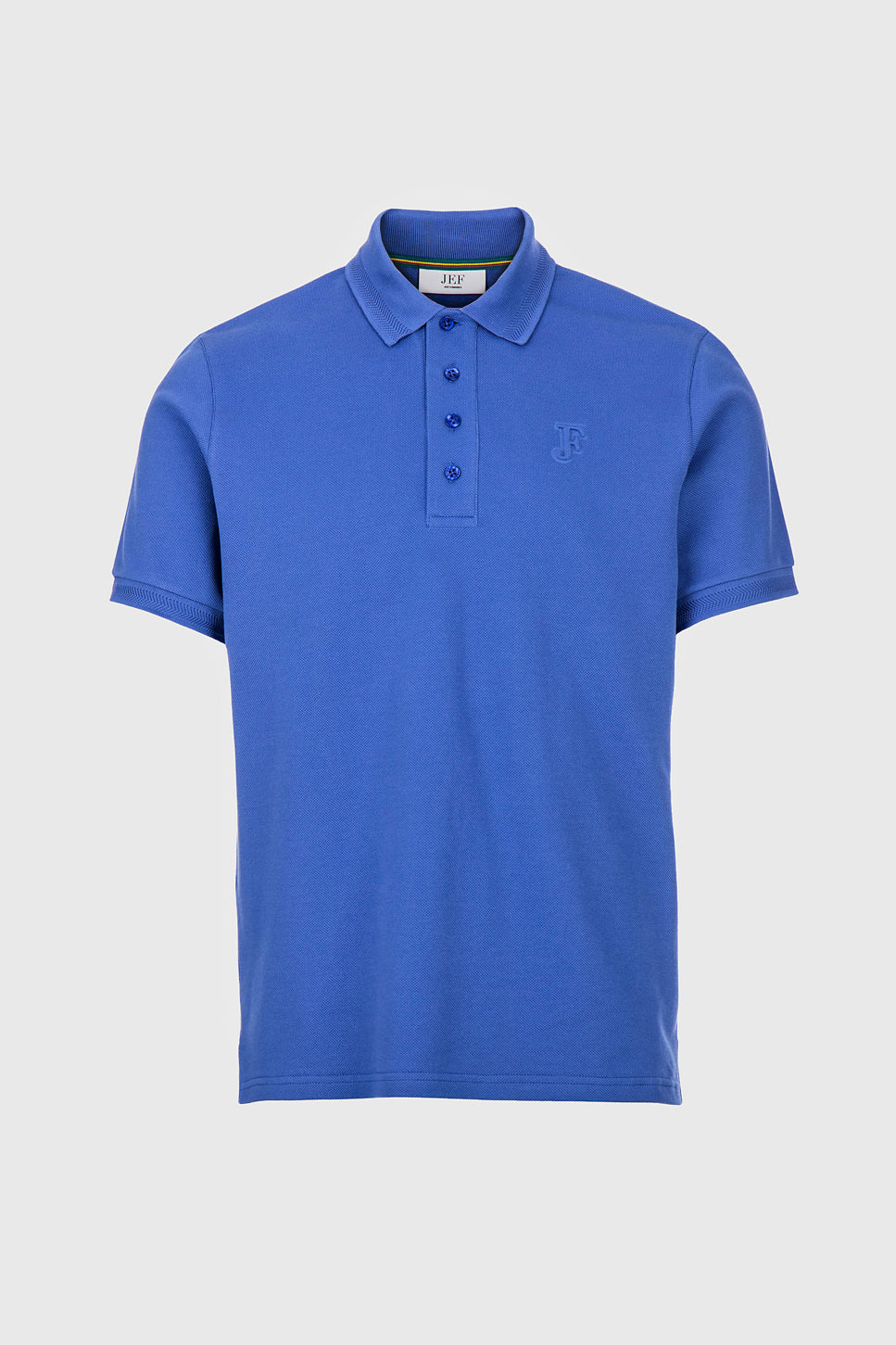 Polo com efeito espinhado nos punhos da manga e na gola. Plaquete larga e abotado por 4 botões no meio frente. Tapa-costuras no interior da peça com cores da marca. Logótipo com efeito acolchoado através da técnica embossed 3D. Pequenas rachas nas laterais.