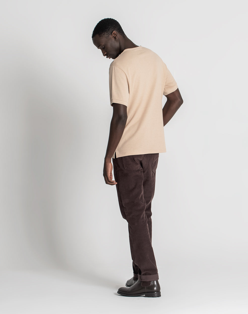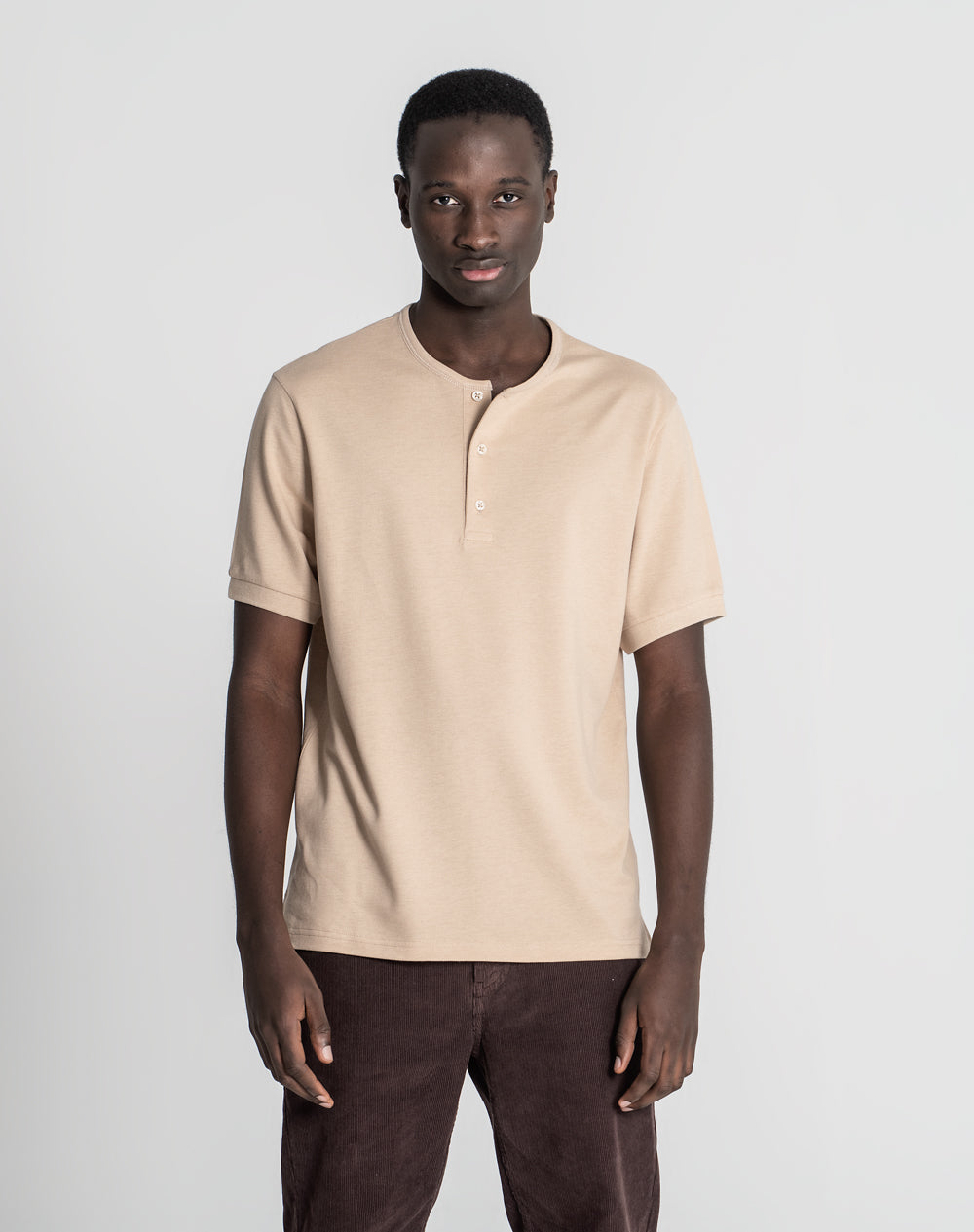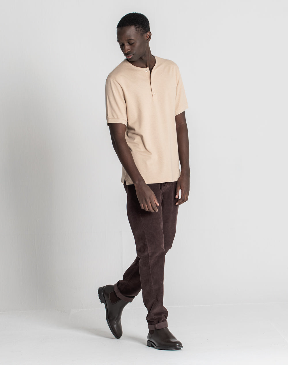 Polo manga curta com gola mandarim. Abertura no meio-frente através 3 botões. Gola com recobrimento. Pequenas rachas nas laterais.