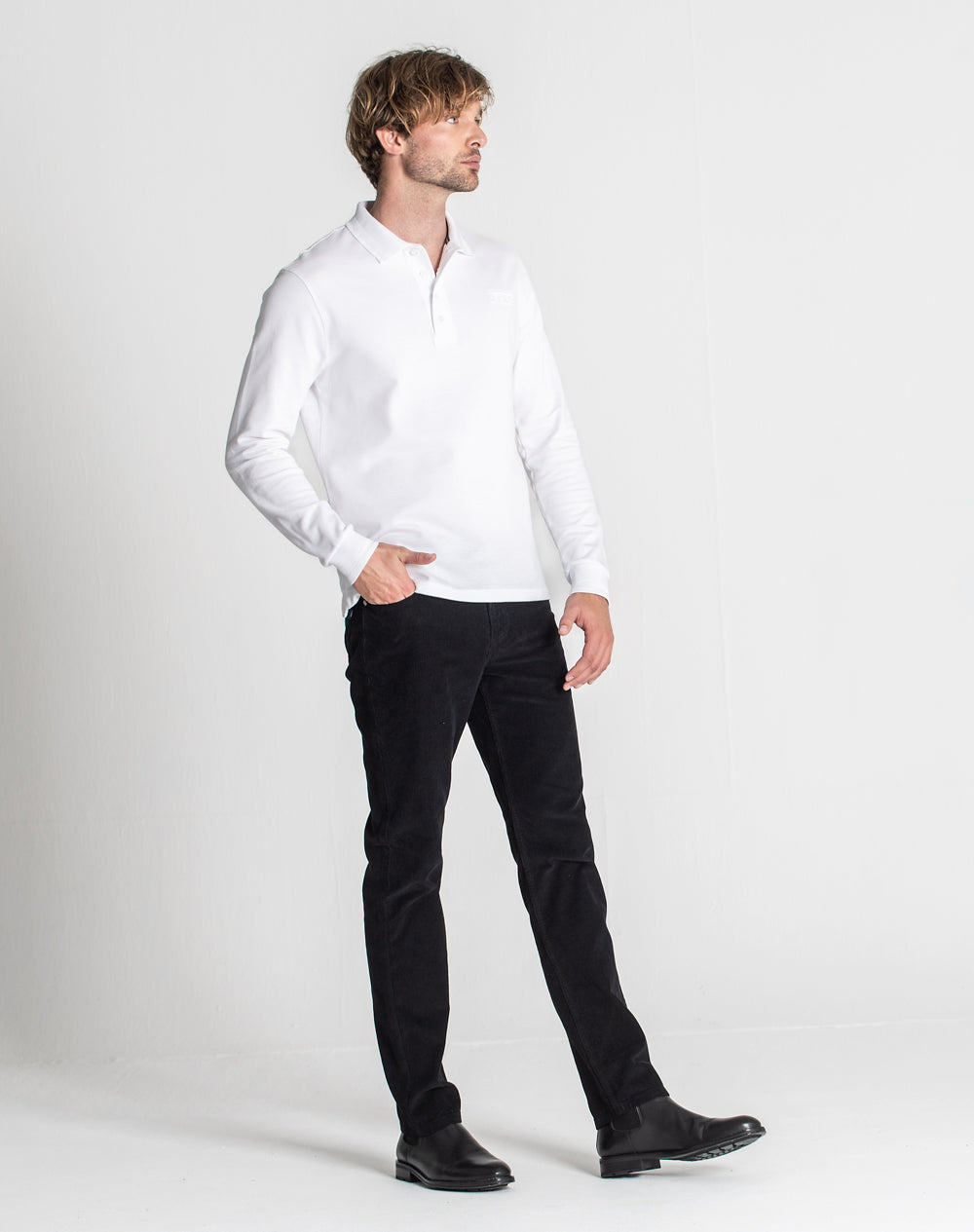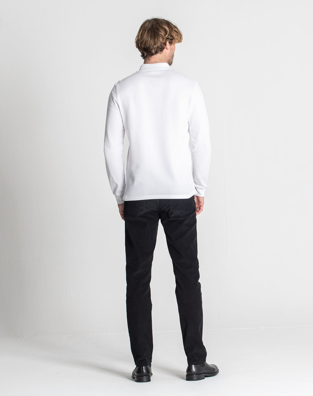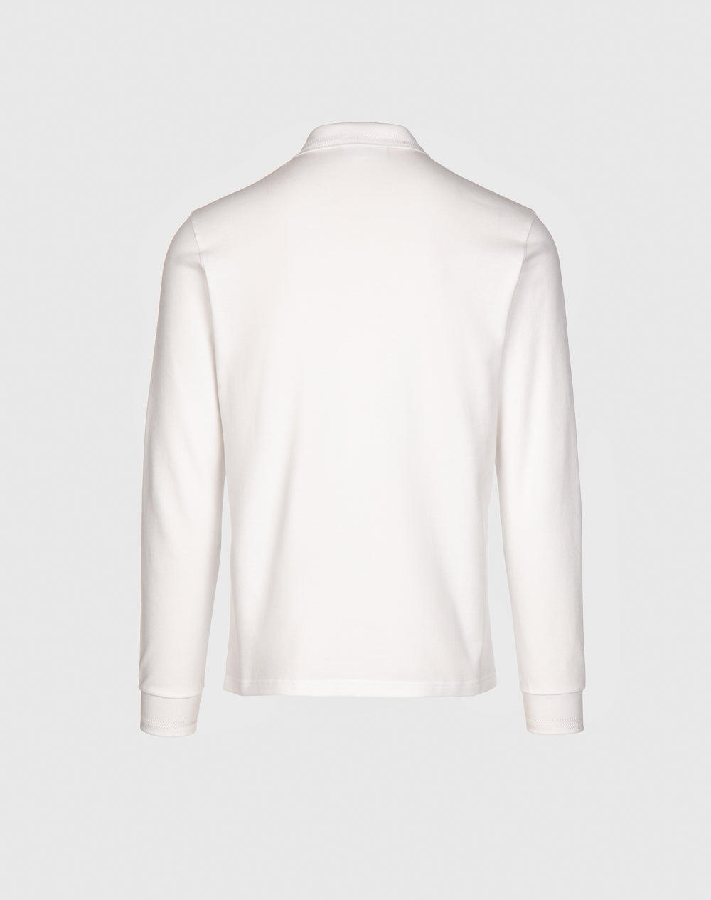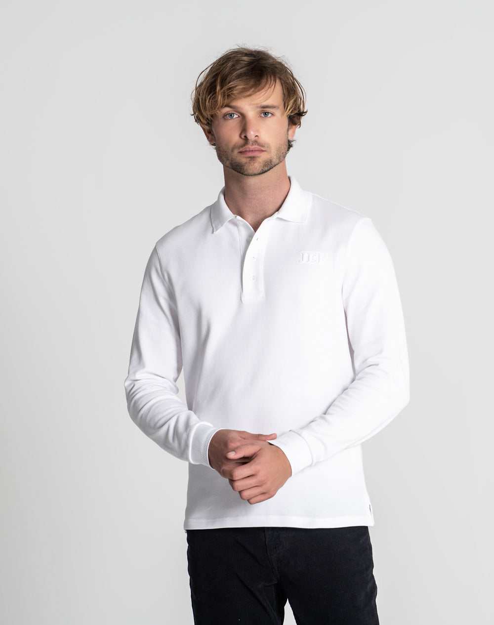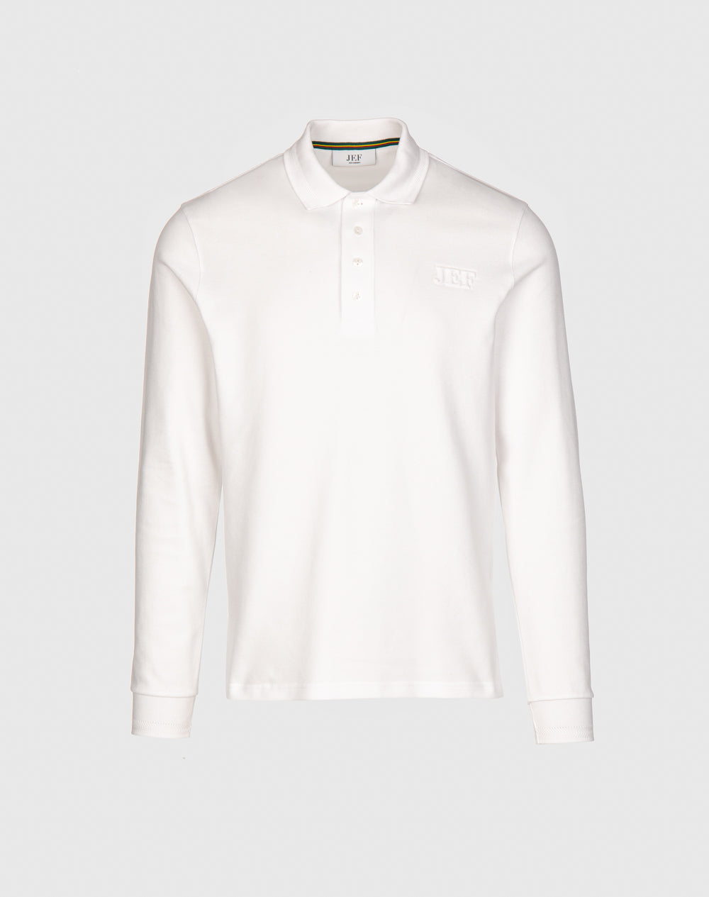 Polo manga comprida com gola e punhos em tira-reta espinhada. Abotoado por 4 botões no meio frente, mas apenas 1 botão visível. Plaquete larga no meio frente. Tapa-costuras no interior da peça com cores da marca. Logótipo JEF através da técnica embossed 3D. Pequenas rachas nas laterais.