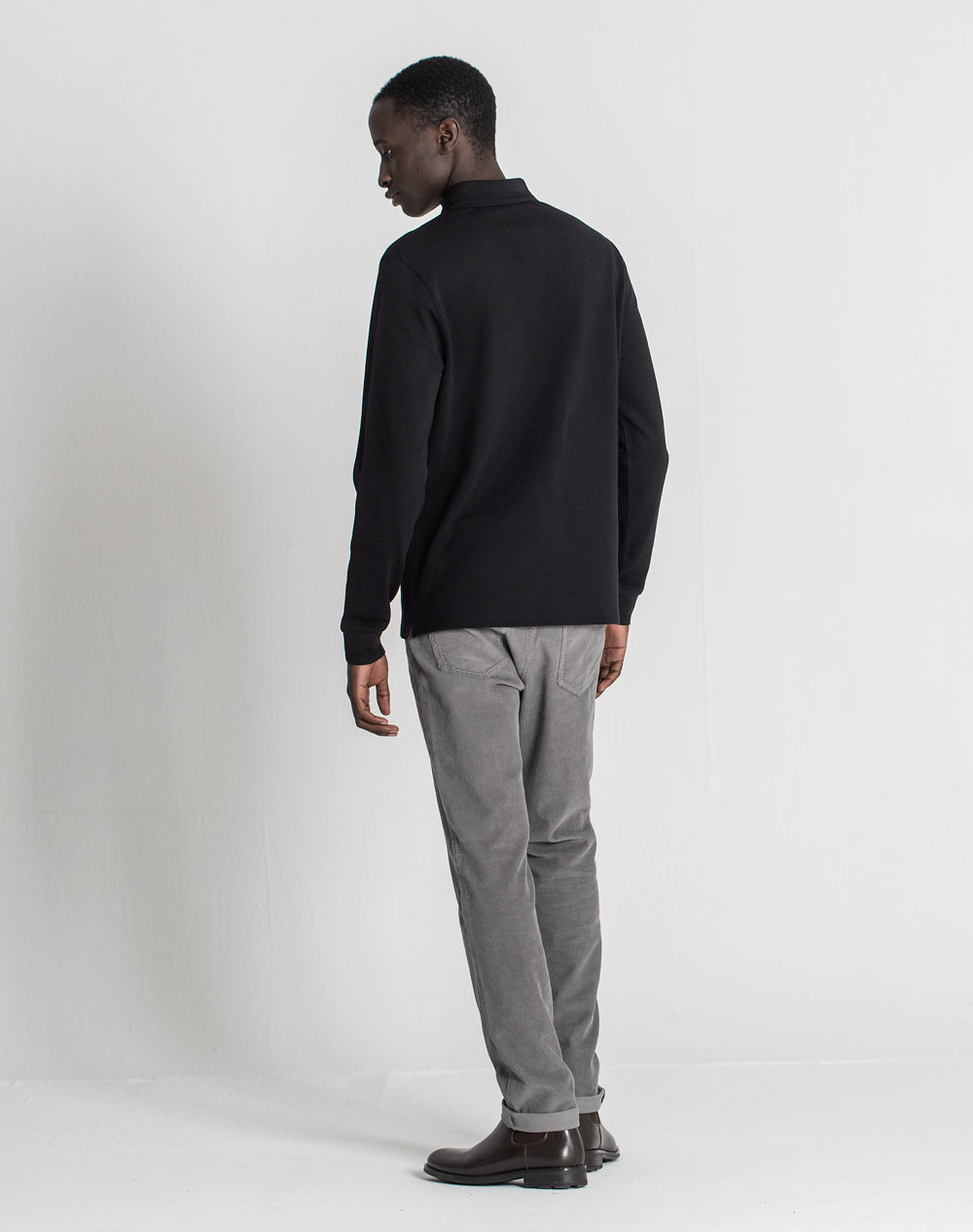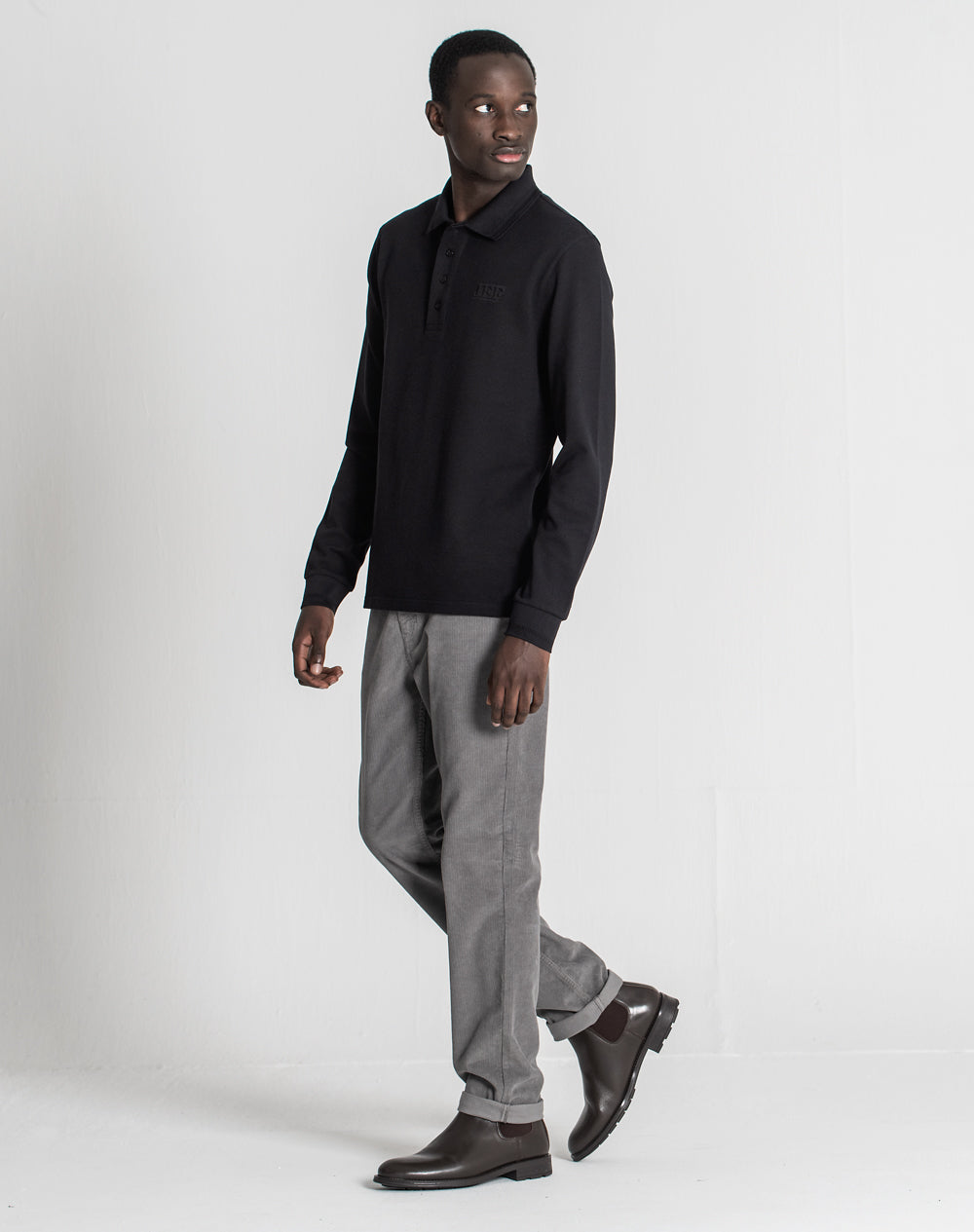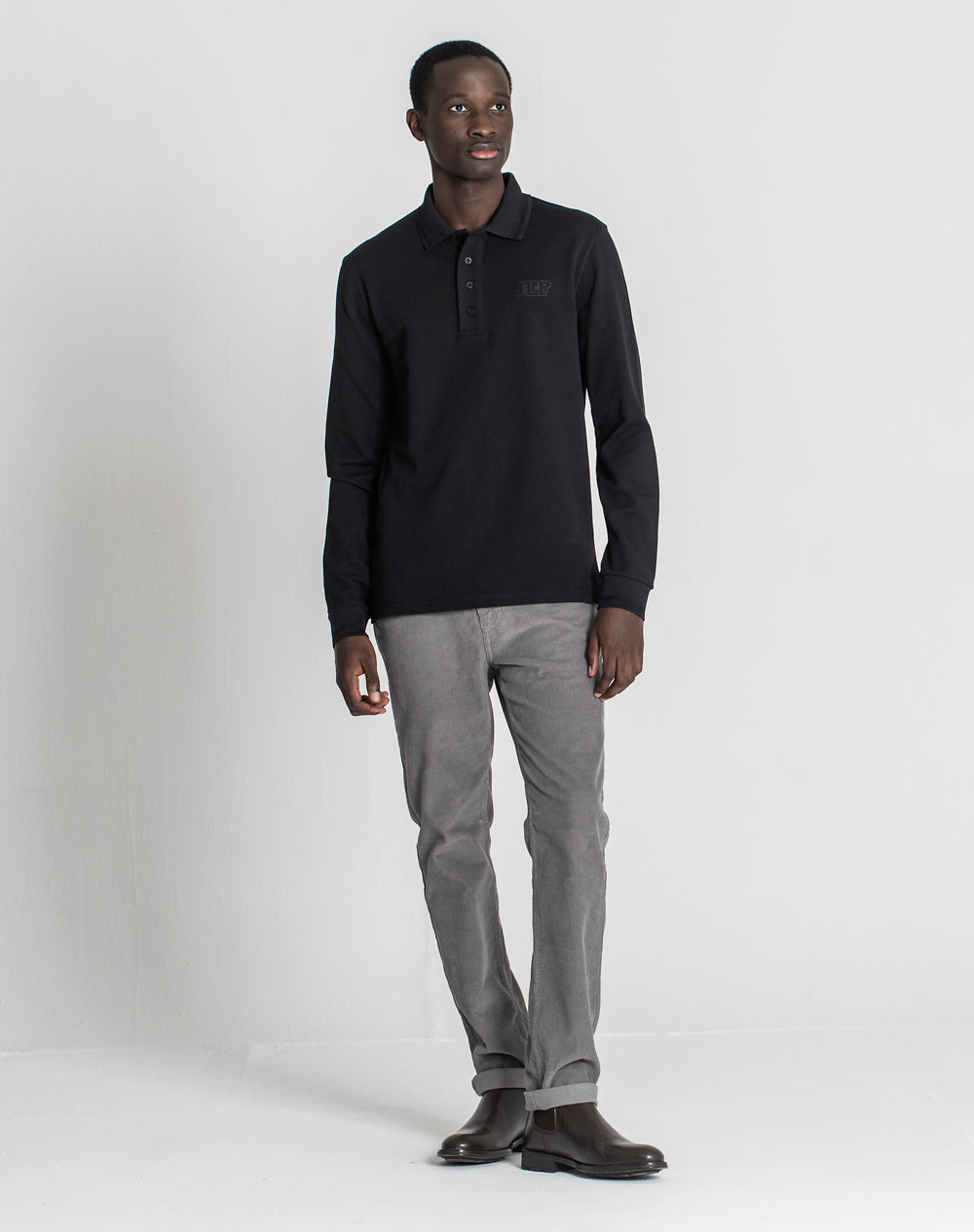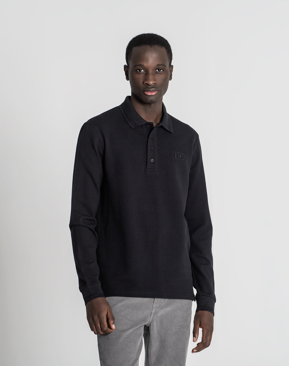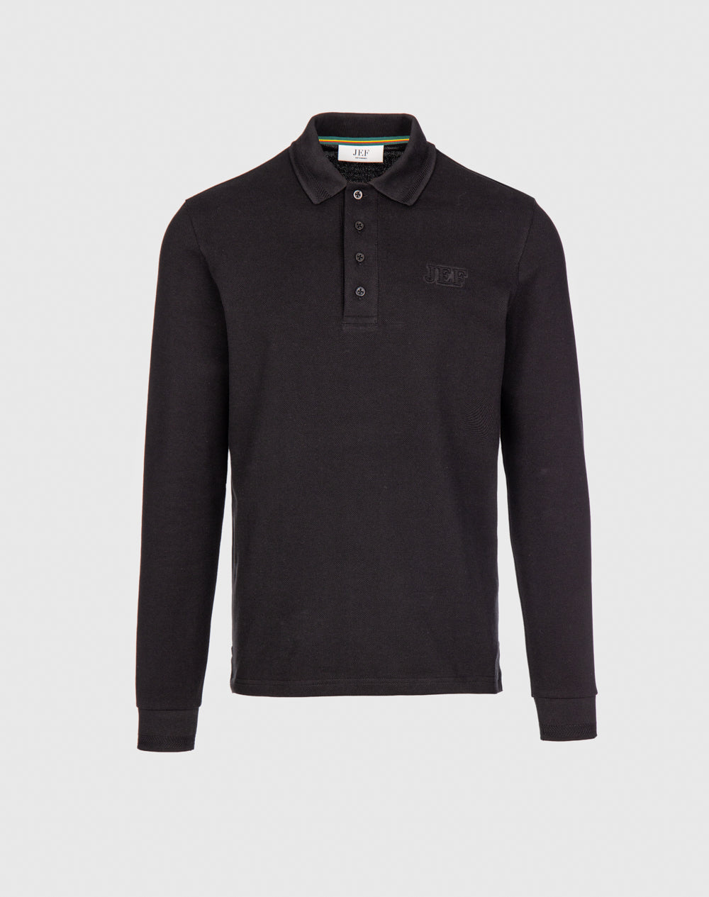 Polo manga comprida com gola e punhos em tira-reta espinhada. Abotoado por 4 botões no meio frente, mas apenas 1 botão visível. Plaquete larga no meio frente. Tapa-costuras no interior da peça com cores da marca. Logótipo JEF através da técnica embossed 3D. Pequenas rachas nas laterais.
