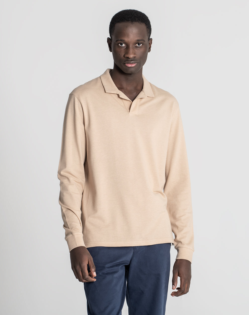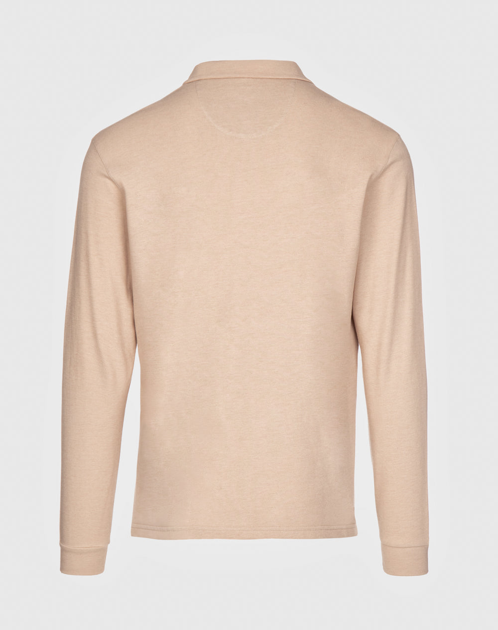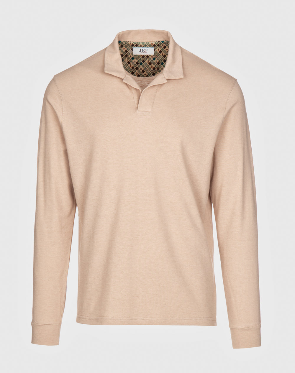 Polo manga comprida. Abertura no meio-frente através lapela, com botão à cor da peça. Meia-lua em tecido estampado com all-over alusivo ao conceito da coleção. Pequenas rachas nas laterais.