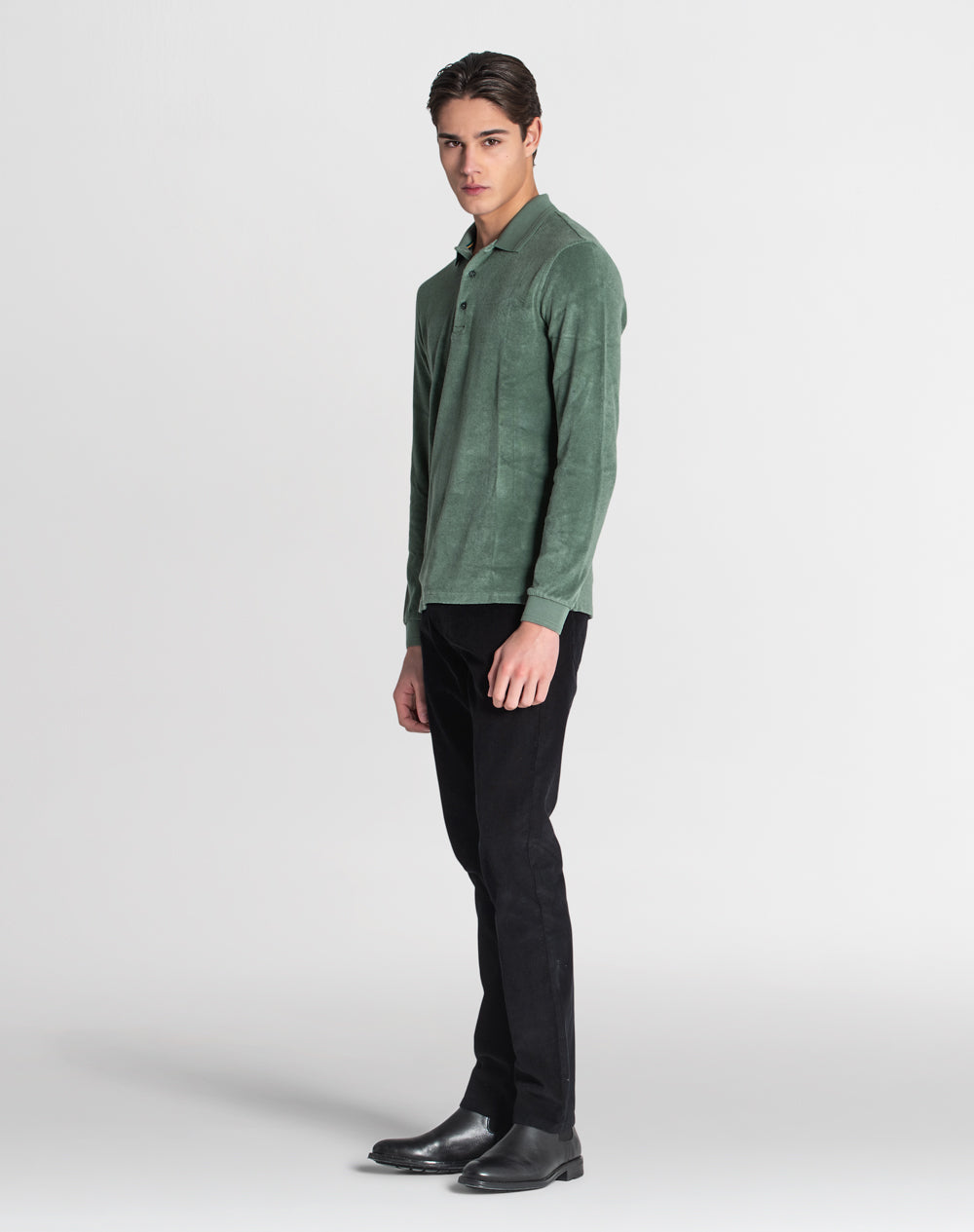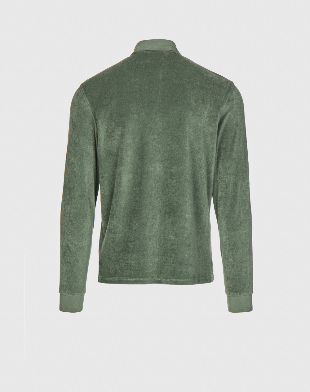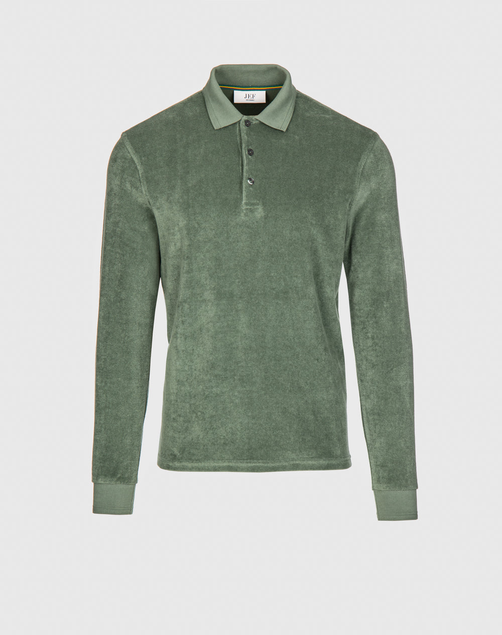 Polo de manga comprida em peluche. Abertura no meio-frente através botões. Tapa-costuras com as cores da marca. Pequenas rachas nas laterais. Gola e punhos com pormenor de relevo.