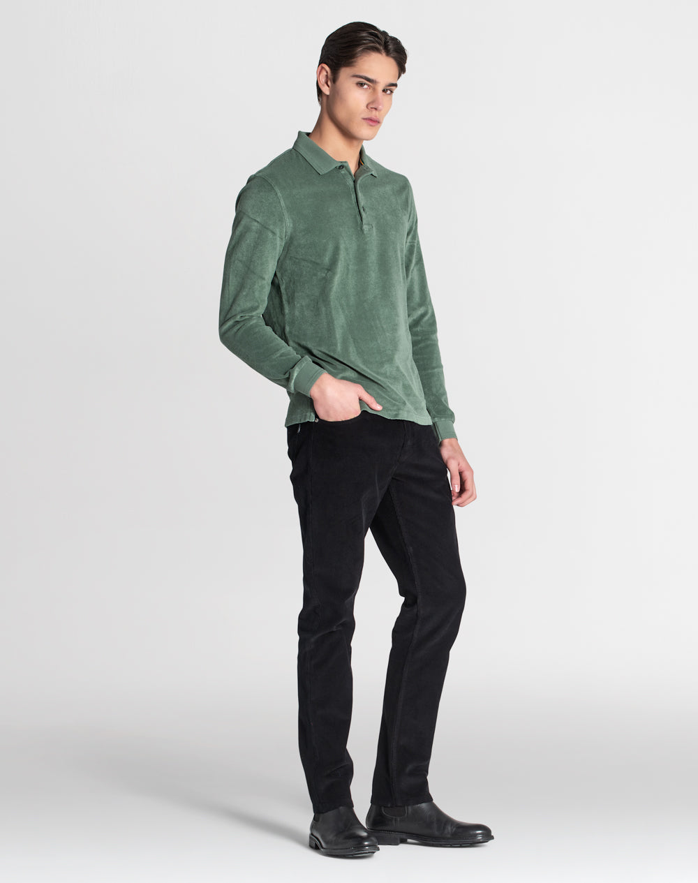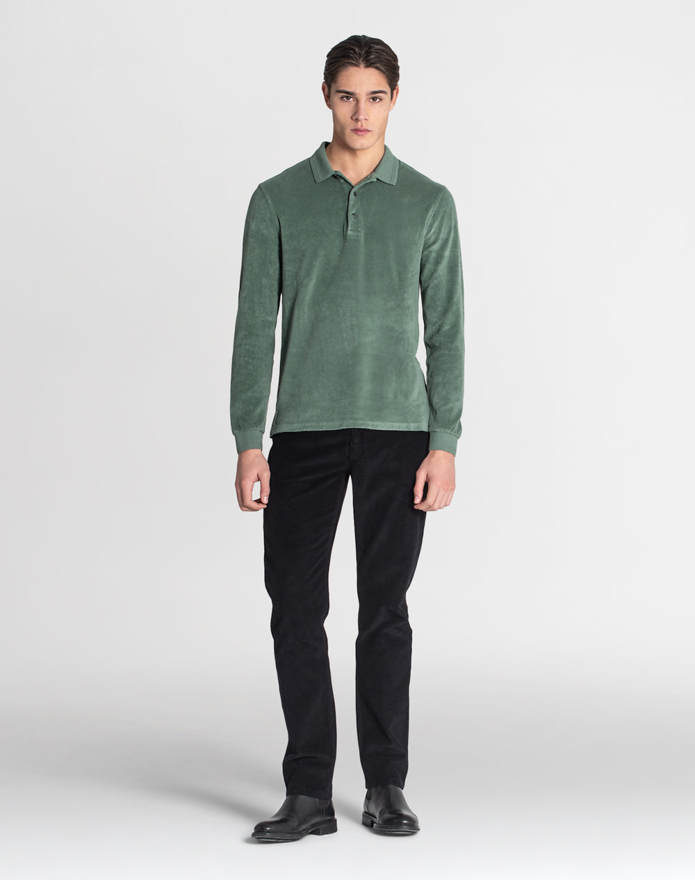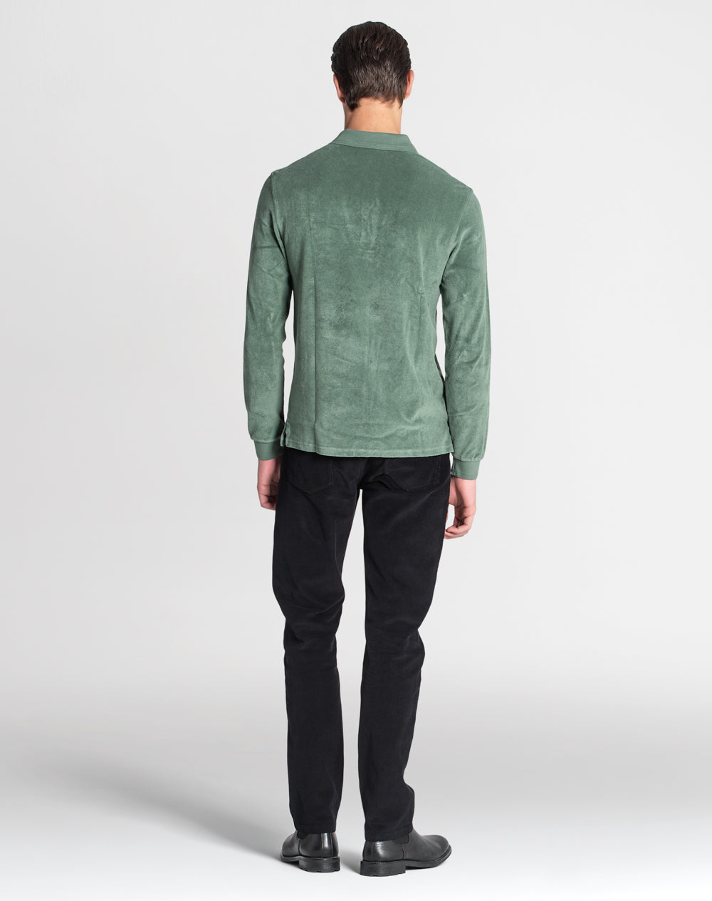 Polo de manga comprida em peluche. Abertura no meio-frente através botões. Tapa-costuras com as cores da marca. Pequenas rachas nas laterais. Gola e punhos com pormenor de relevo.